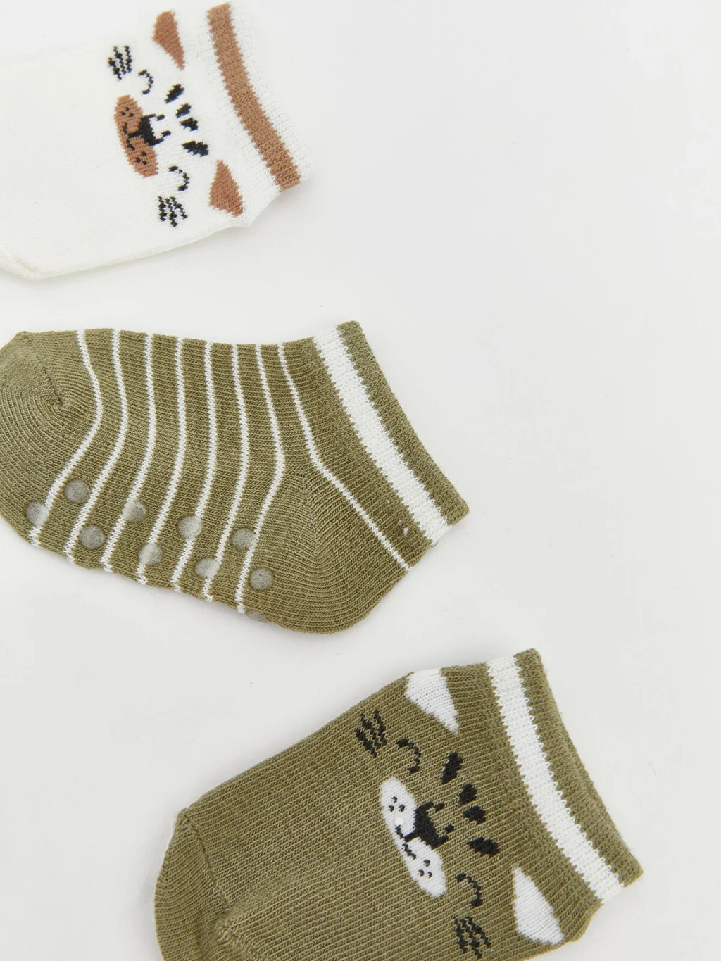 Erkek bebek için üretilen patik çorap, çizgili ve hayvan figürlü desenlere ve kaydırmaz tabana sahiptir.