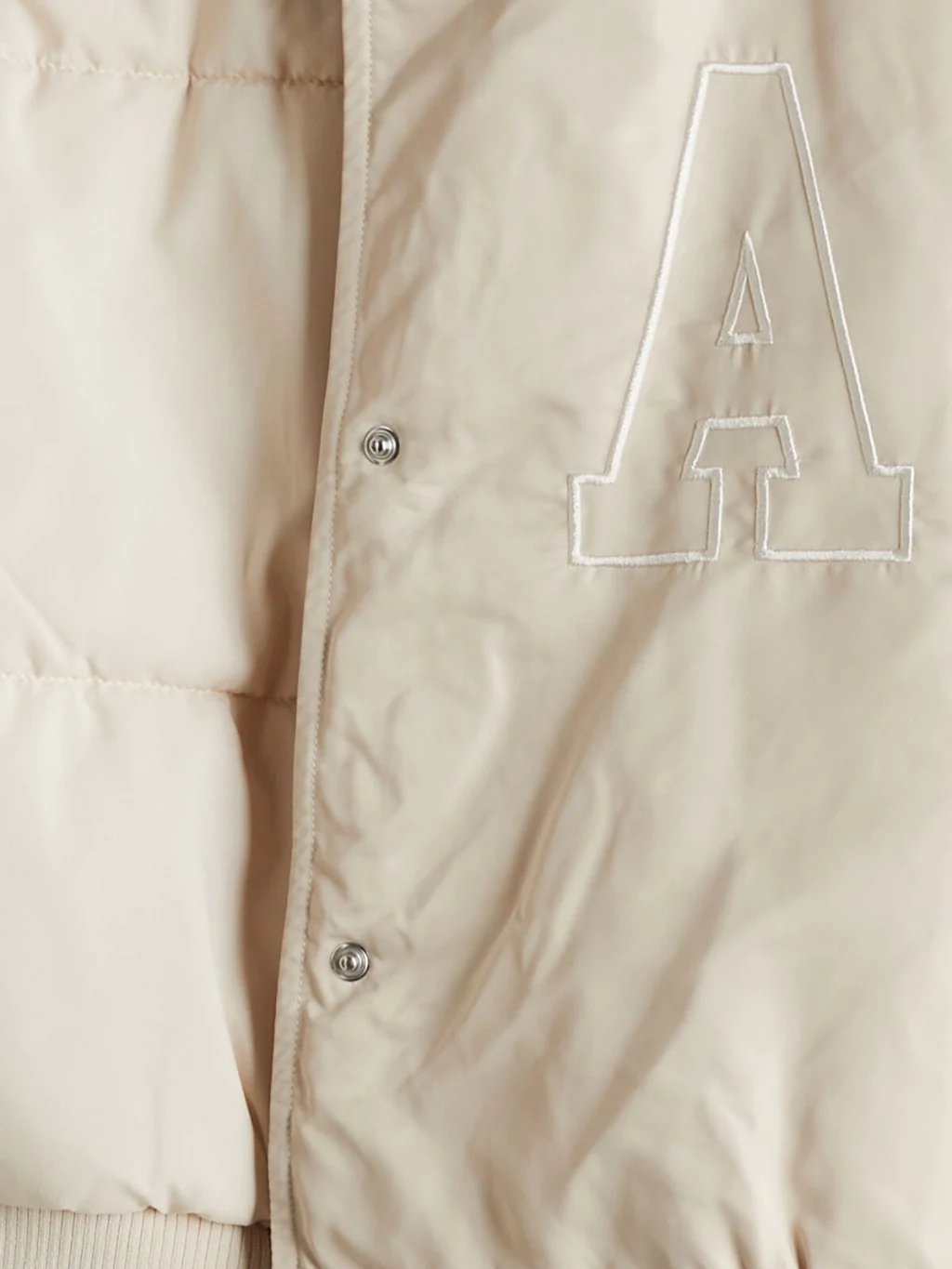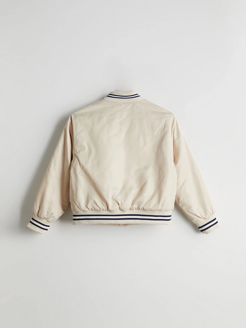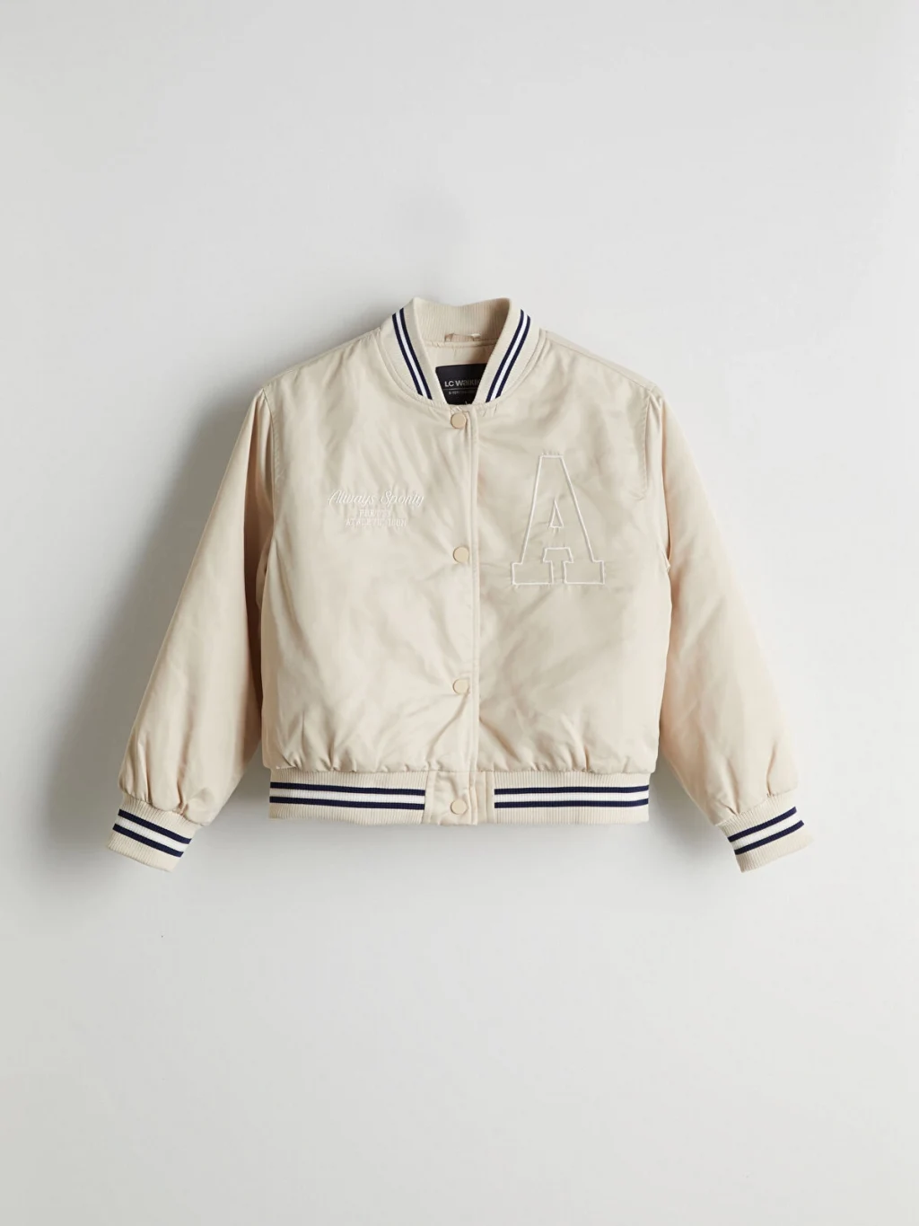 Kolej yaka, uzun kollu, göğsü işlemeli kız çocuk mont. Önden çıtçıt kapamalıdır, yaka, manşet ve etek ucu çizgili ribanalıdır.