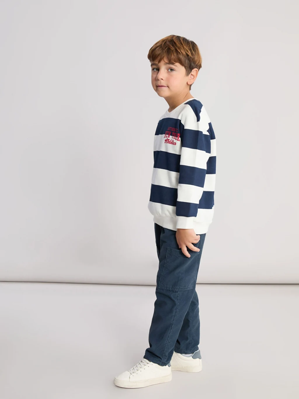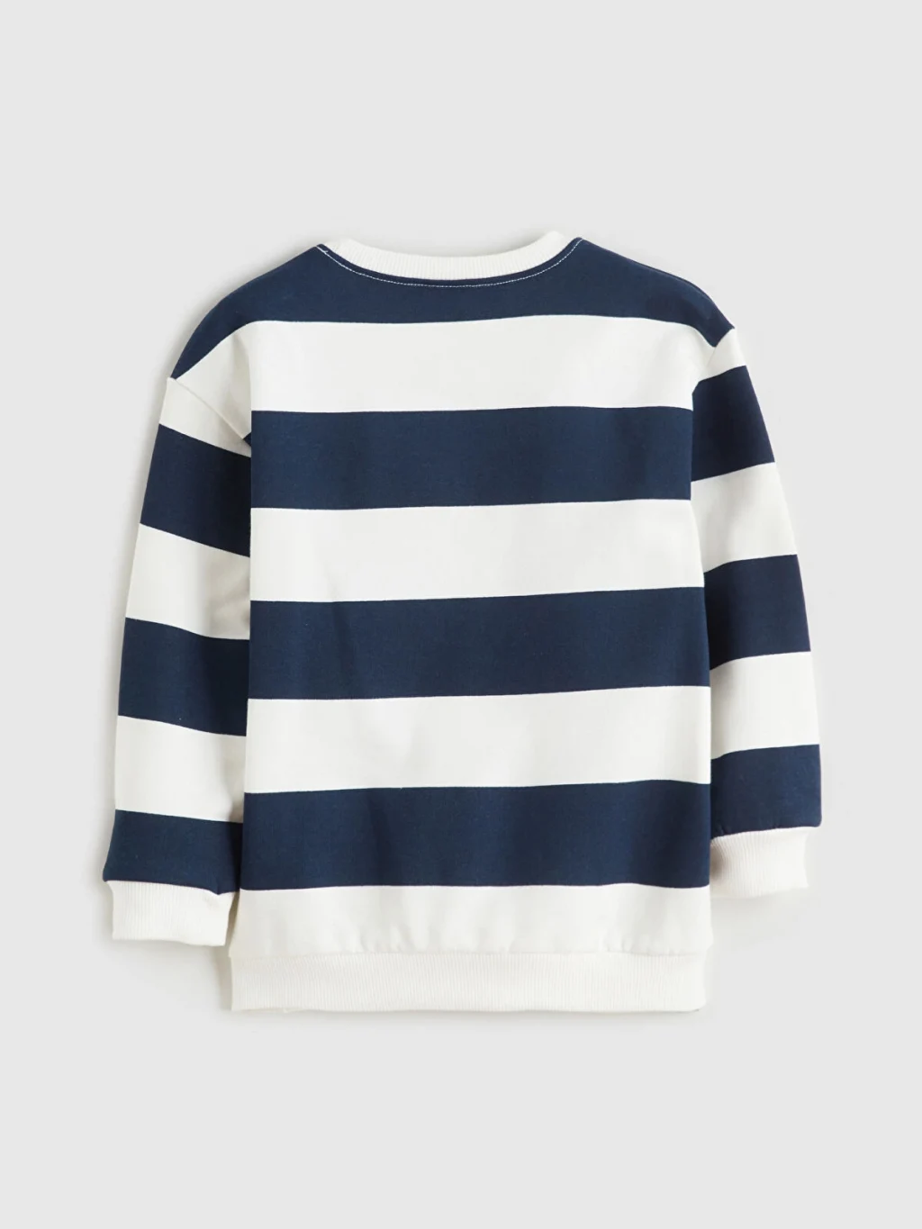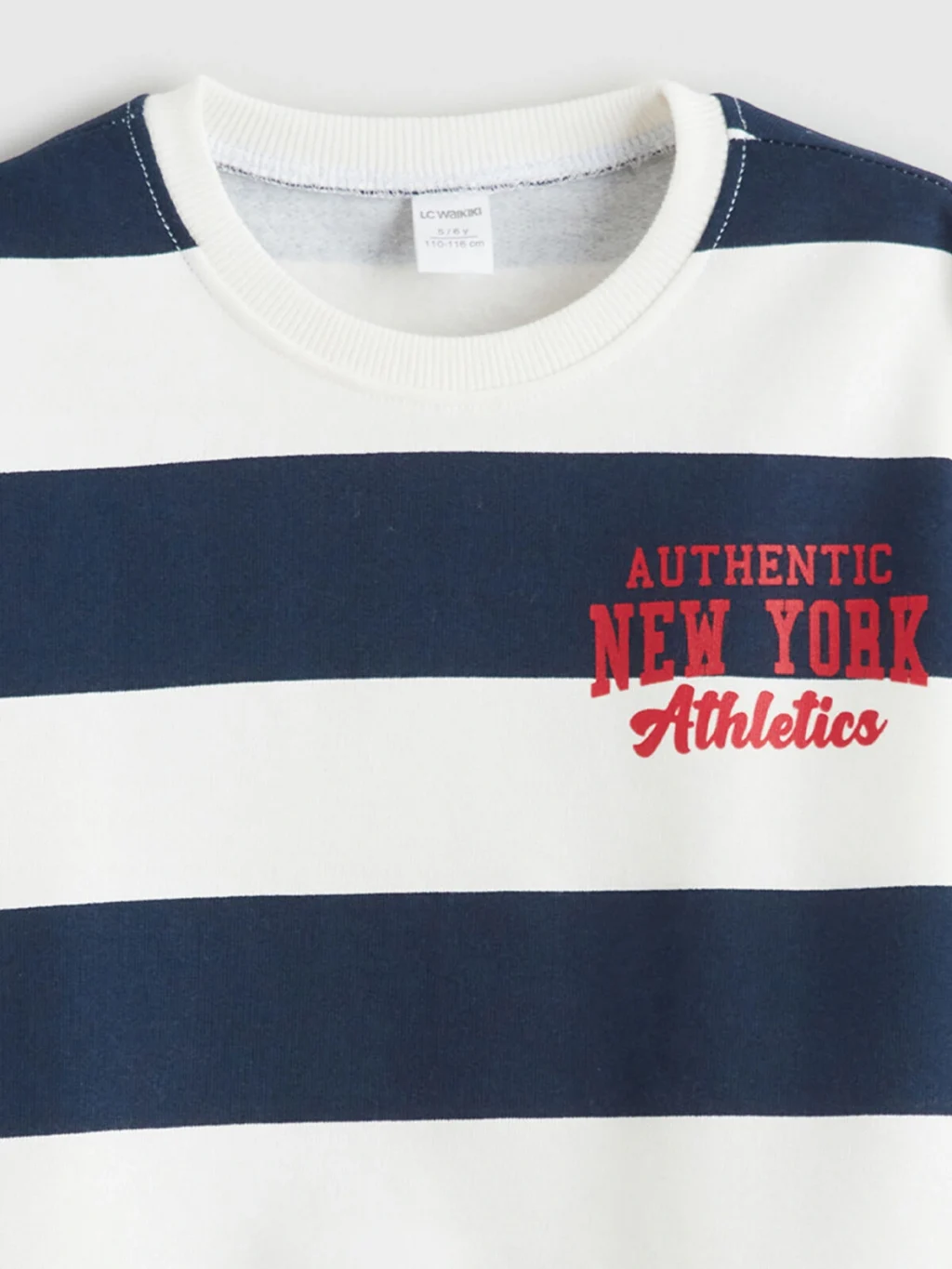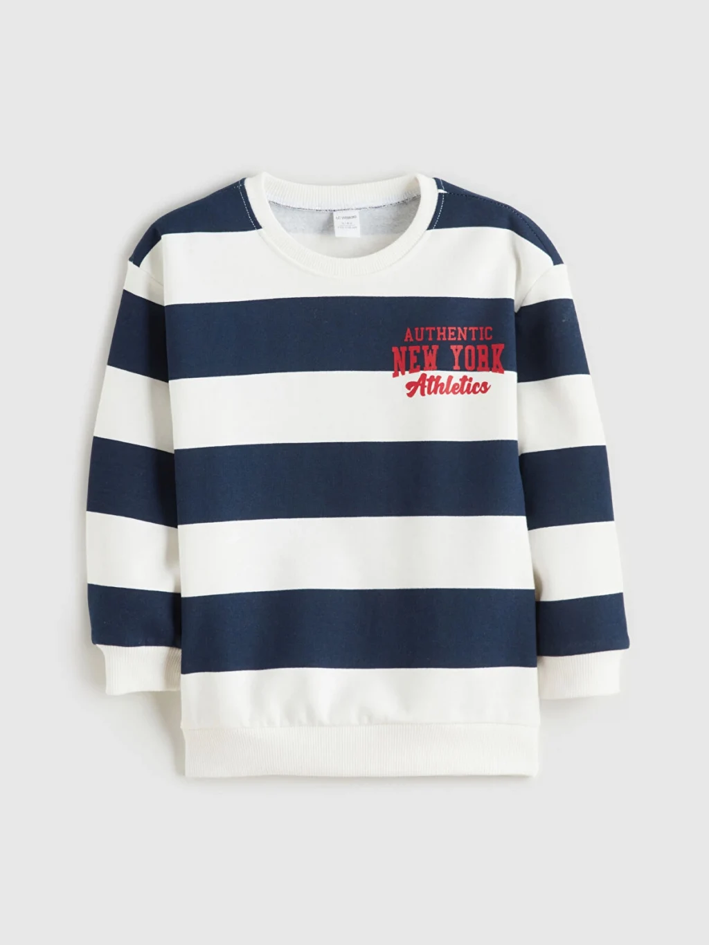 Erkek çocuk sweatshirt, bisiklet yakalı ve uzun kolludur. Kalın 3 iplik şardonlu kumaştan üretilen model, çizgili desenli ve göğsü yazılıdır.