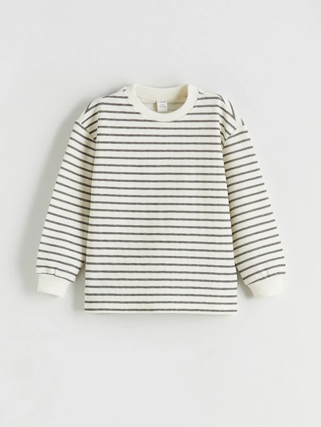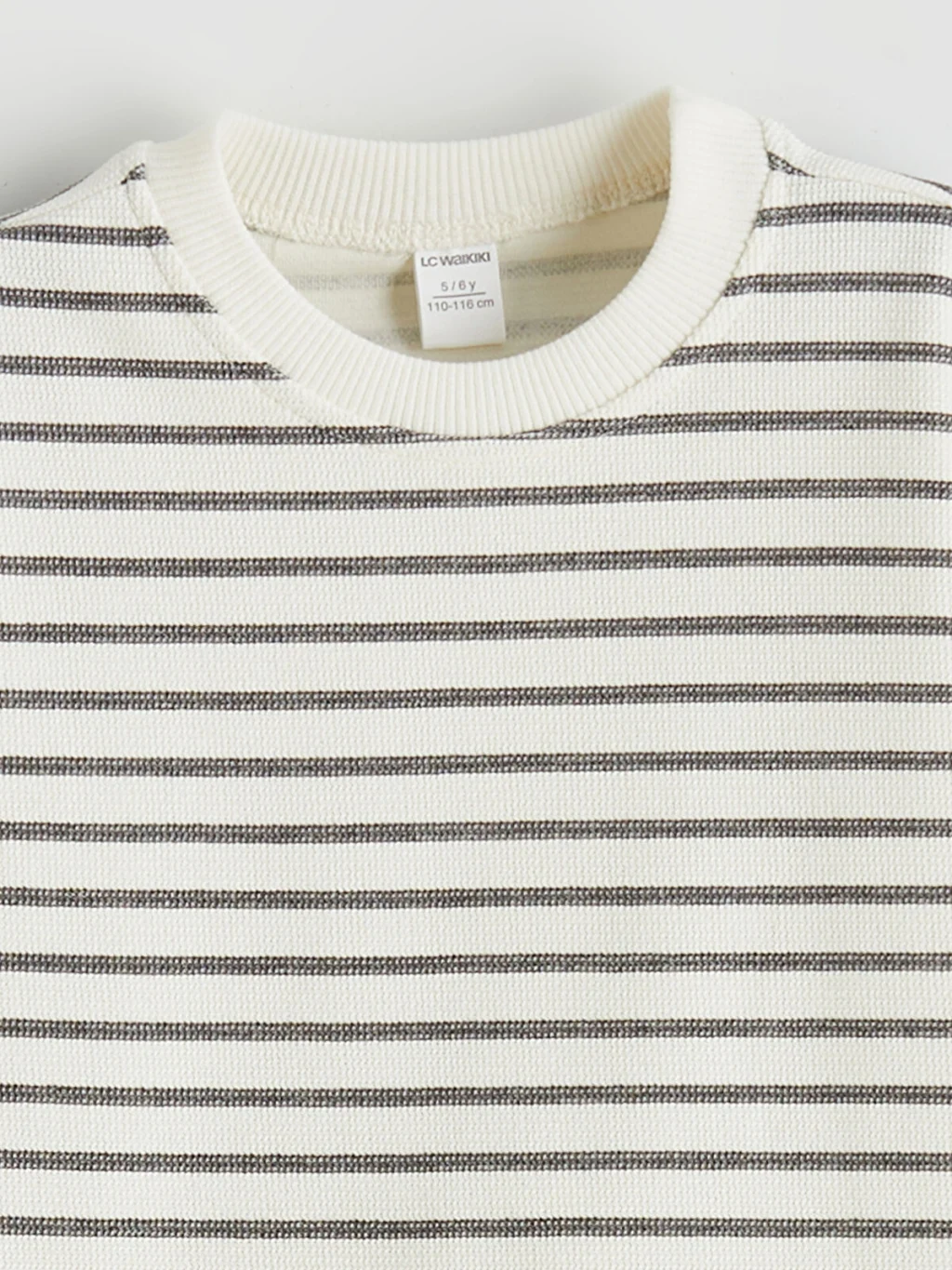 Bisiklet yaka ve uzun kollu erkek çocuk sweatshirt, çizgili desene ve ribanalı manşetler ile etek ucuna sahiptir.