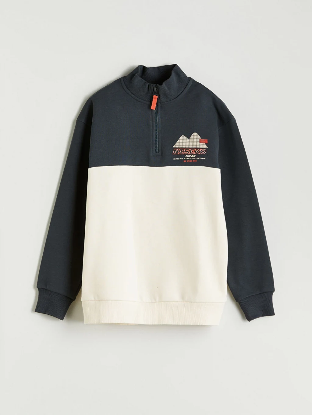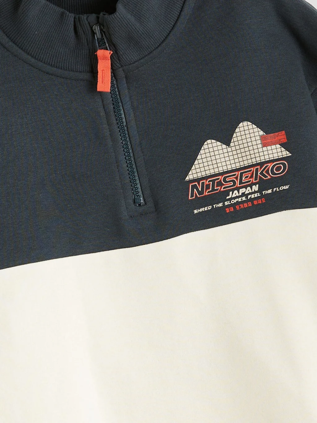 3 iplik şardonlu kumaştan üretilmiş sweatshirt, baskılı ve yarım fermuar kapamalı tasarımlıdır.