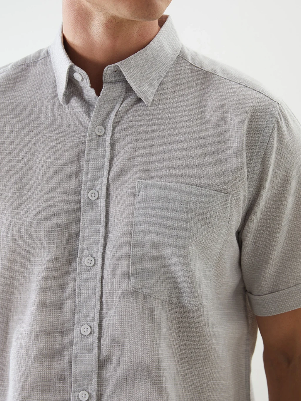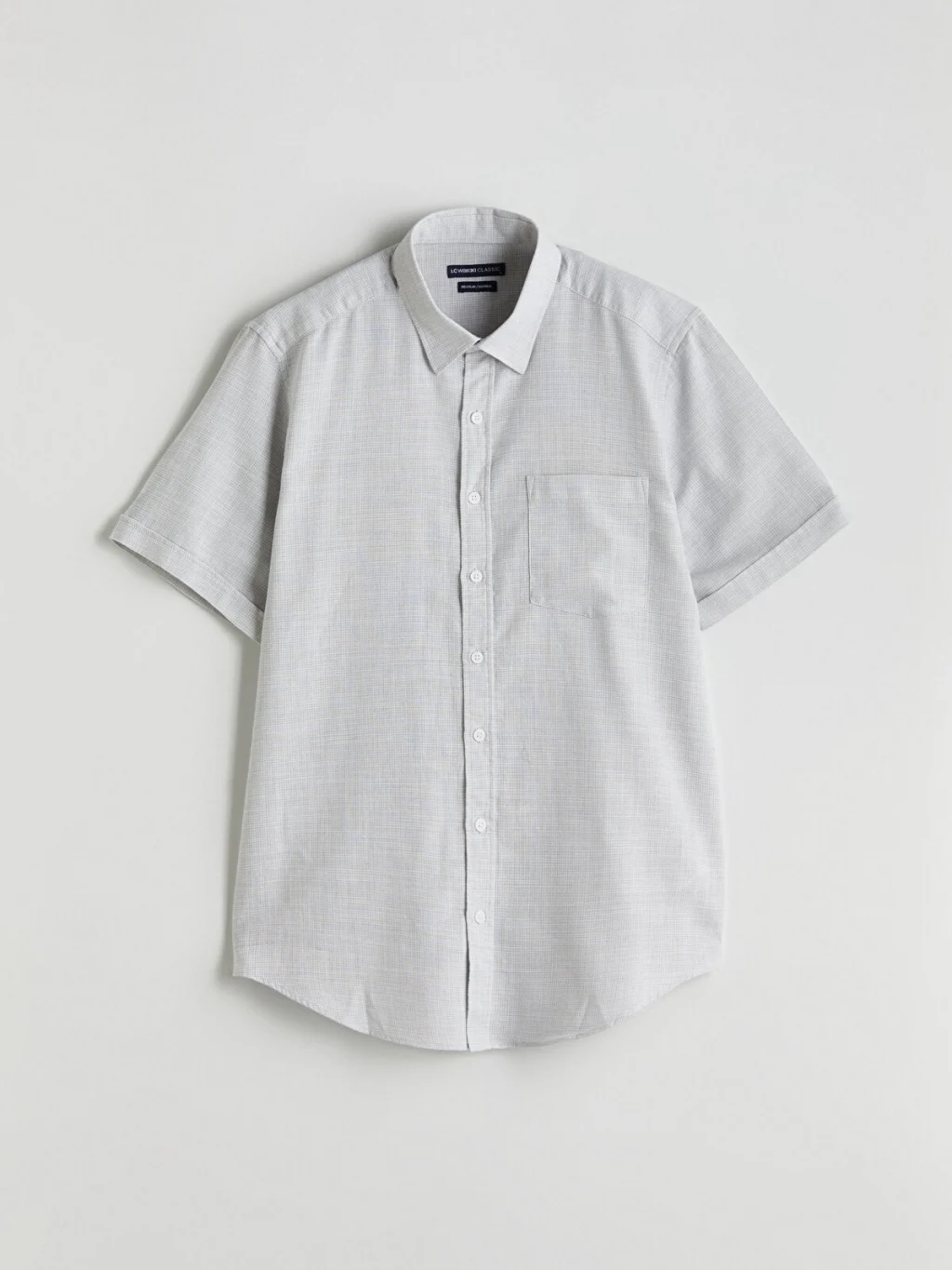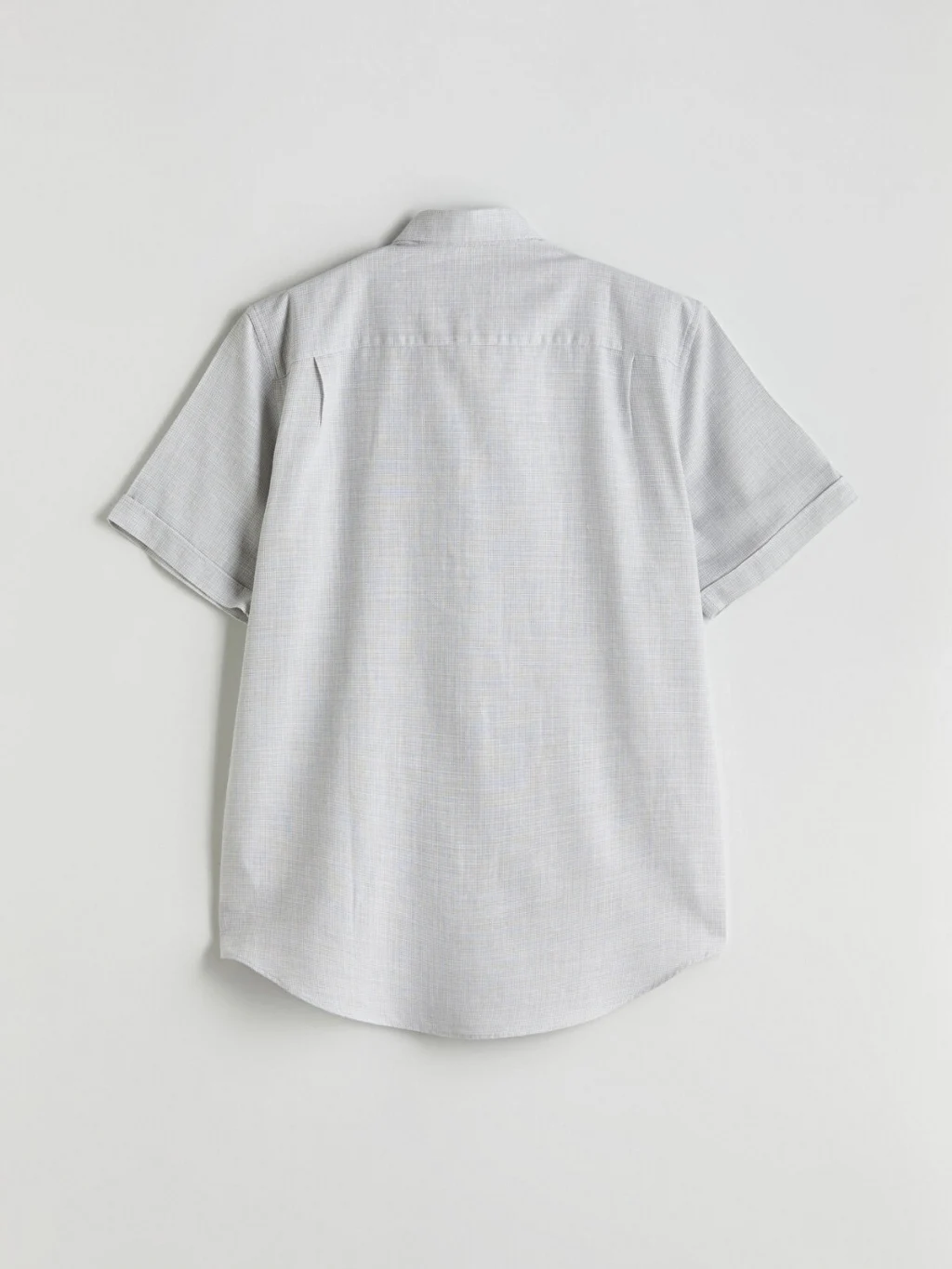 Regular fit kesime sahip erkek gömlek, gömlek yaka, kısa kollu ve armürlü kumaştan üretilmiştir.