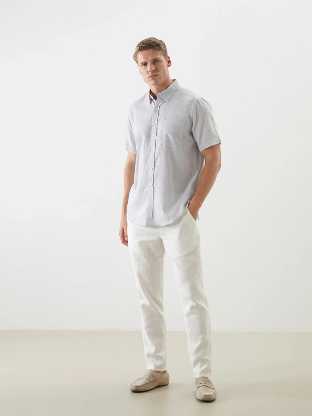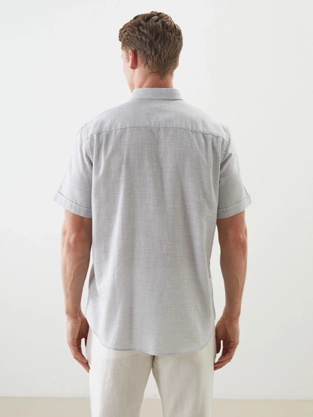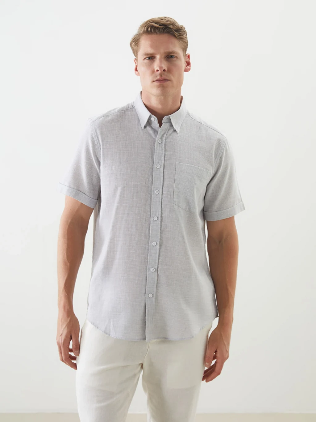 Regular fit kesime sahip erkek gömlek, gömlek yaka, kısa kollu ve armürlü kumaştan üretilmiştir.