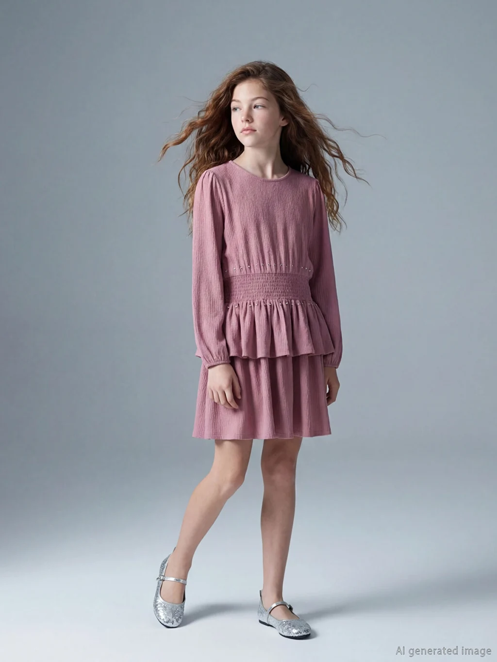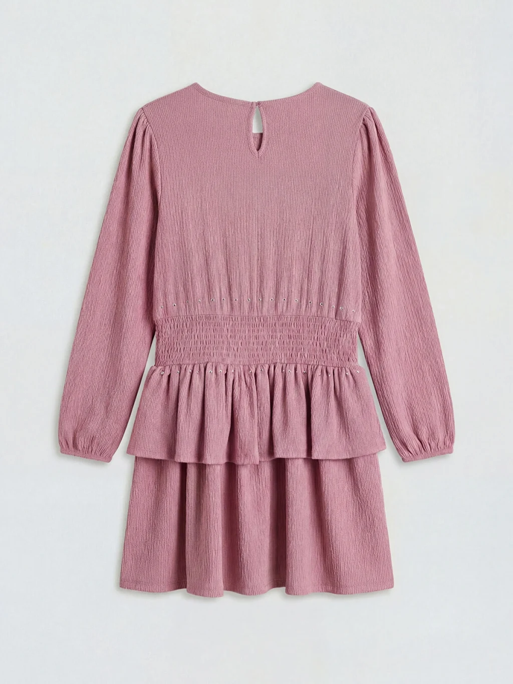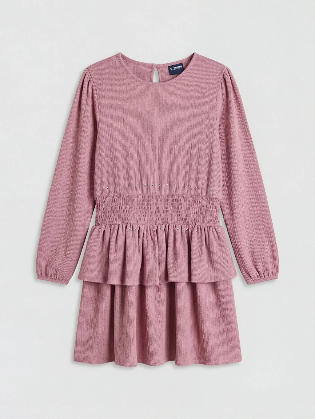 Bisiklet yaka, uzun kollu kız çocuk elbise, beli büzgülü ve taş detaylıdır. Eteği katlı bir tasarıma sahiptir ve enseden düğme kapamalıdır.