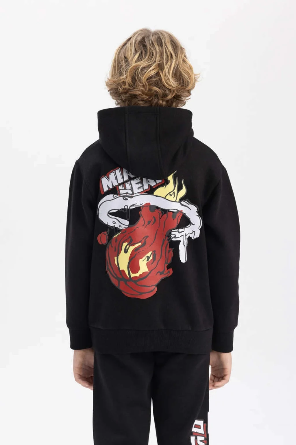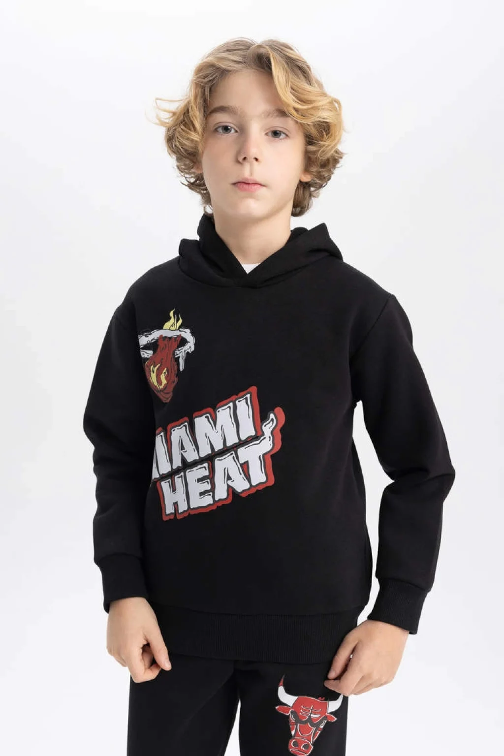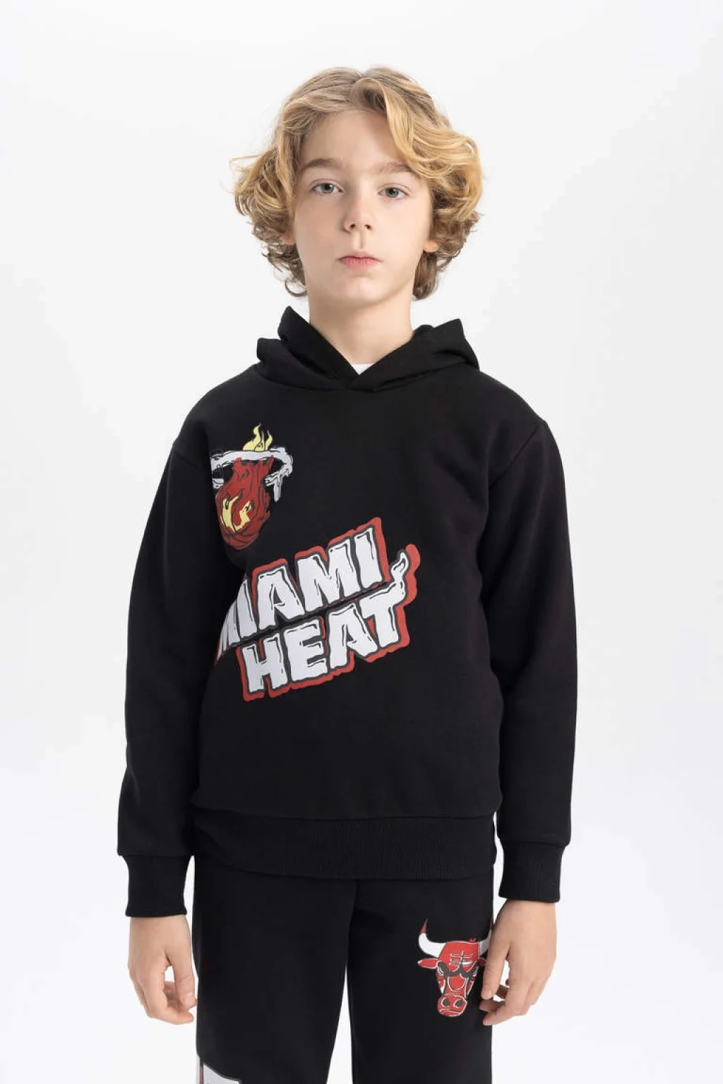 Sweat kumaşı, kapüşonlu, yaka ve kol esnek ribanalı, regular fit NBA baskılı tarz modeli ile enerjik çocukların vazgeçemeyeceği olcak oyun alanlarında, sporda ve okulda severek giyeceğiniz DeFacto Erkek Çocuk NBA Miami Heat Bisiklet Yaka Kalın Sweatshirt.