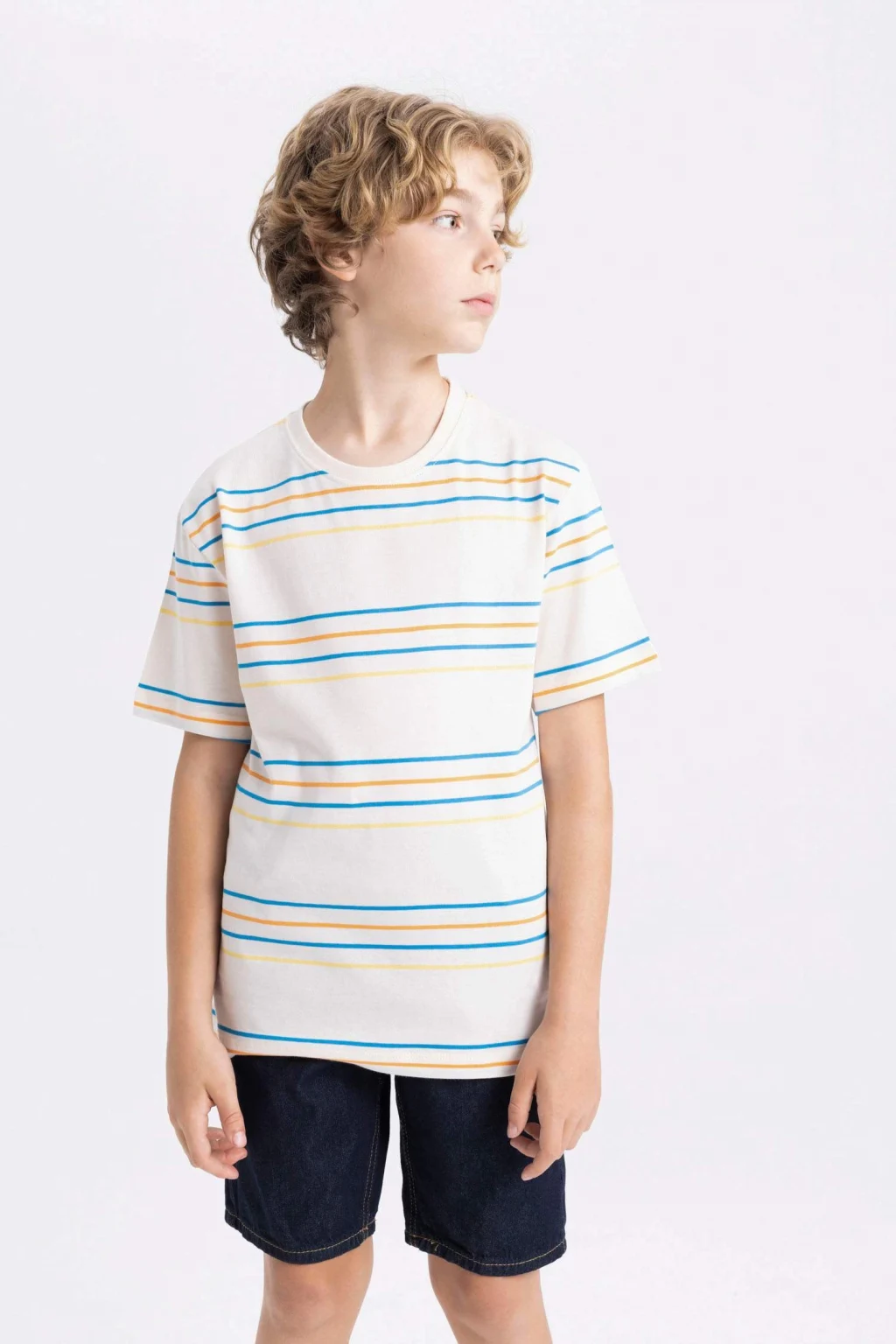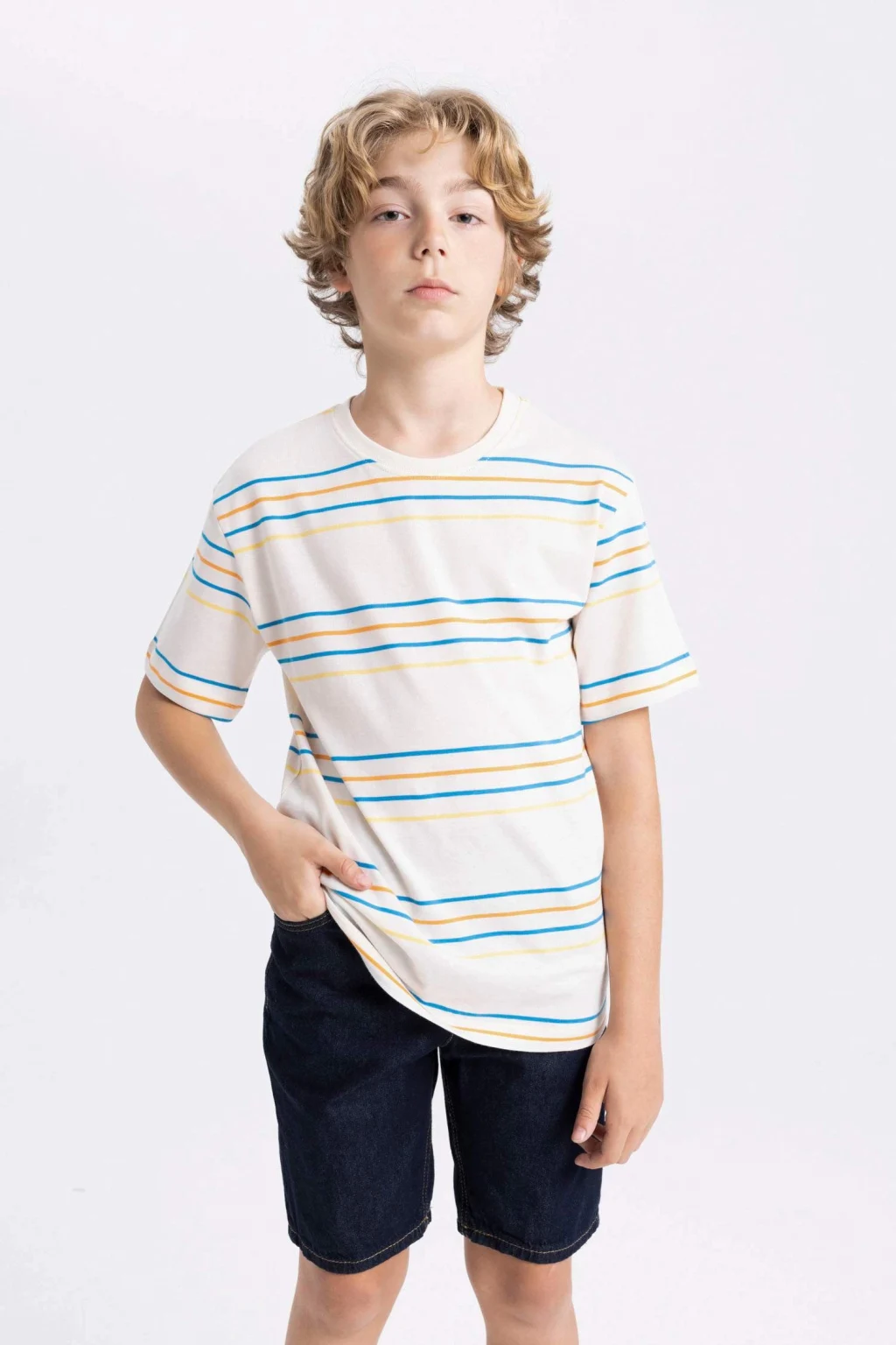 Erkek Çocuk Regular Fit Bisiklet Yaka Çizgili Kısa Kollu Tişört: Şıklığı ve rahatlığı bir arada sunan bu tişört, her tarza uyum sağlar. Kaliteli kumaşı ve şık çizgileri ile günlük kullanımda vazgeçilmezdir. Her zaman şık ve özgün görünmek isteyen erkek çocuklar için ideal bir seçimdir.