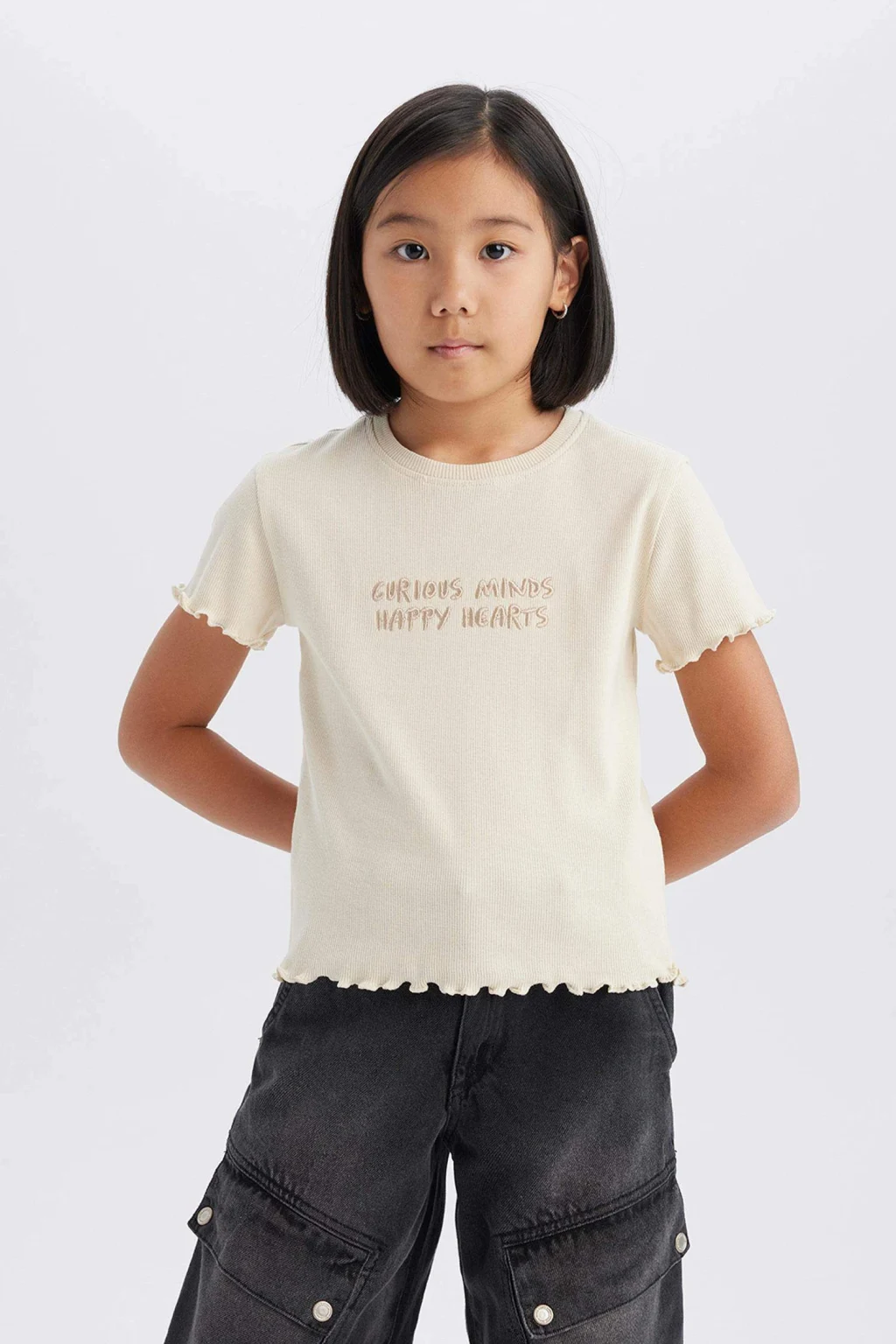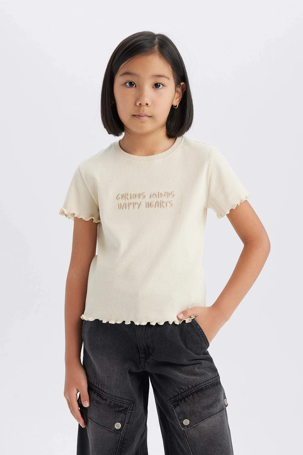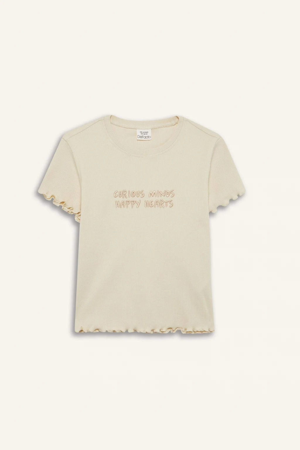 Nakış baskılı slogan desenli kısa kollu tişört. Örme kalıbıyla slim fit dar kesim. Fitilli kaşkorse kumaşından üretilmiştir. Ekru renkte ve sonbahar için ideal. Kız çocukları için temel bir parça. Bisiklet yaka detayıyla şık bir görünüm sunar.