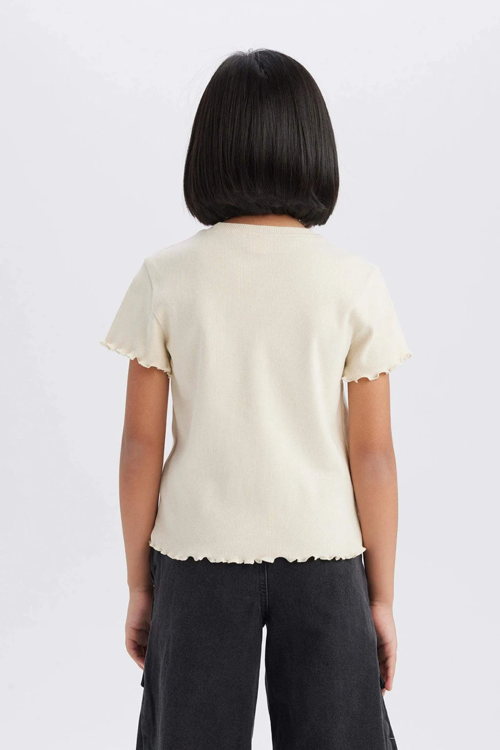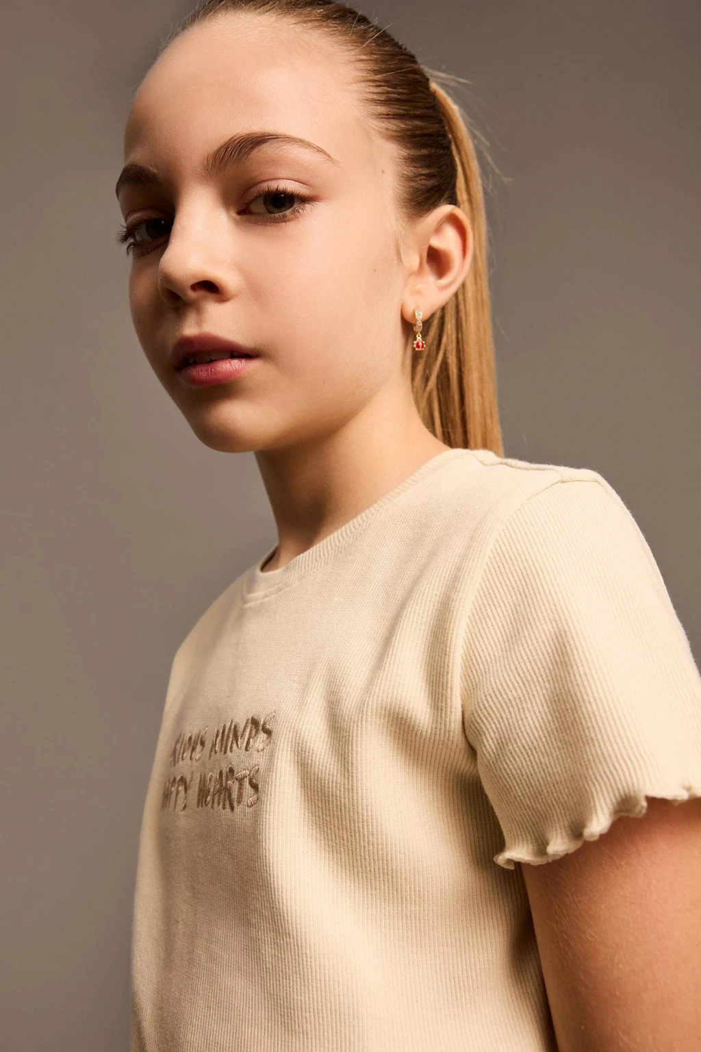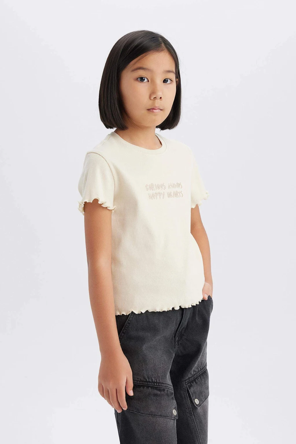 Nakış baskılı slogan desenli kısa kollu tişört. Örme kalıbıyla slim fit dar kesim. Fitilli kaşkorse kumaşından üretilmiştir. Ekru renkte ve sonbahar için ideal. Kız çocukları için temel bir parça. Bisiklet yaka detayıyla şık bir görünüm sunar.