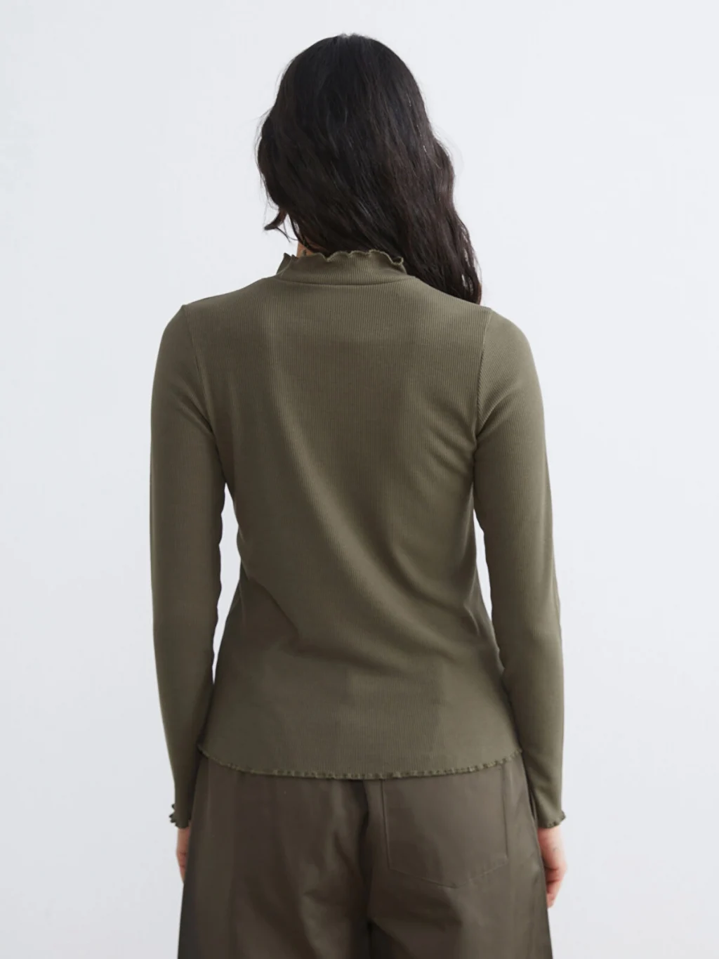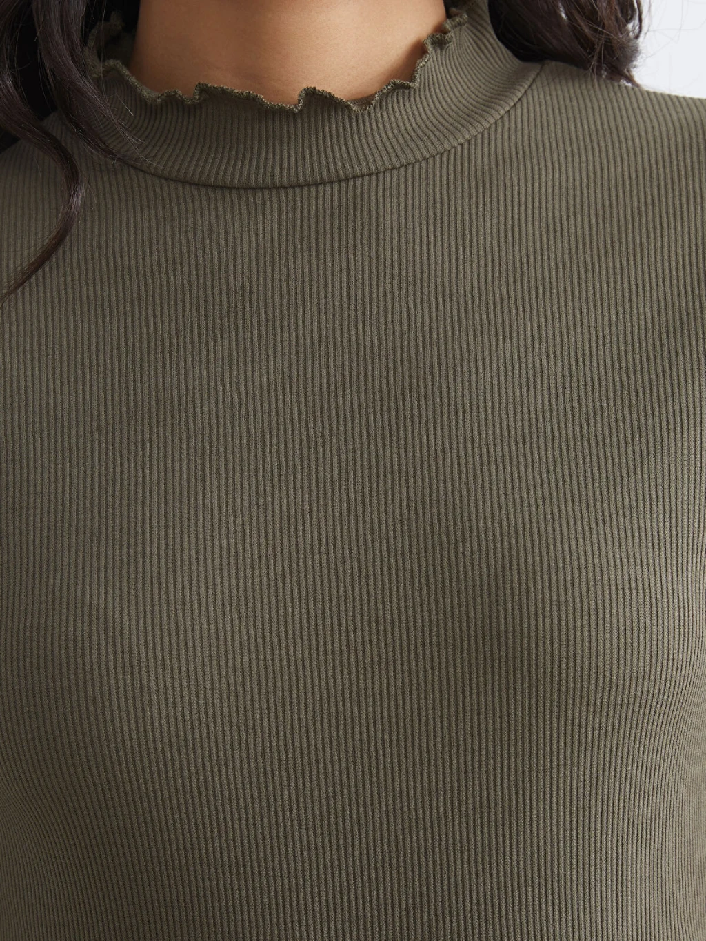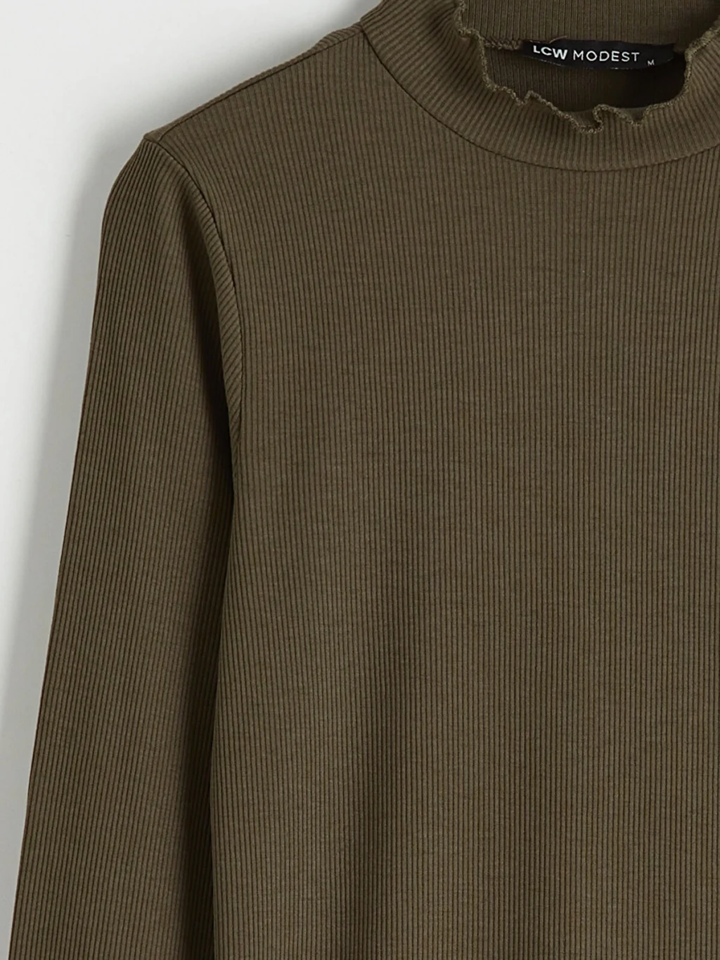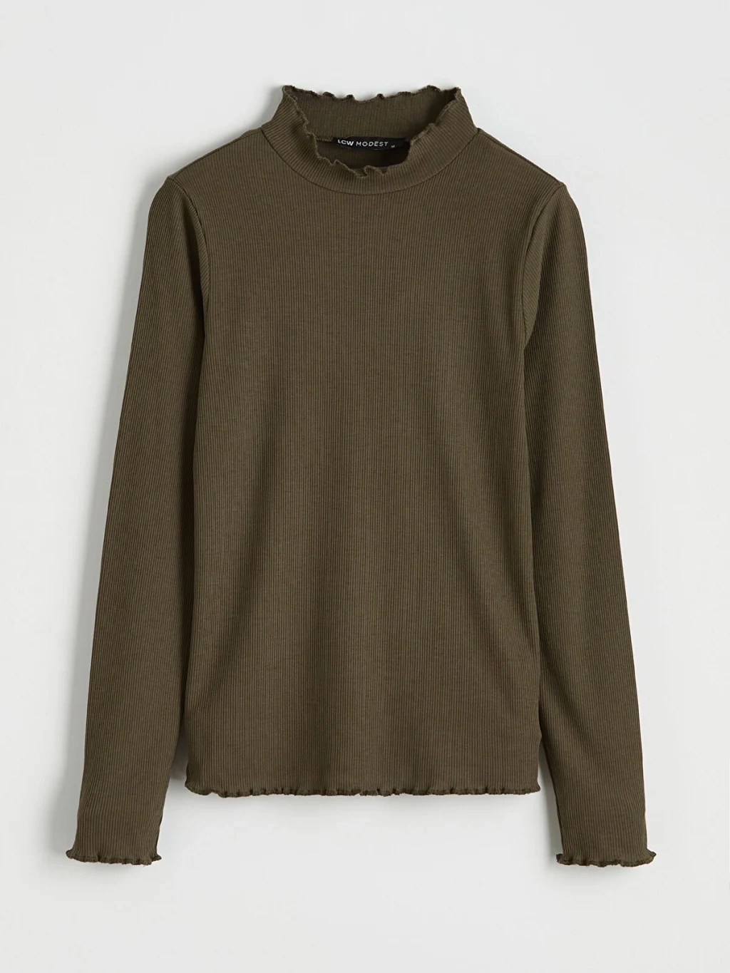 Ekstra dar kalıplı kadın body, kaşkorse kumaştan üretilmiştir. Dik yakalı ve uzun kolludur, yaka, kol ve etek uçları fırfır detaylıdır.