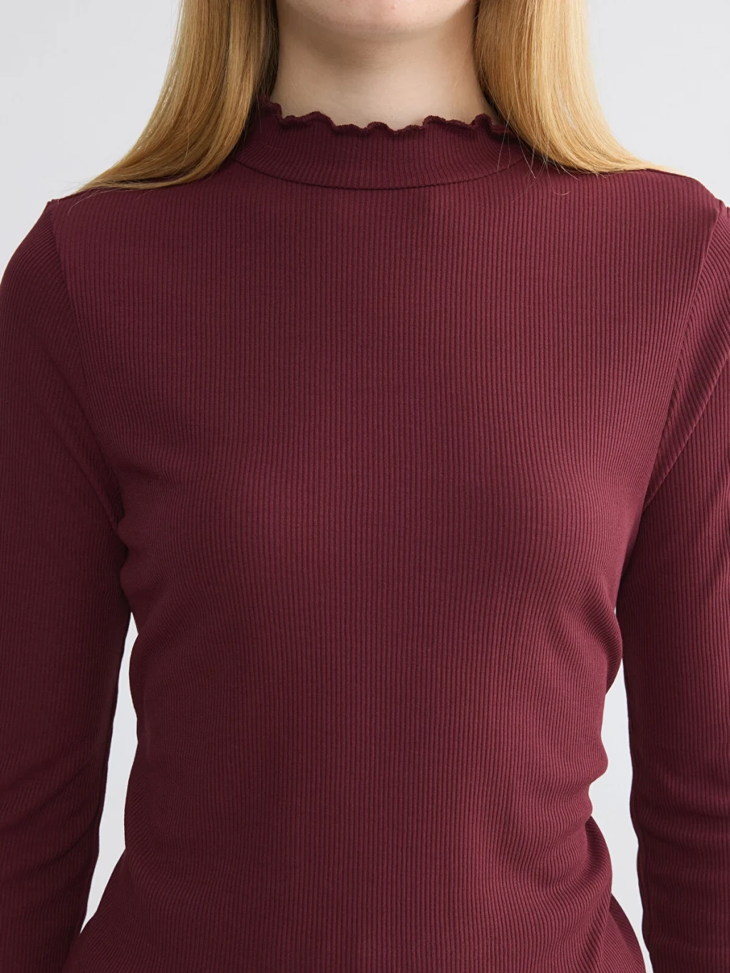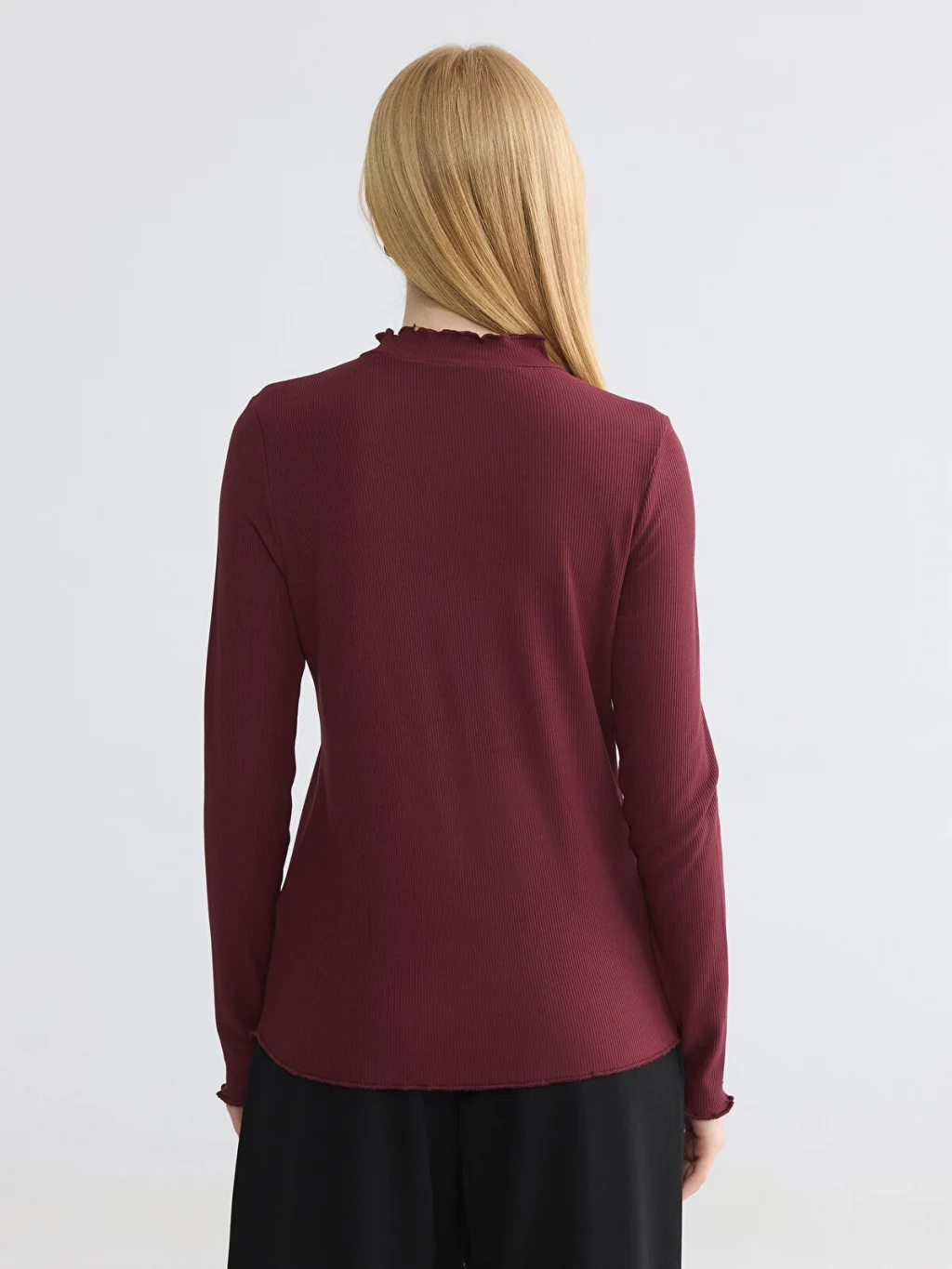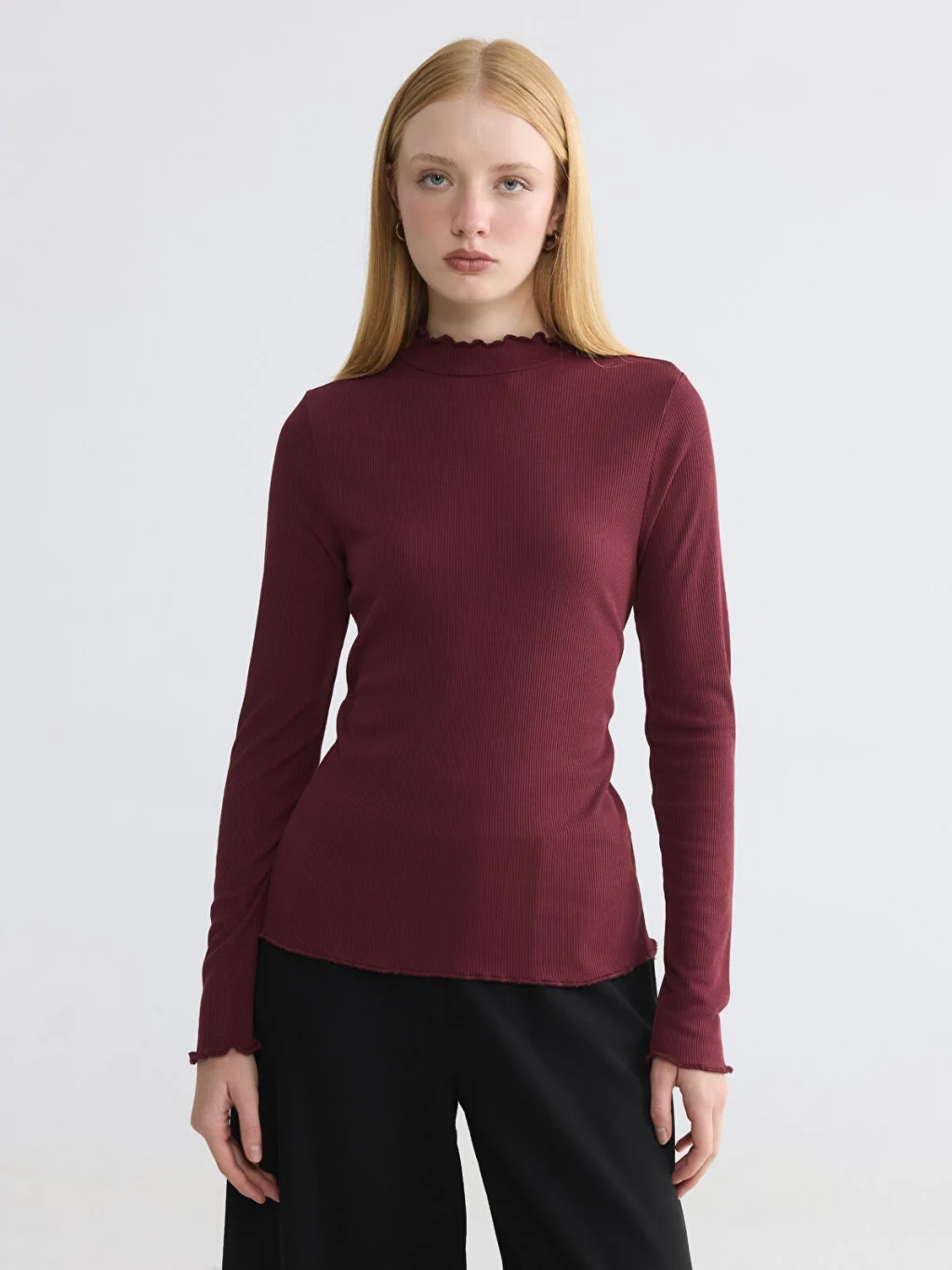 Ekstra dar kalıplı kadın body, kaşkorse kumaştan üretilmiştir. Dik yakalı ve uzun kolludur, yaka, kol ve etek uçları fırfır detaylıdır.