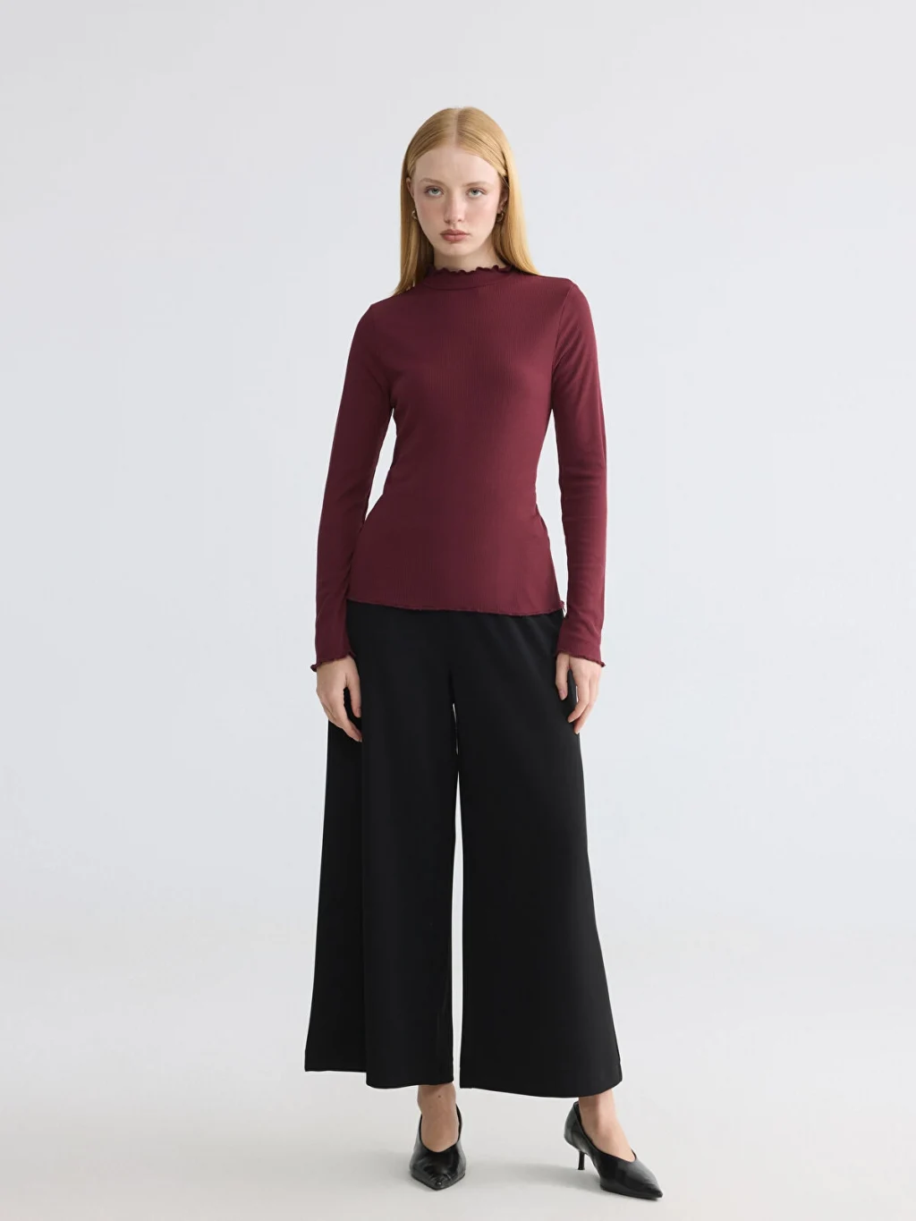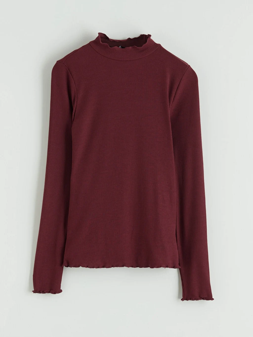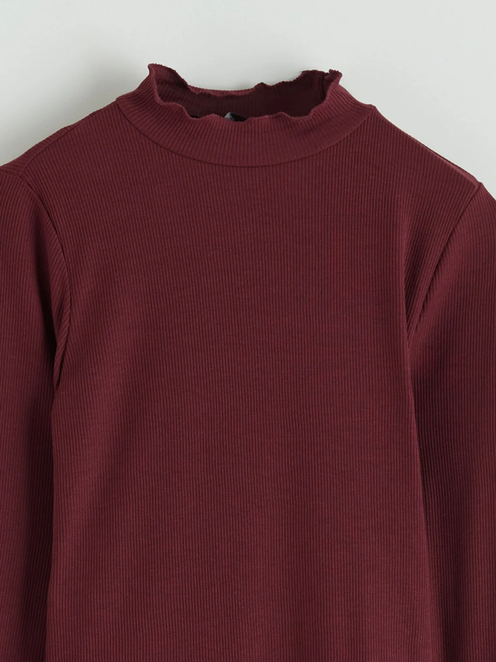Ekstra dar kalıplı kadın body, kaşkorse kumaştan üretilmiştir. Dik yakalı ve uzun kolludur, yaka, kol ve etek uçları fırfır detaylıdır.