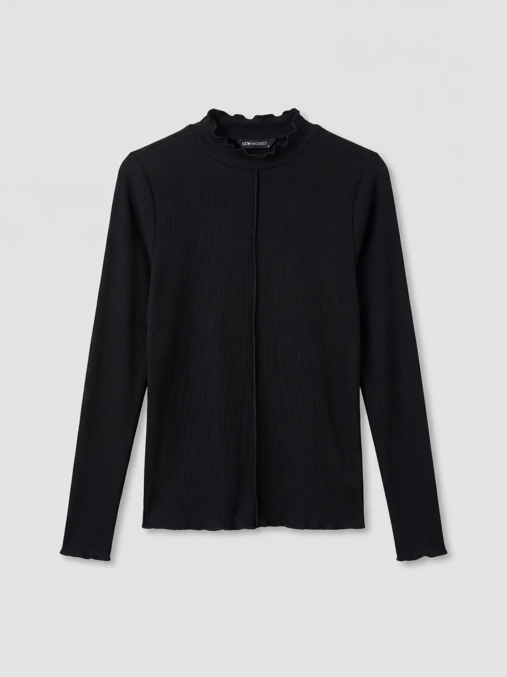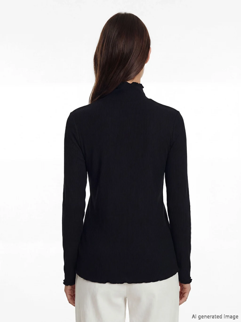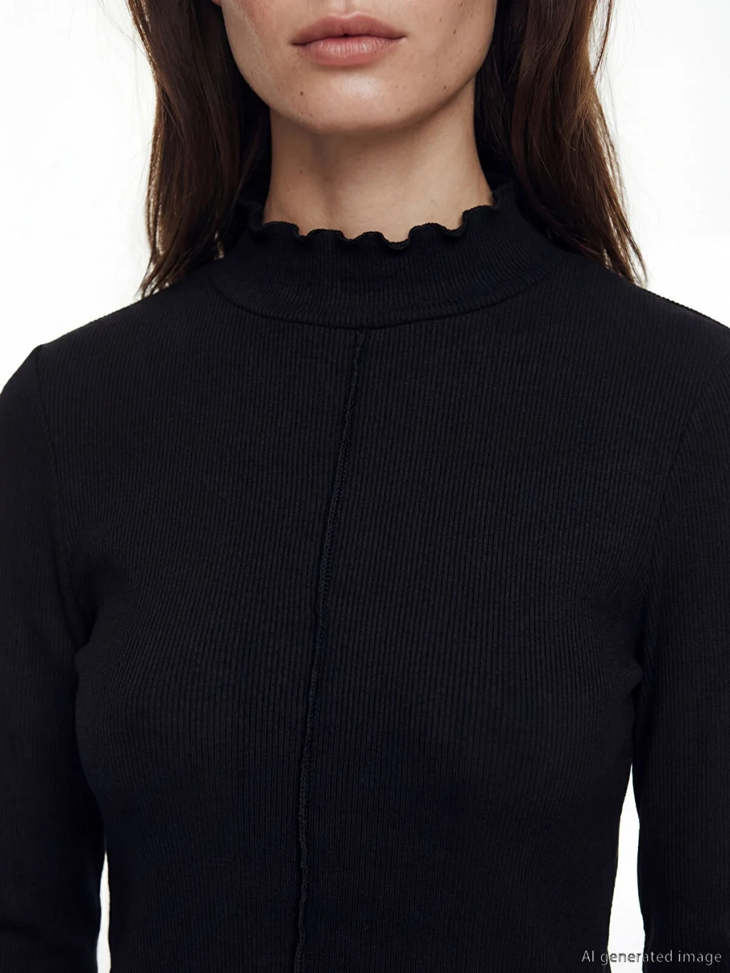 Fırfırlı dik yakalı ve uzun kollu kadın tişört, ekstra dar kalıplıdır ve kaşkorse kumaştan üretilmiştir. Kol ve etek uçları fırfırlıdır.
