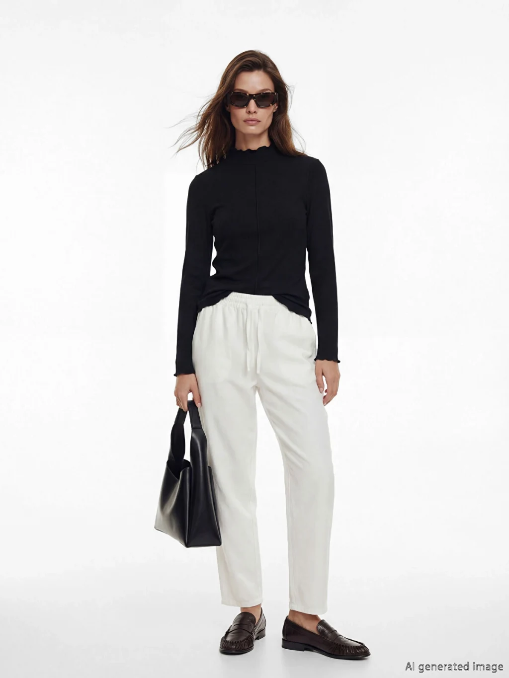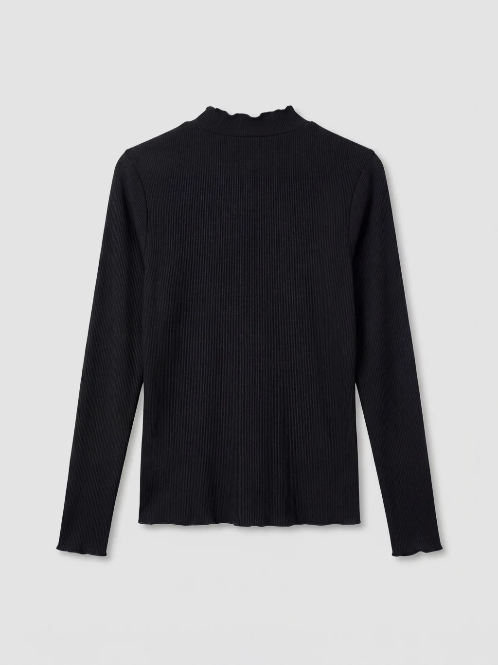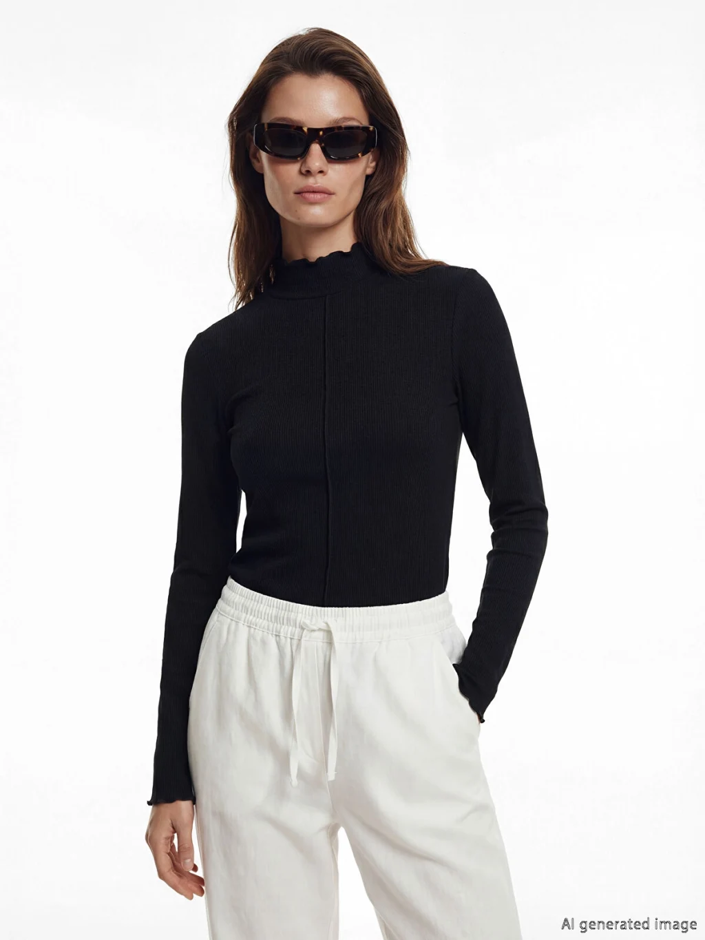 Fırfırlı dik yakalı ve uzun kollu kadın tişört, ekstra dar kalıplıdır ve kaşkorse kumaştan üretilmiştir. Kol ve etek uçları fırfırlıdır.