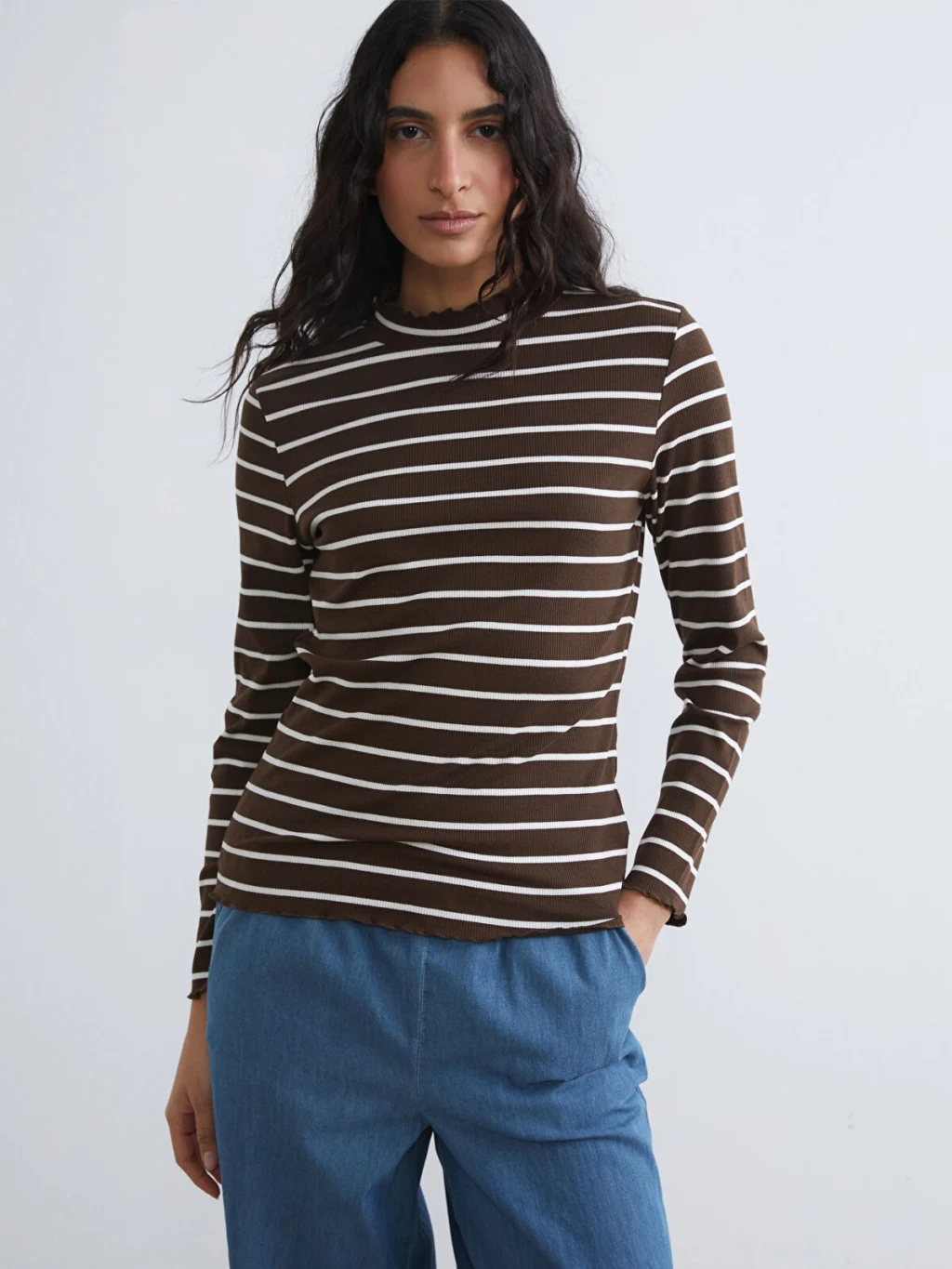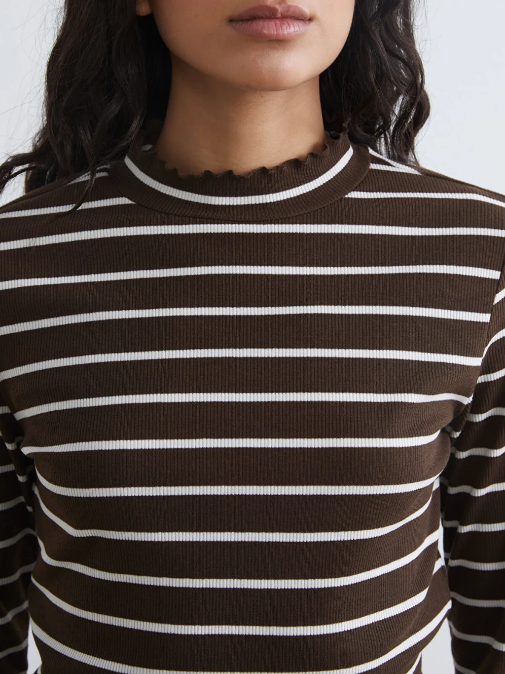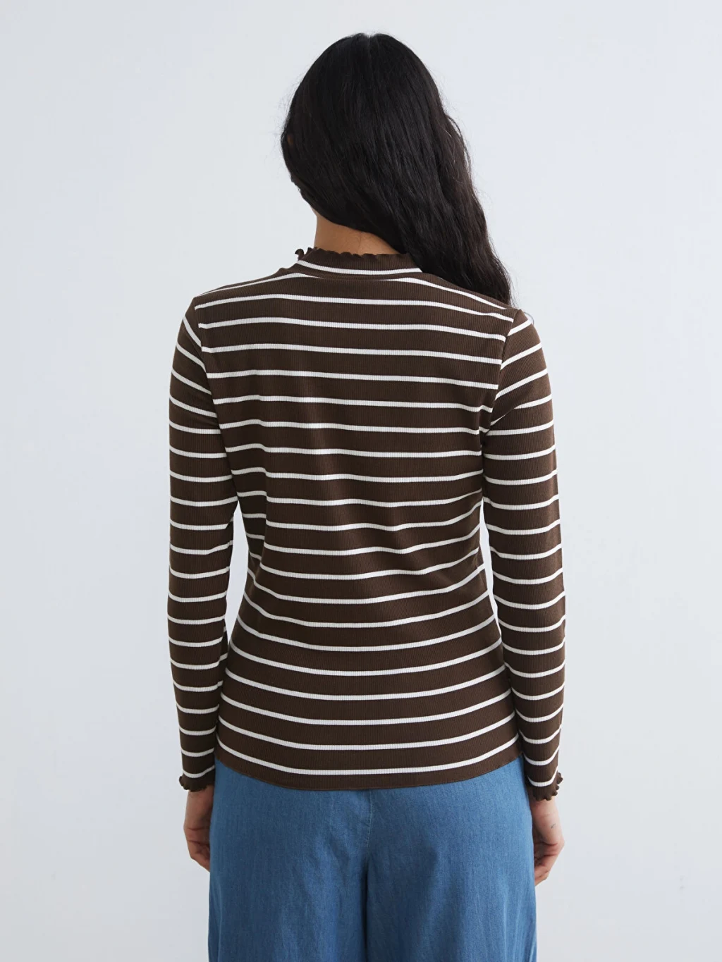 Ekstra dar kalıplı kadın body, dik yakalı ve uzun kolludur. Çizgili desenli, yaka ve etek ucu fırfır detaylıdır.