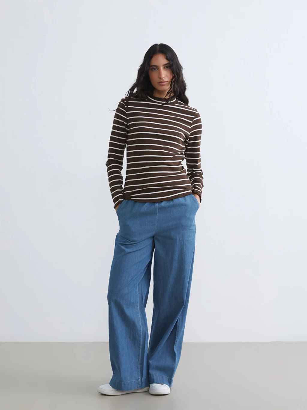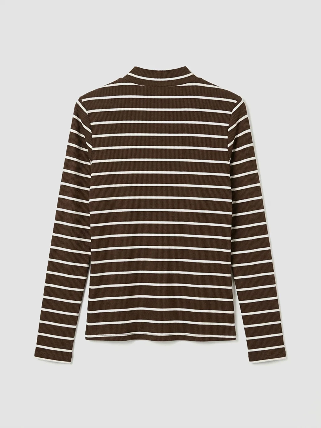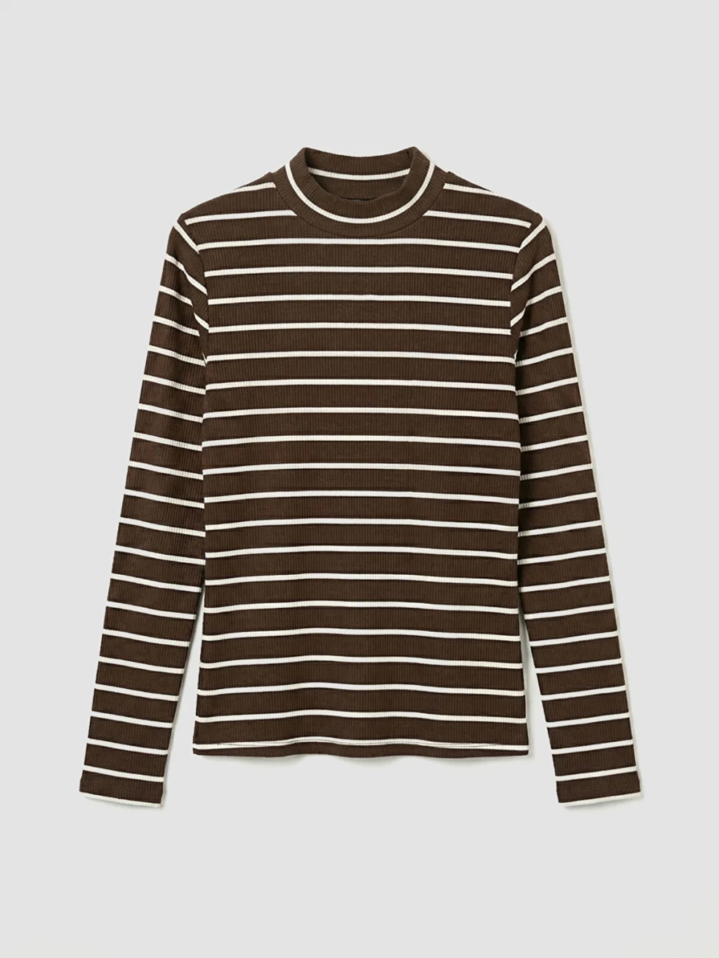 Ekstra dar kalıplı kadın body, dik yakalı ve uzun kolludur. Çizgili desenli, yaka ve etek ucu fırfır detaylıdır.