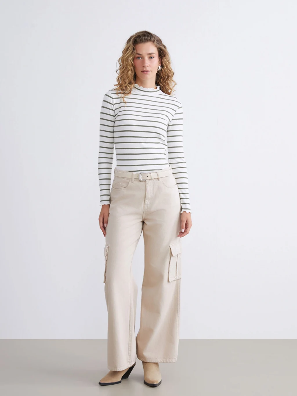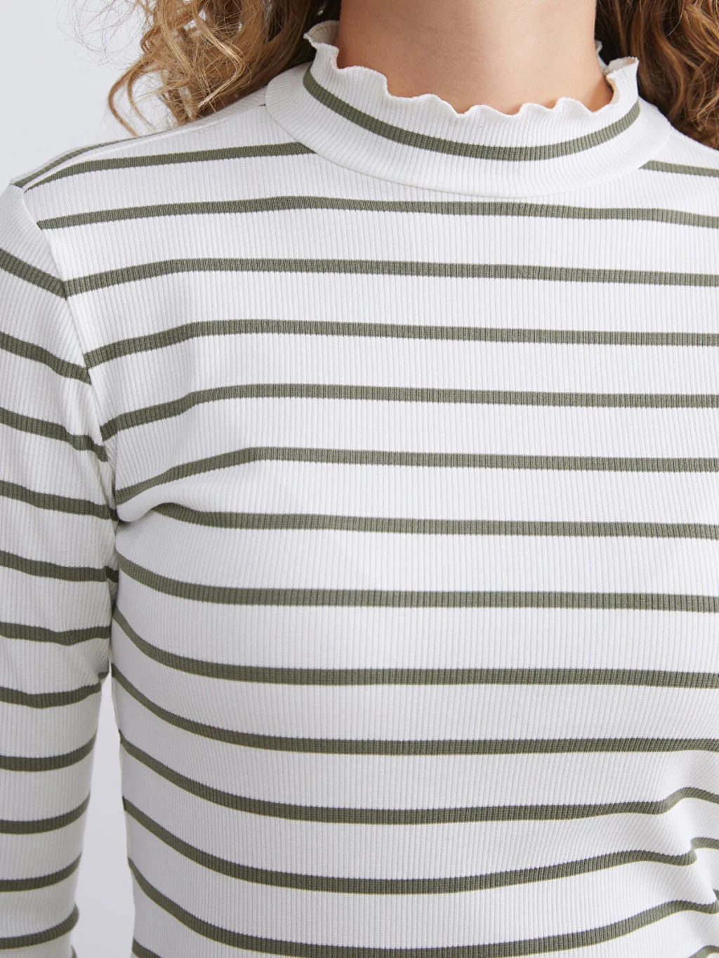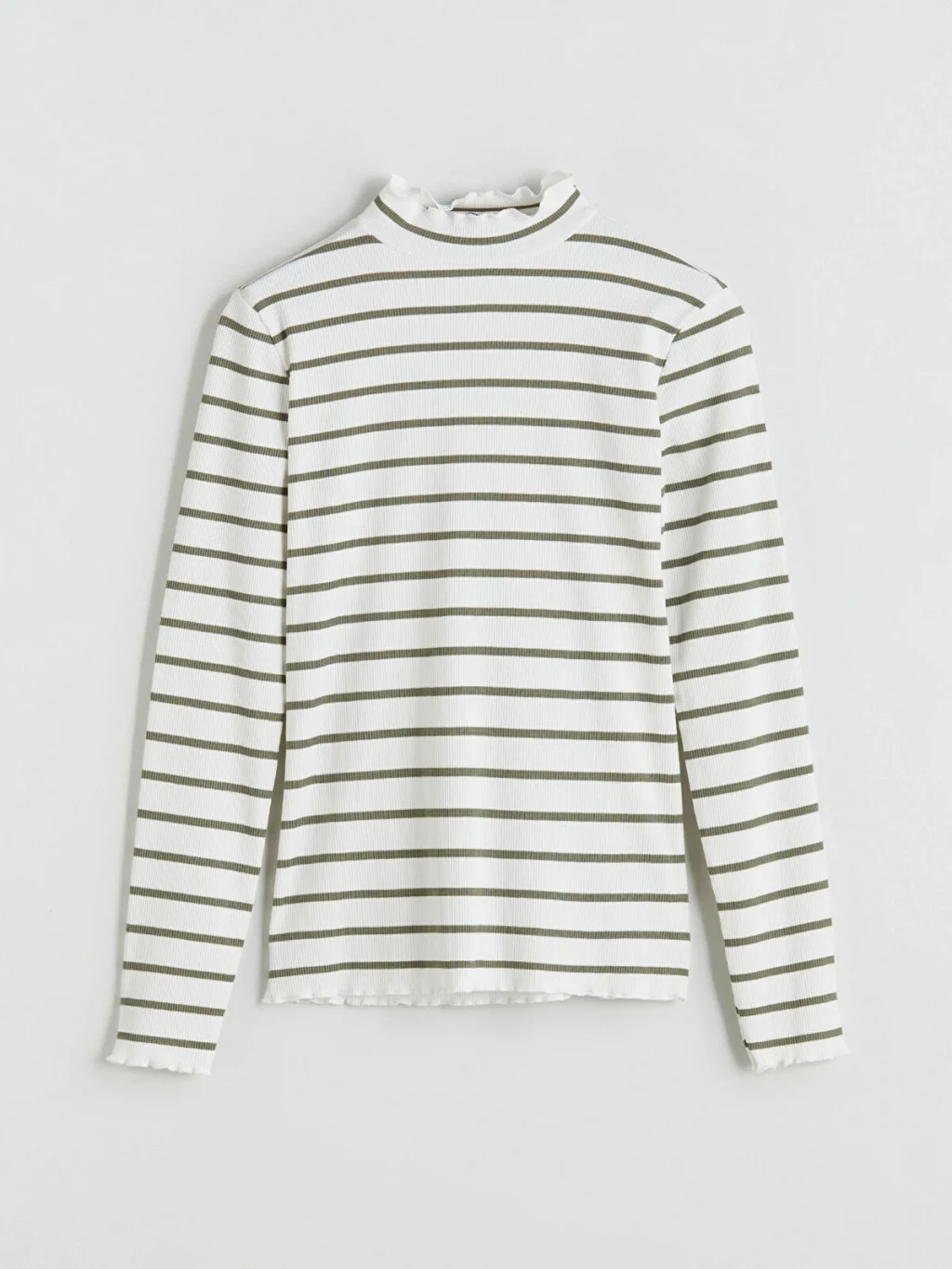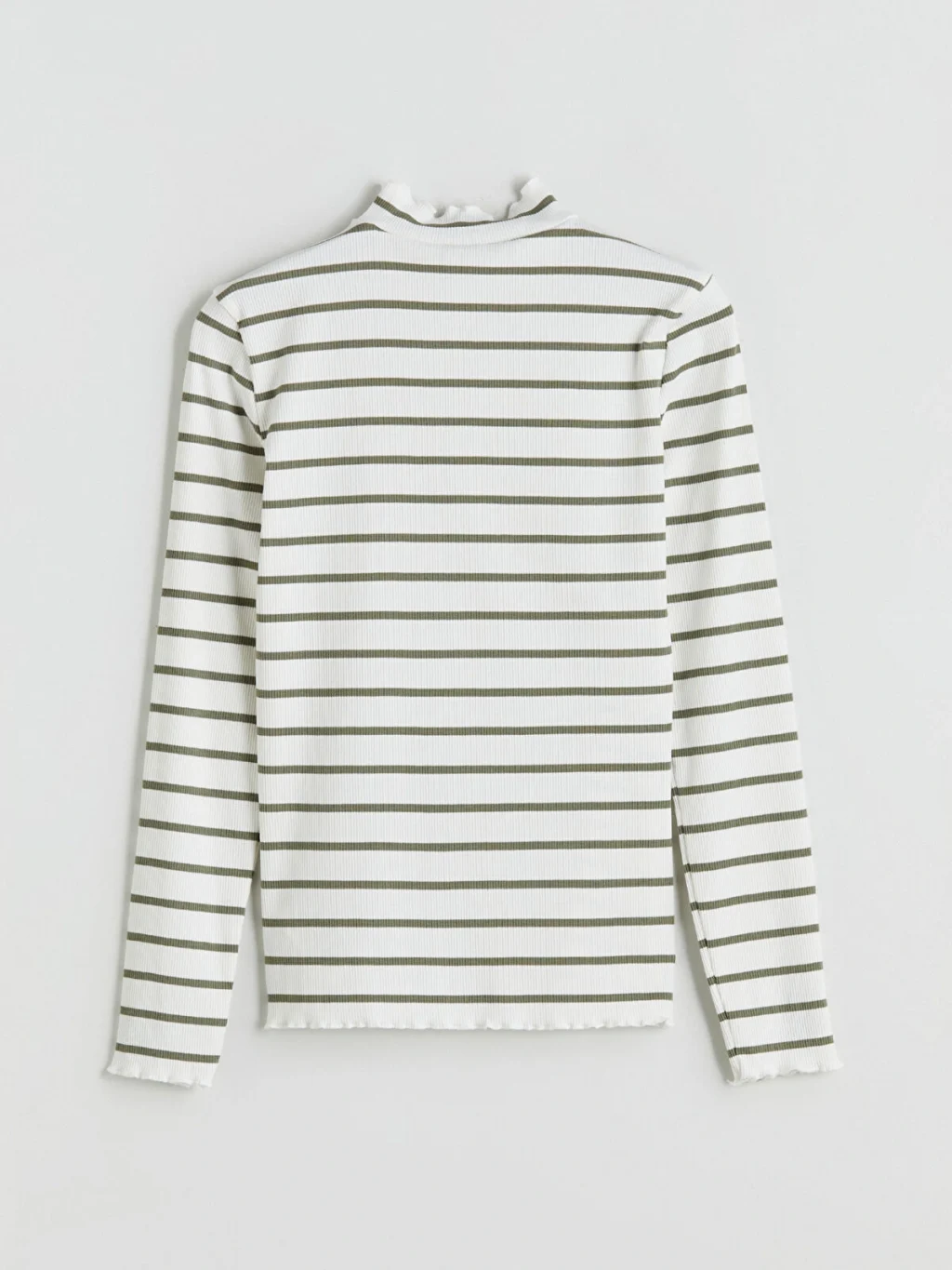 Dik yaka kadın body, kaşkorse kumaştan üretilmiştir. Yakası, alt kısmı ve kol uçları fırfırlı tasarıma sahiptir.