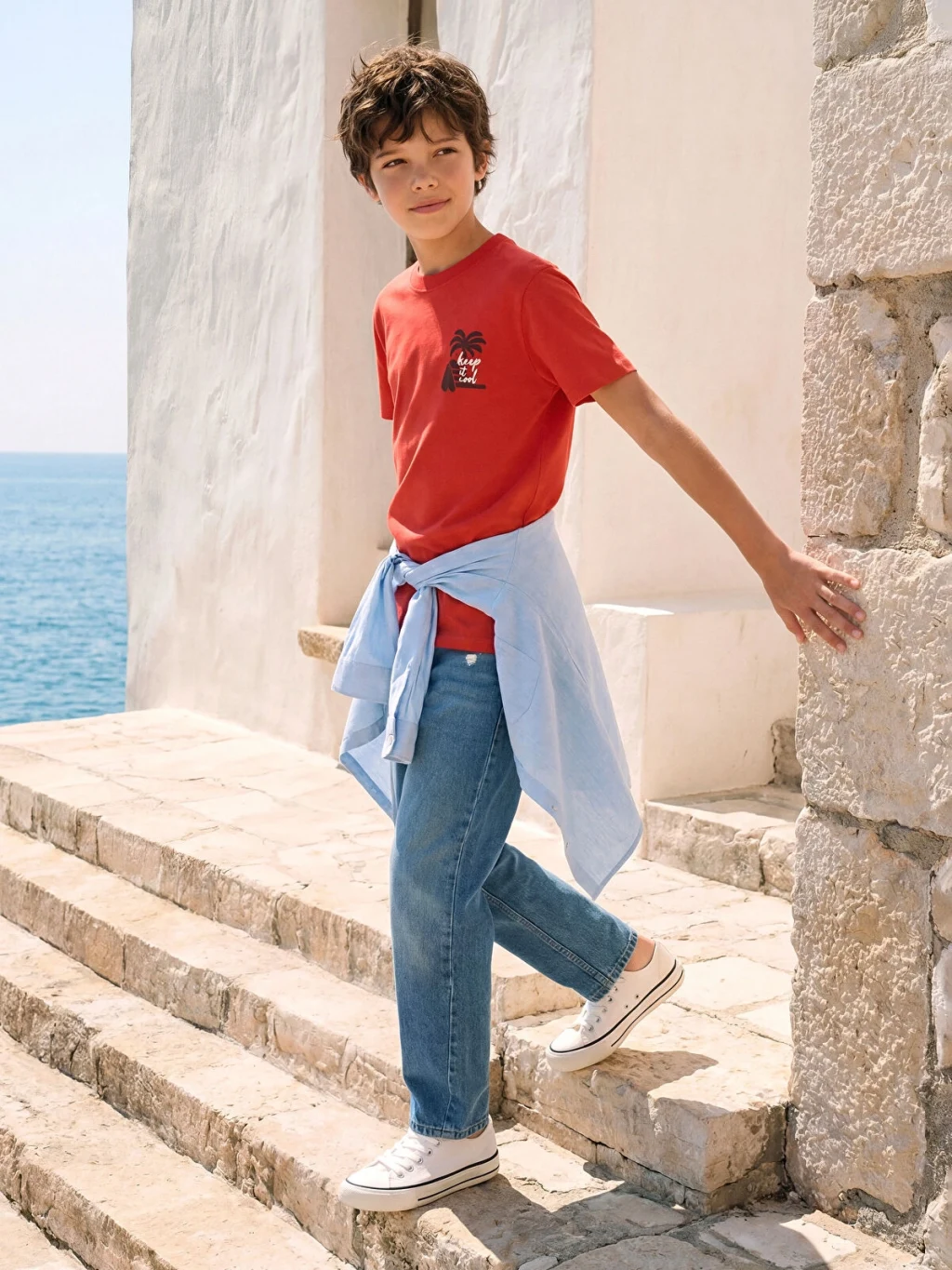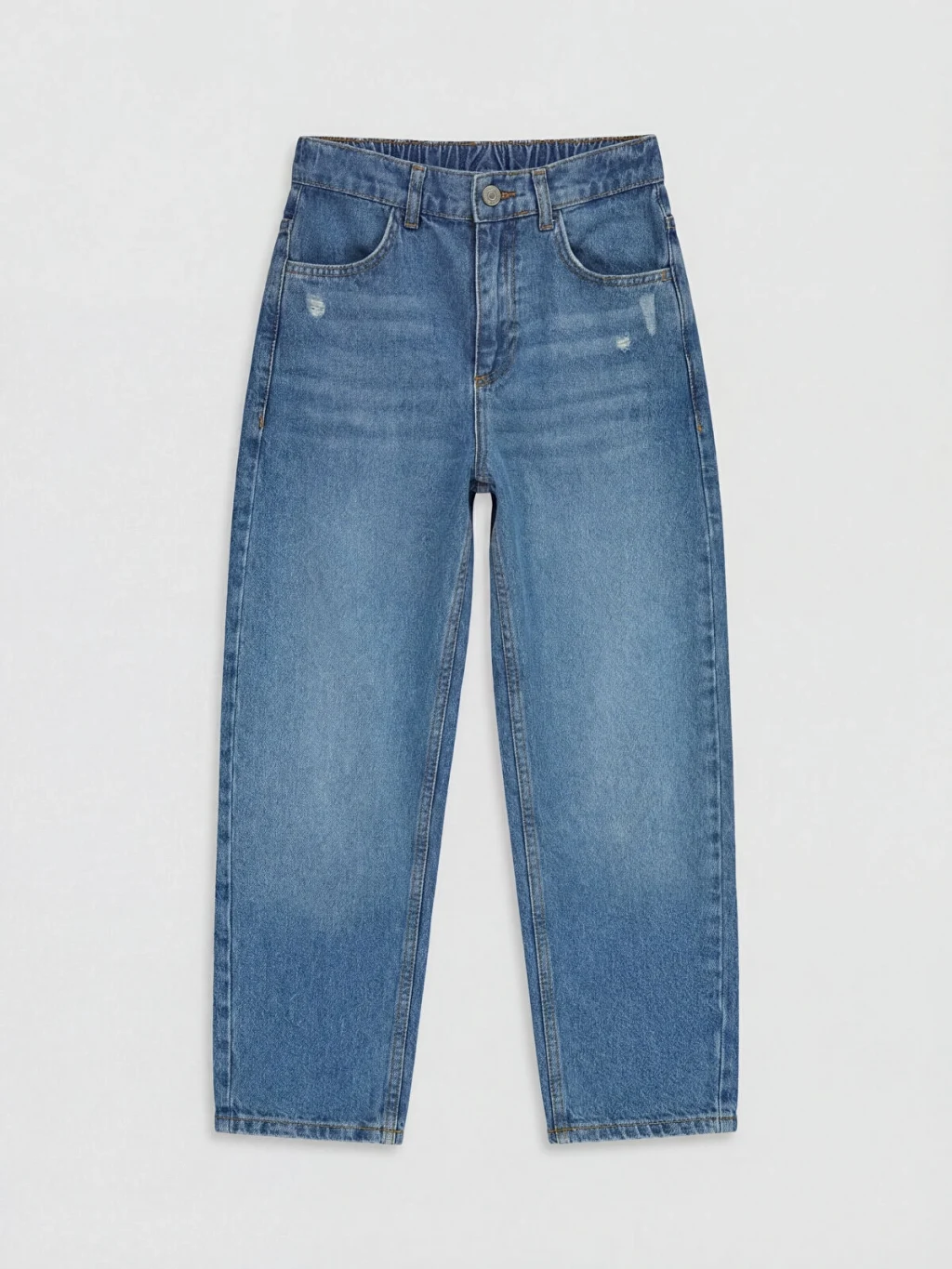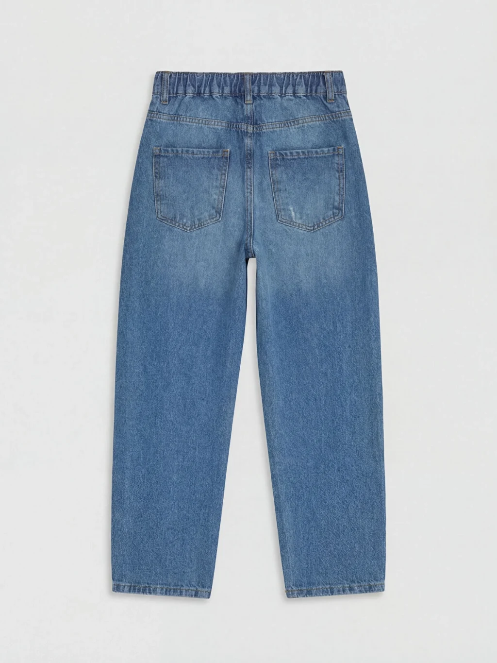 Baggy fit kesimli erkek çocuk jean pantolon, %100 pamuk denim kumaştan üretilmiştir. Beş cepli tasarıma sahiptir, fermuar ve düğme kapamalıdır.