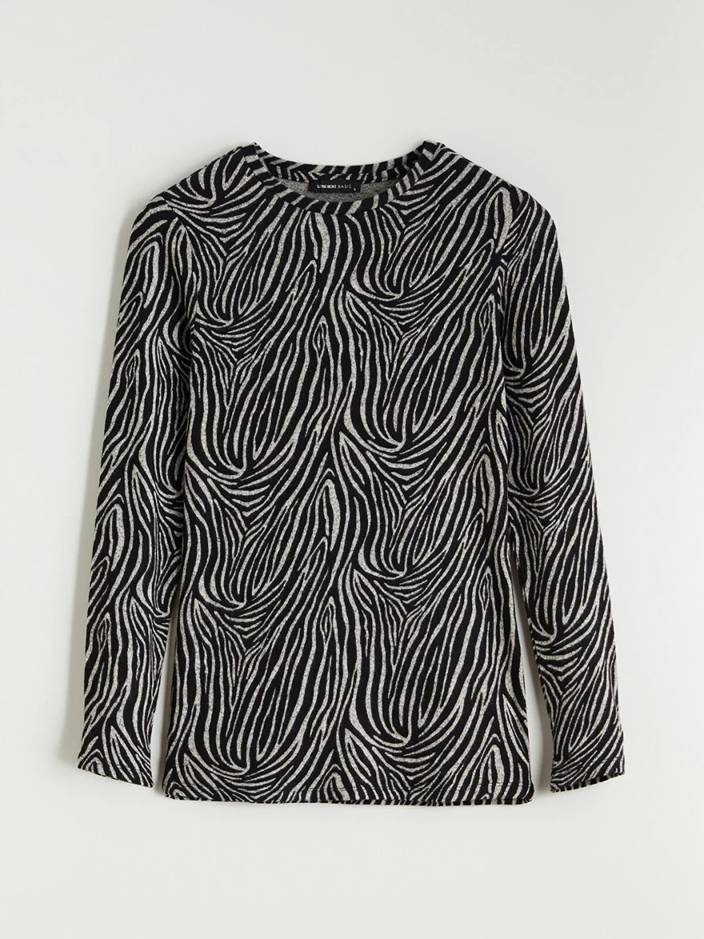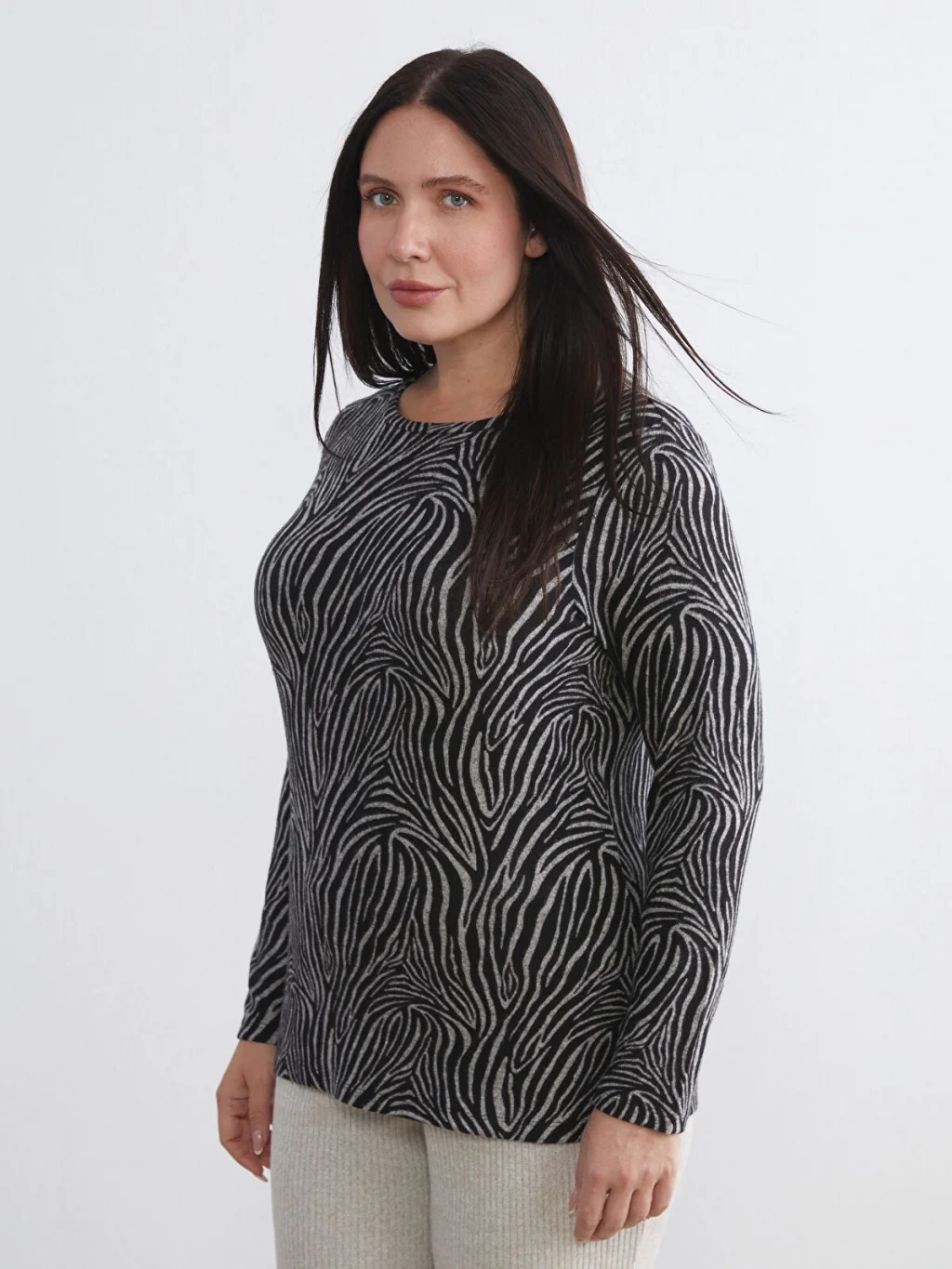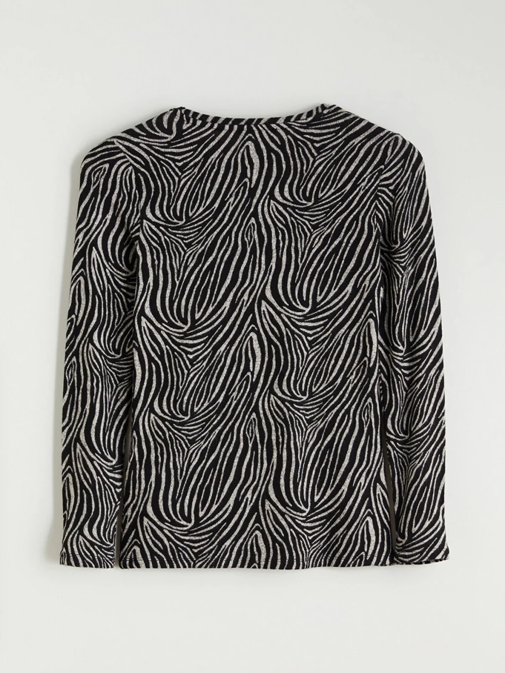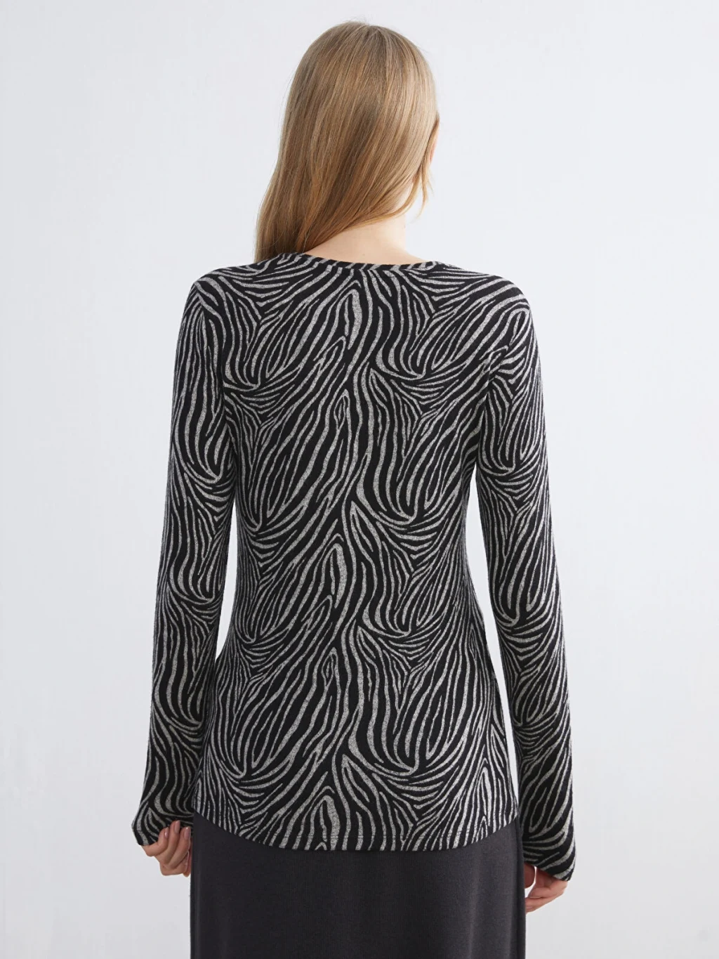 Dar kalıplı, bisiklet yaka ve uzun kollu kadın bluz, tamamı desenli penye kumaştan üretilmiştir.