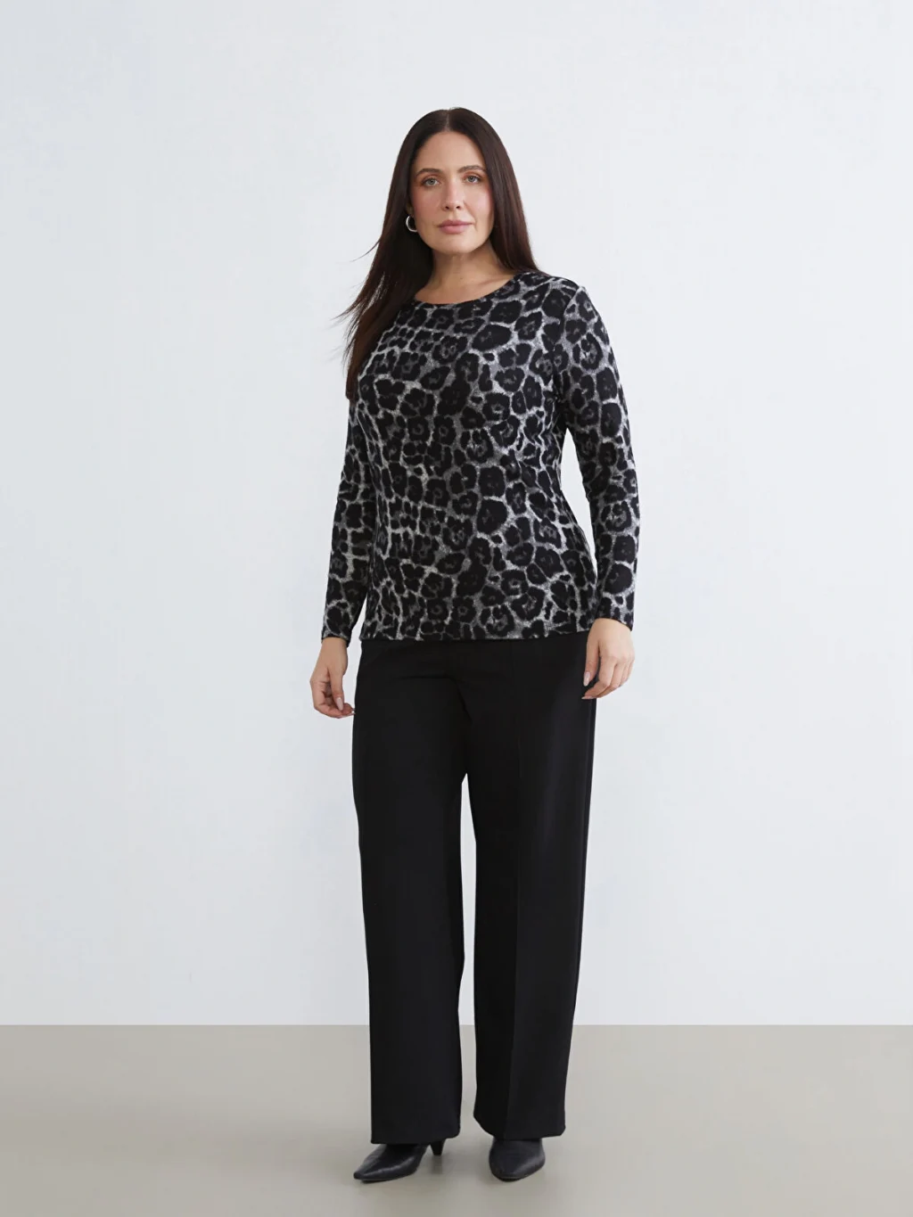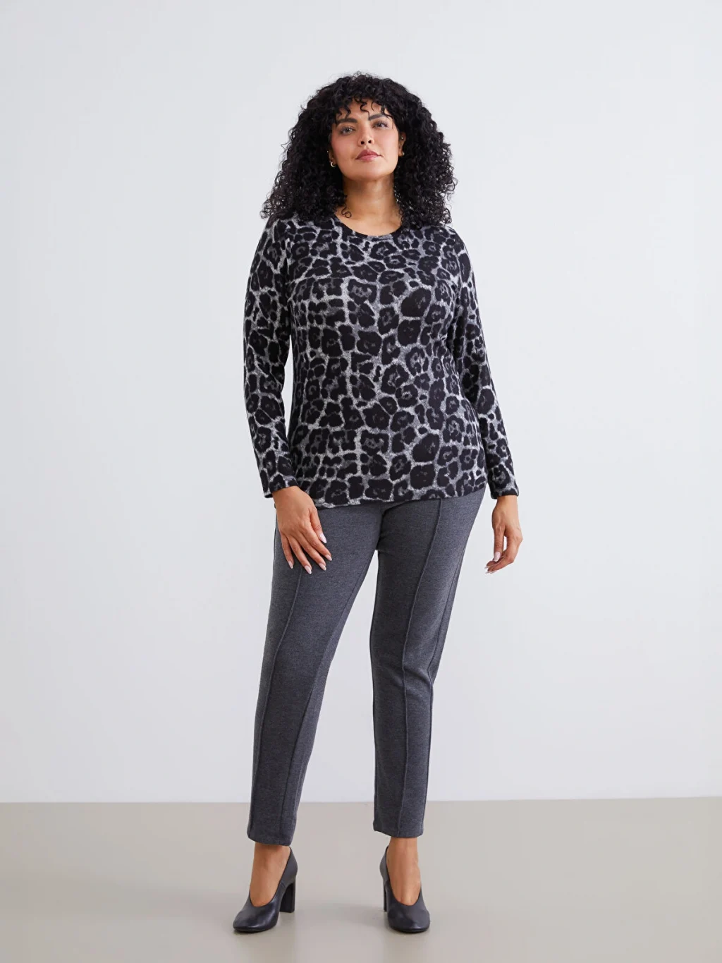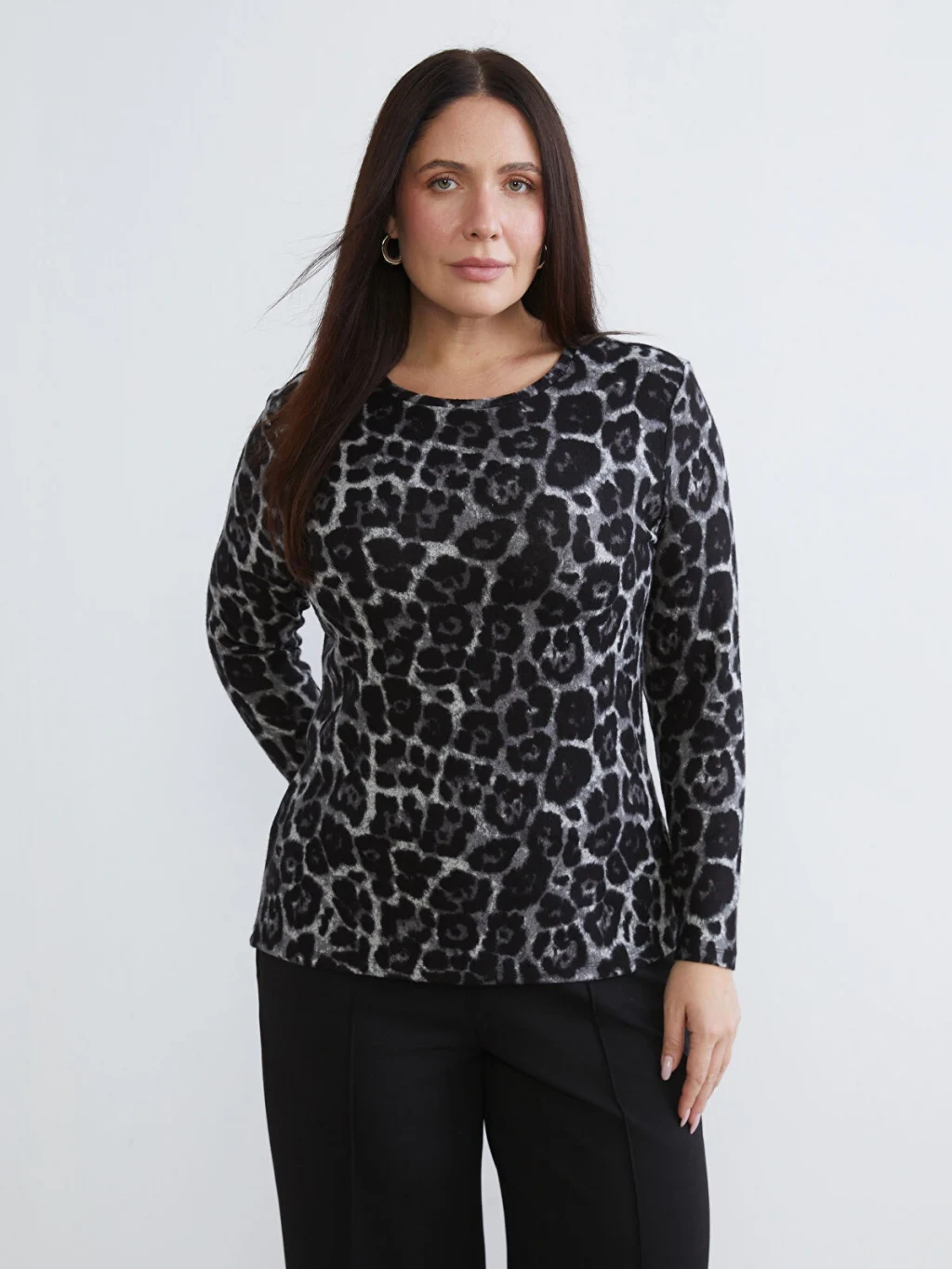 Dar kalıplı, bisiklet yaka ve uzun kollu kadın bluz, tamamı desenli penye kumaştan üretilmiştir.