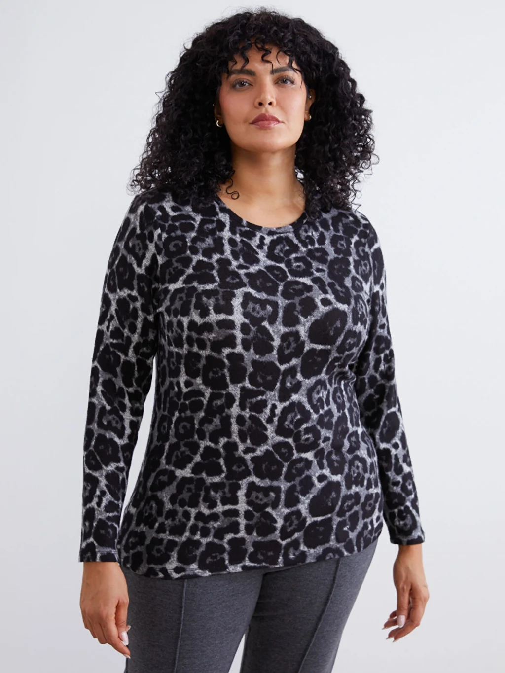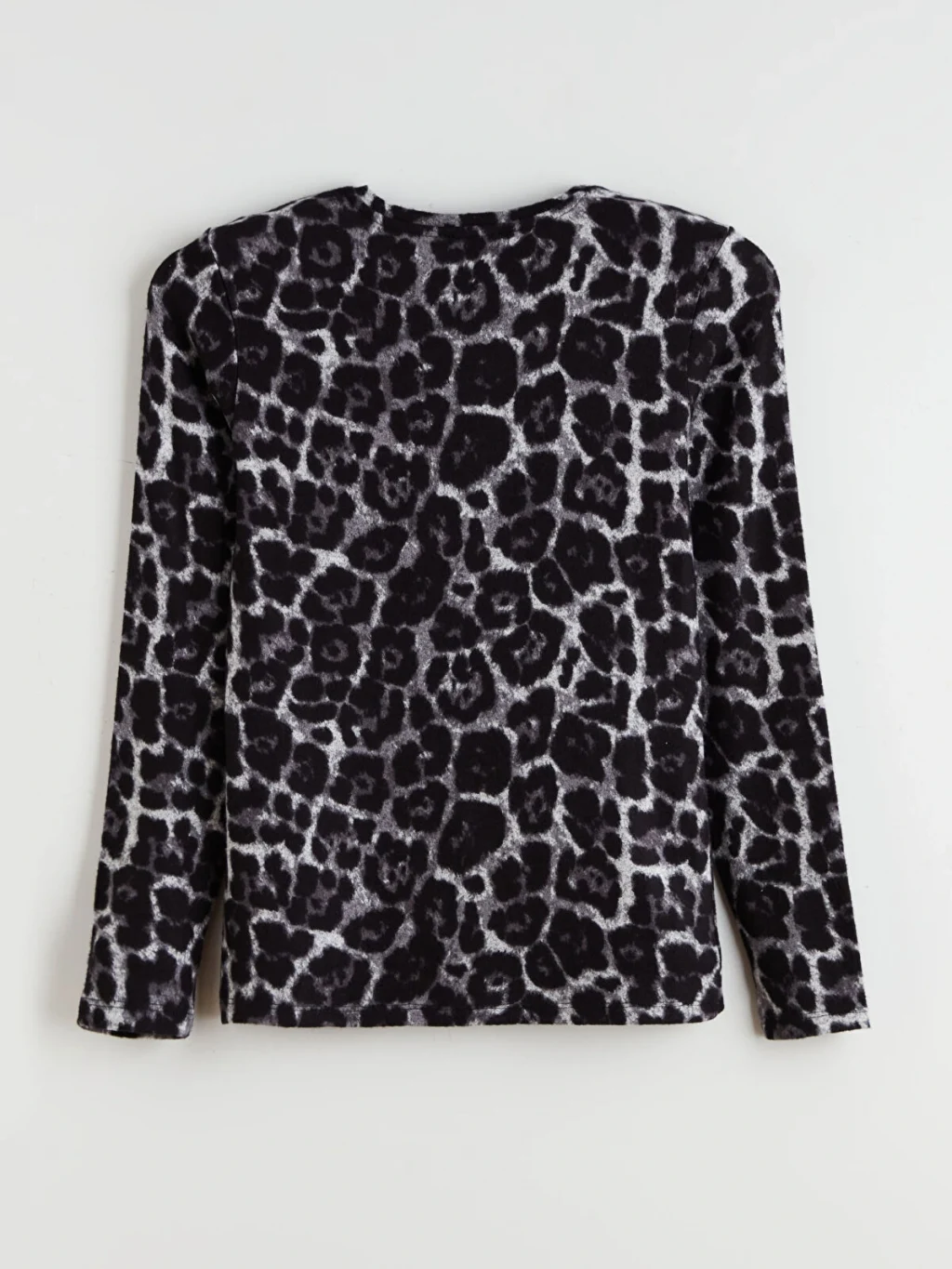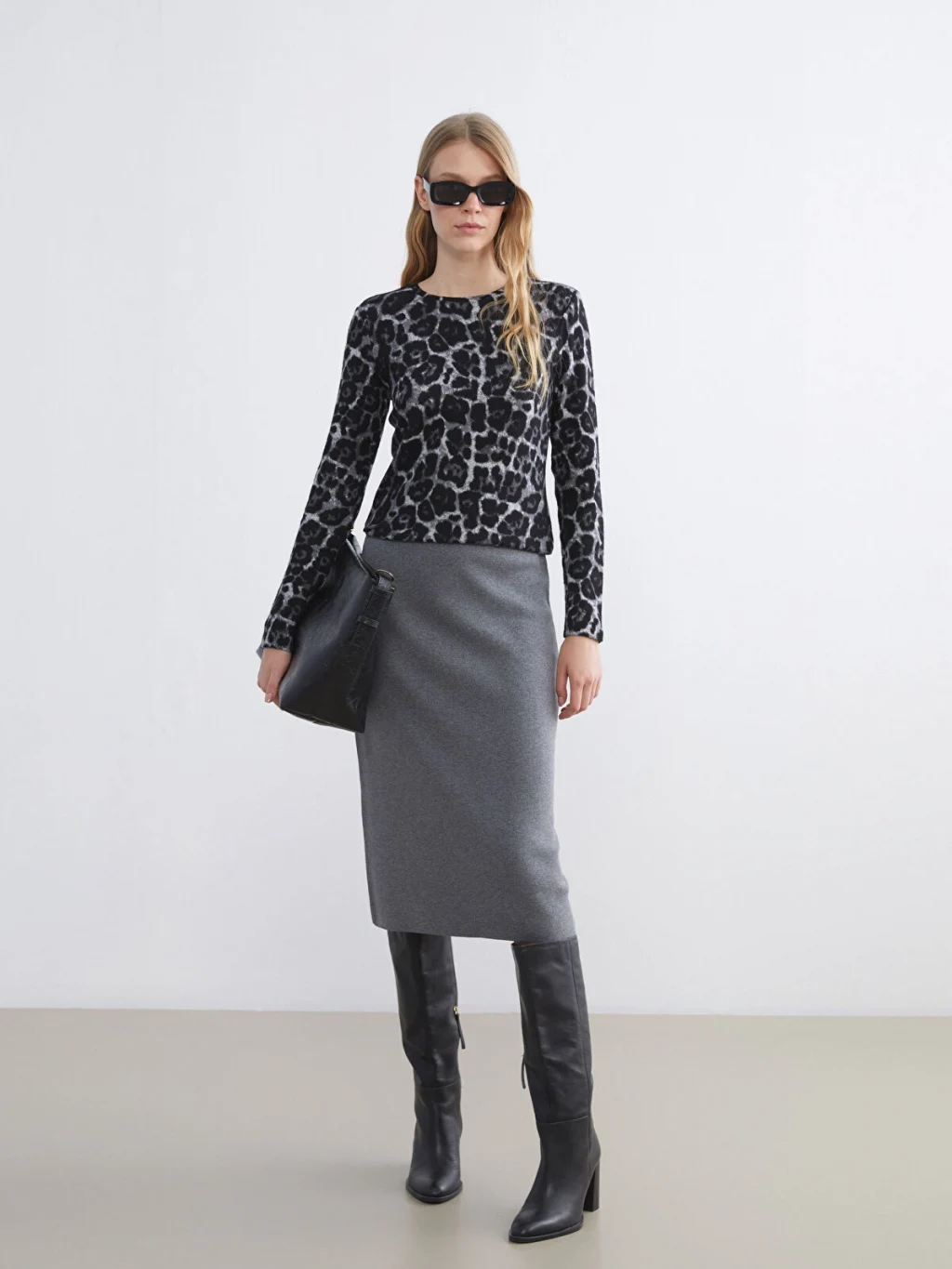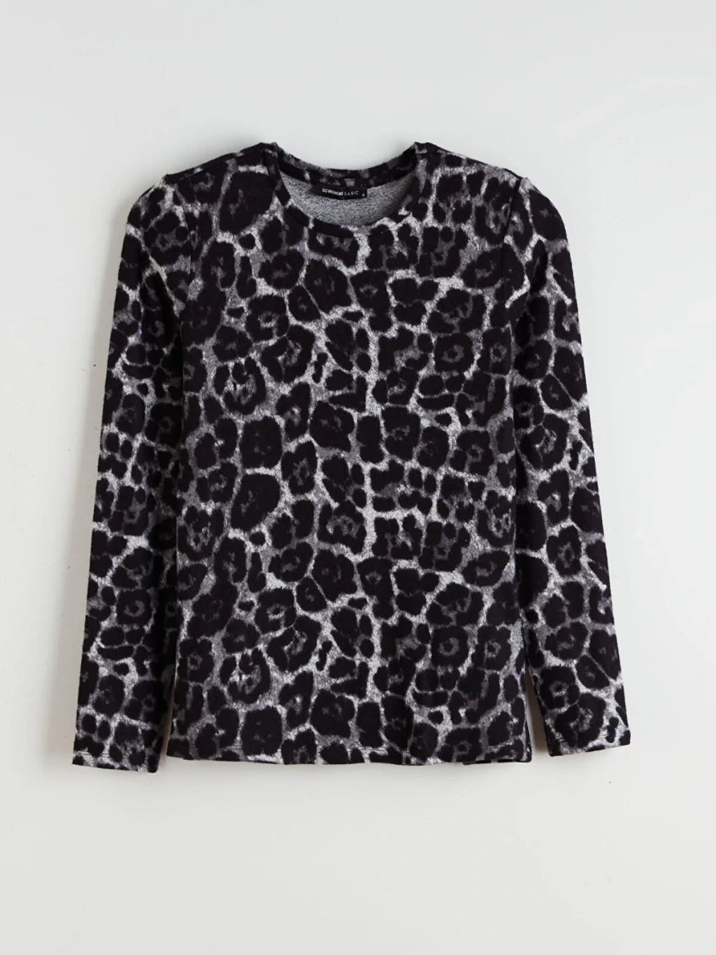 Dar kalıplı, bisiklet yaka ve uzun kollu kadın bluz, tamamı desenli penye kumaştan üretilmiştir.