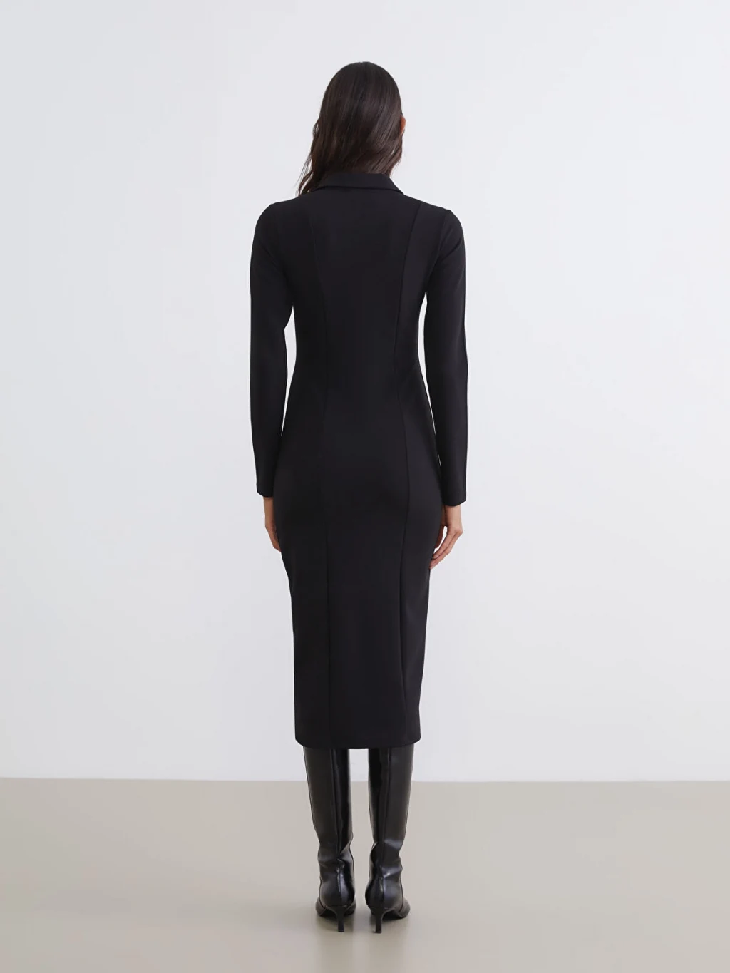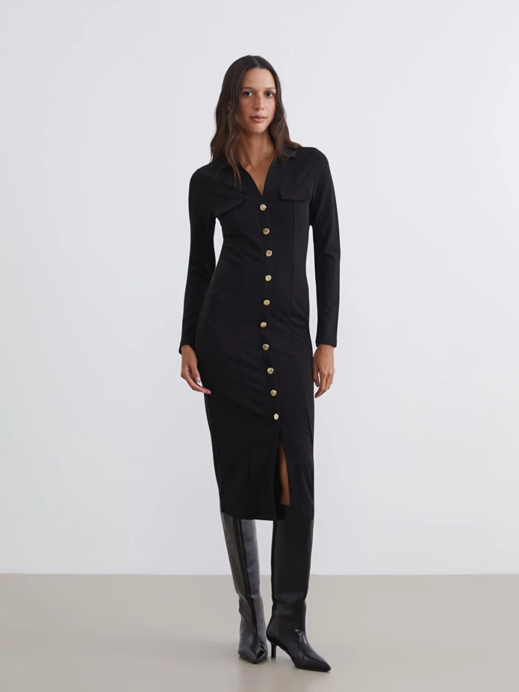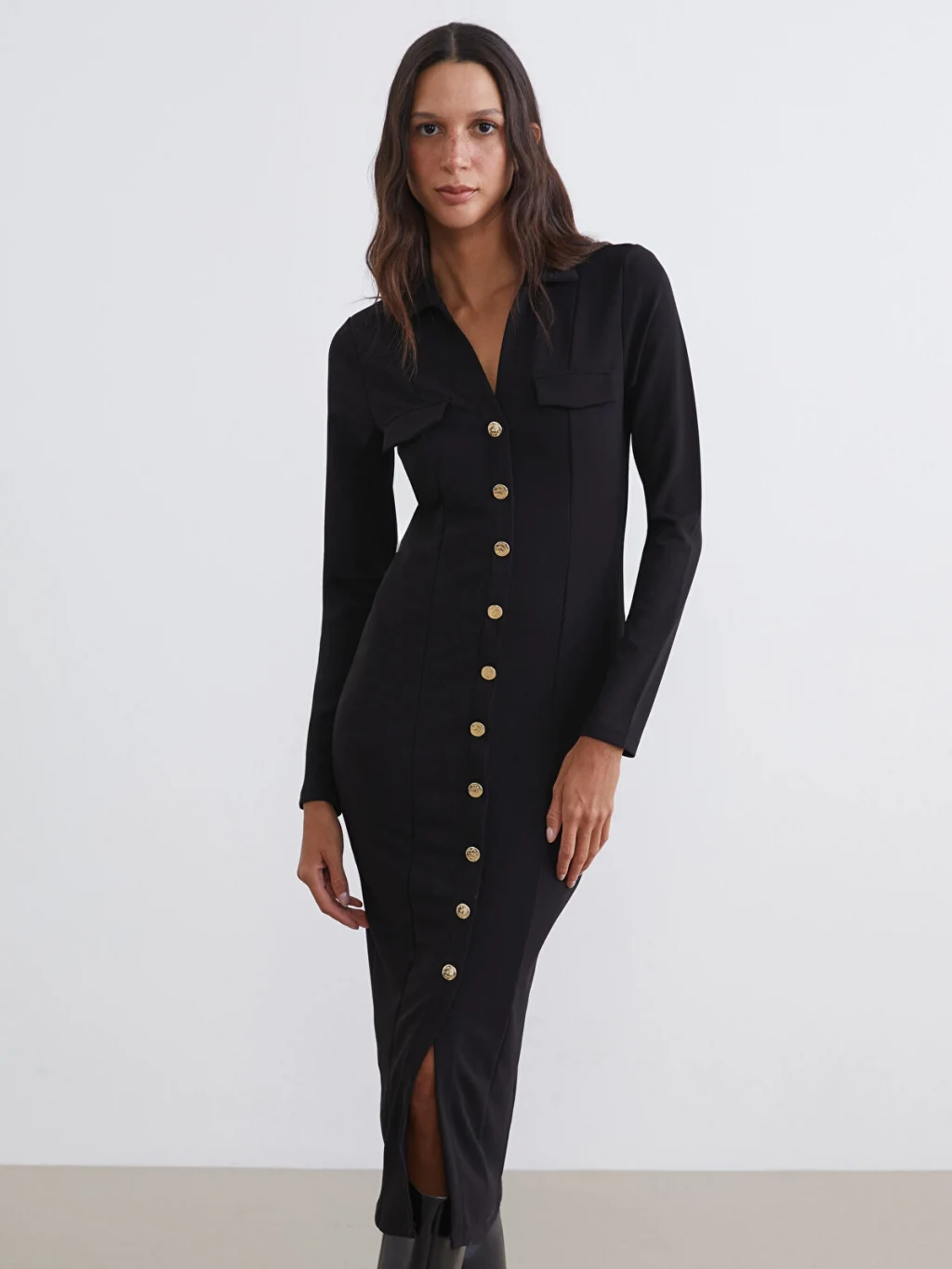 Gömlek yakalı ve uzun kollu kadın elbise, önden düğme kapamalıdır. Göğüs kısmında kapaklı cep detayları ve etek ucunda yırtmacı bulunur.