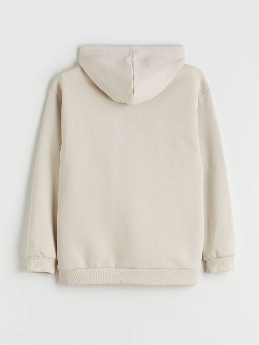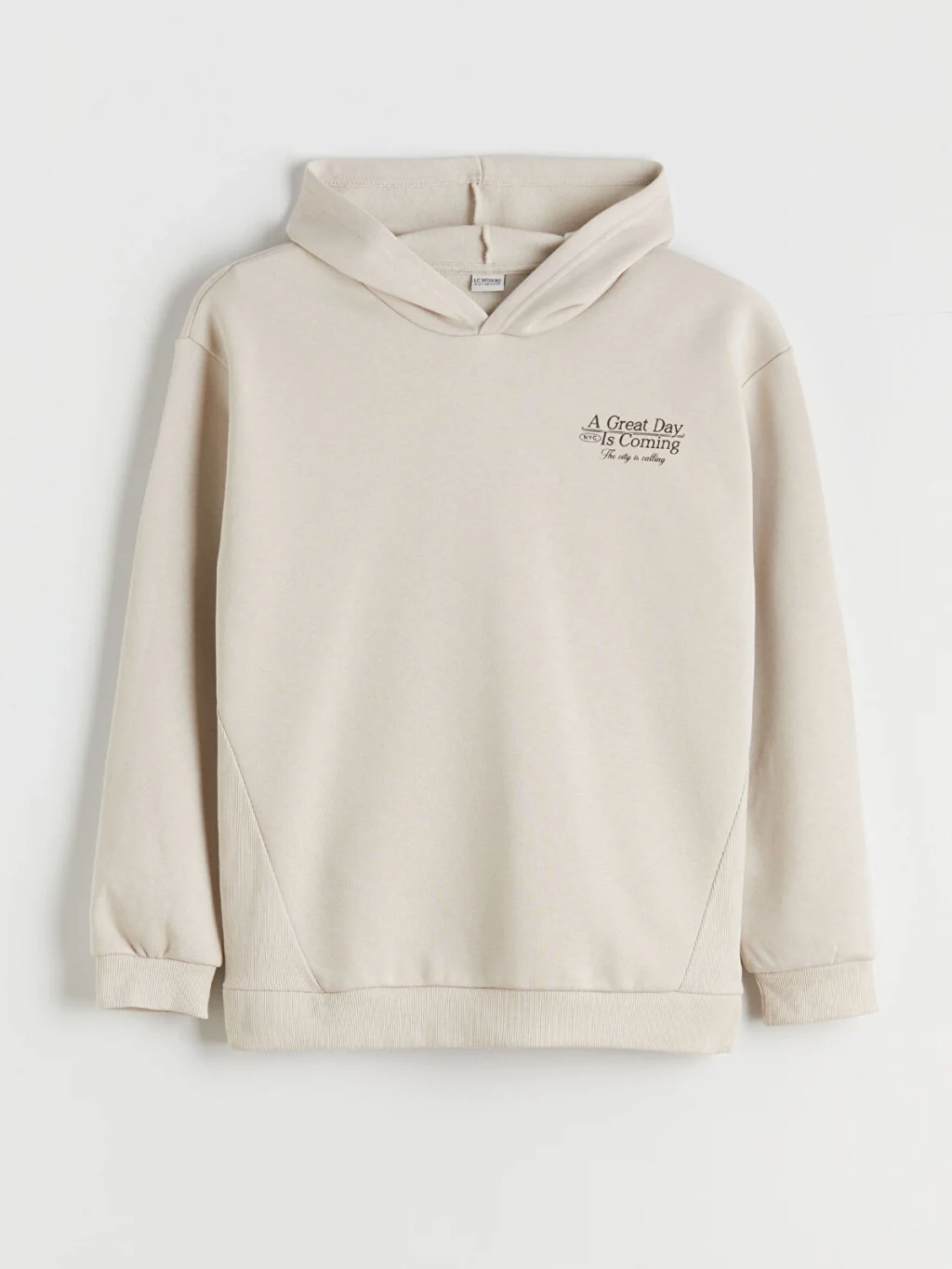 Kapüşonlu ve uzun kollu erkek çocuk sweatshirt, kalın 3 iplik kumaşa sahiptir. Göğsü yazı baskılı olup, kol ve etek ucu ribanalıdır.