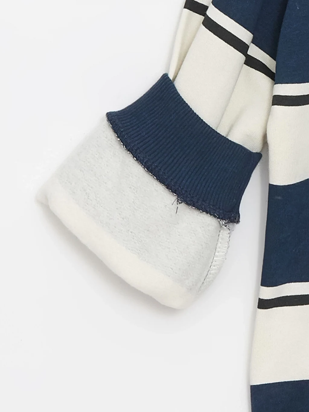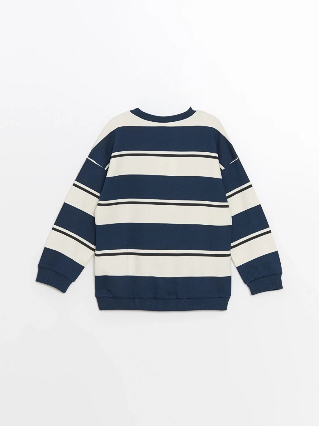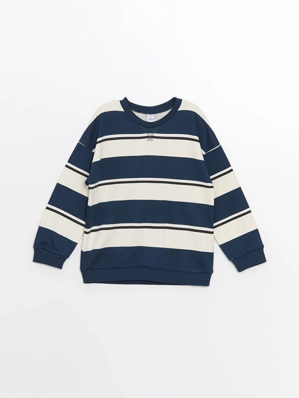 Bisiklet yaka, uzun kollu ve çizgili erkek çocuk sweatshirt, %100 pamuk içerikli 3 iplik şardonlu kalın kumaştan üretilmiştir.