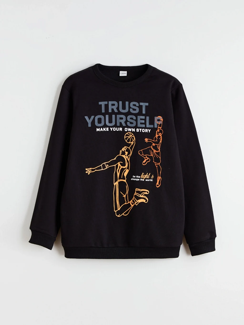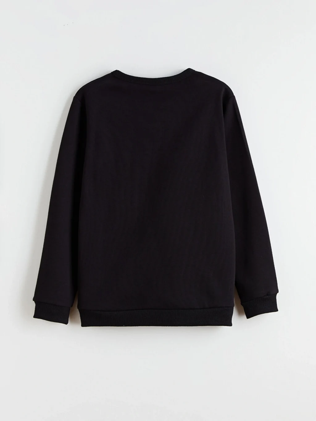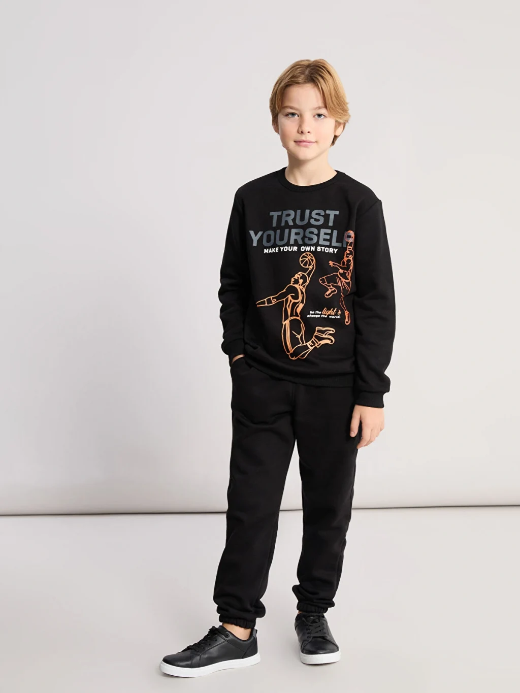 Bisiklet yaka, uzun kollu, baskılı sweatshirt ve paçaları ribanalı eşofman alttan oluşan erkek çocuk takım, 3 iplik şardonlu kumaşa sahiptir.