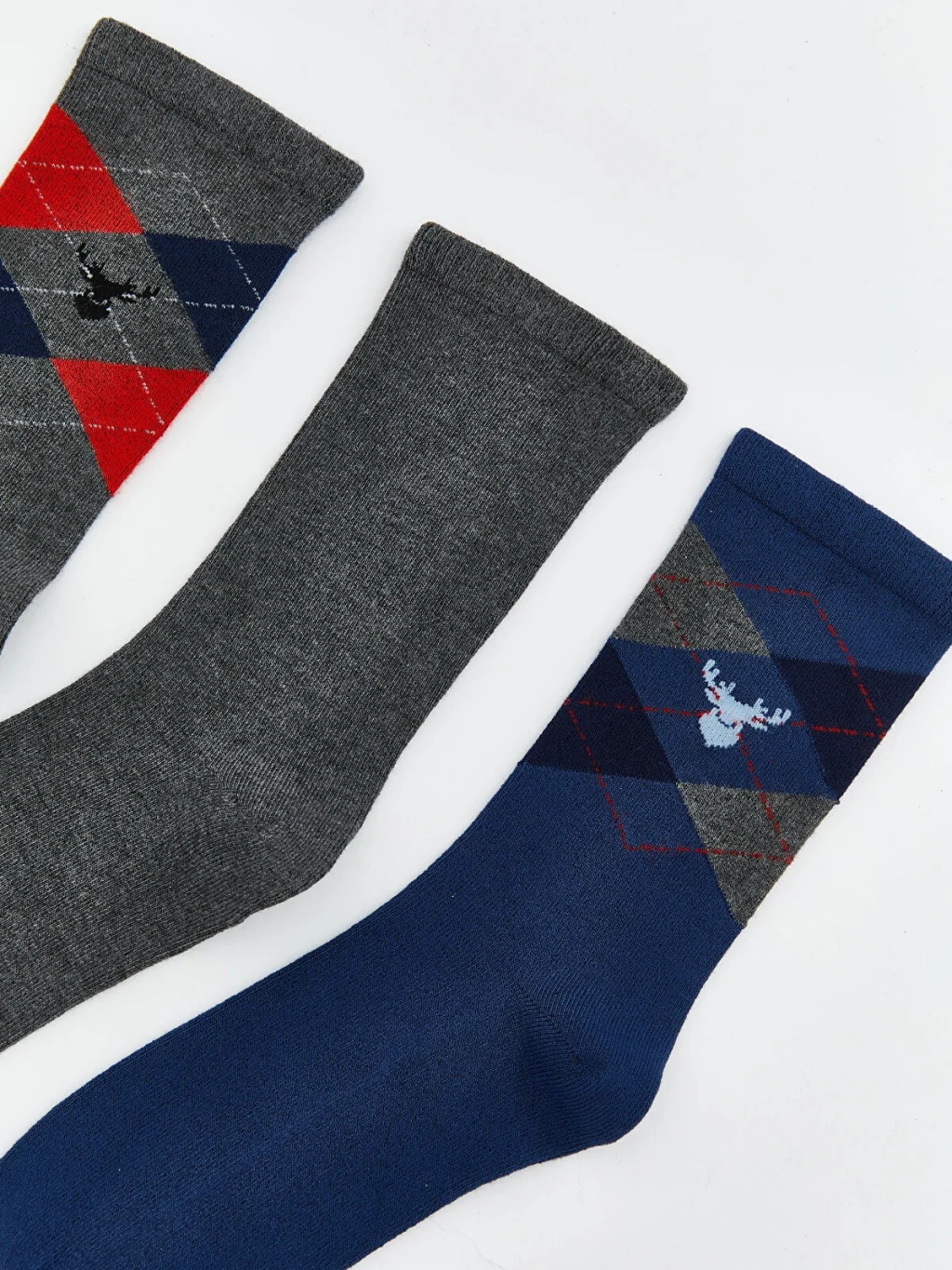 Erkek çocuk için 5'li soket çorap paketi, düz ve baklava desenli modeller içerir. Bazı modellerde figür işlemesi bulunur.