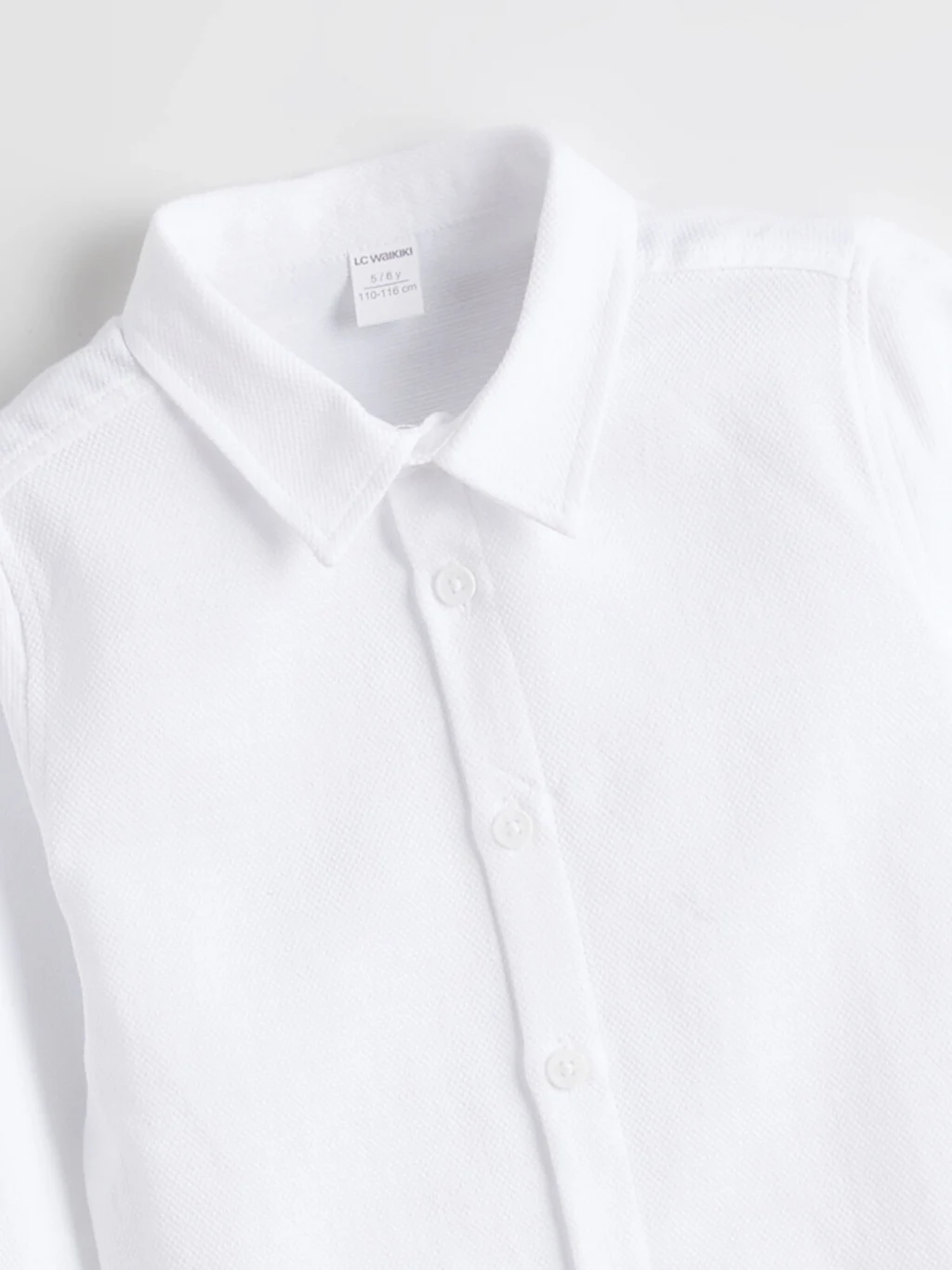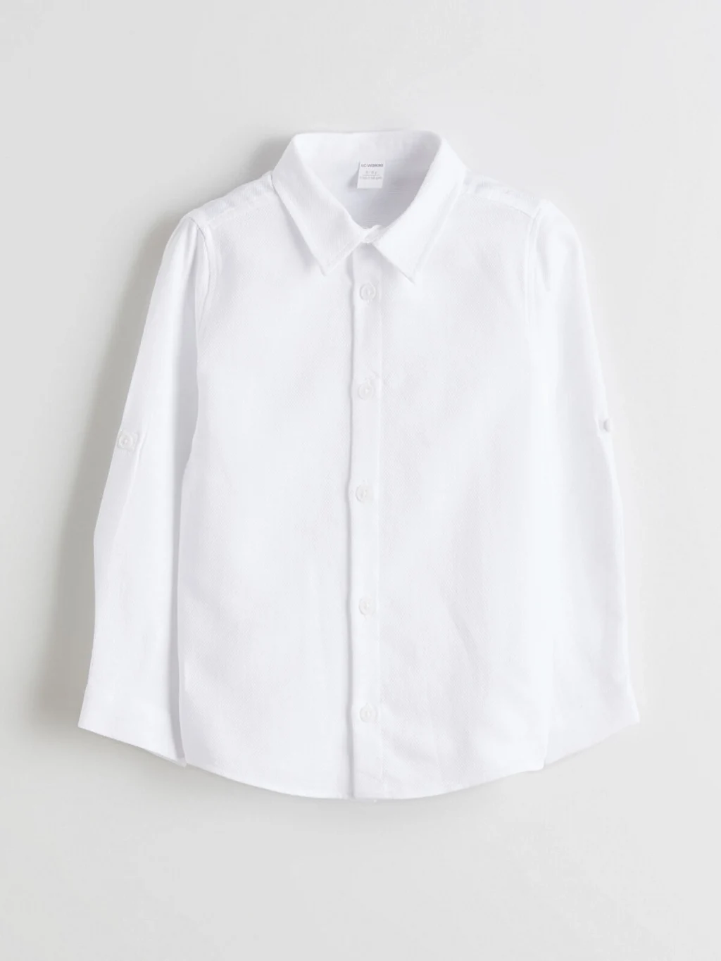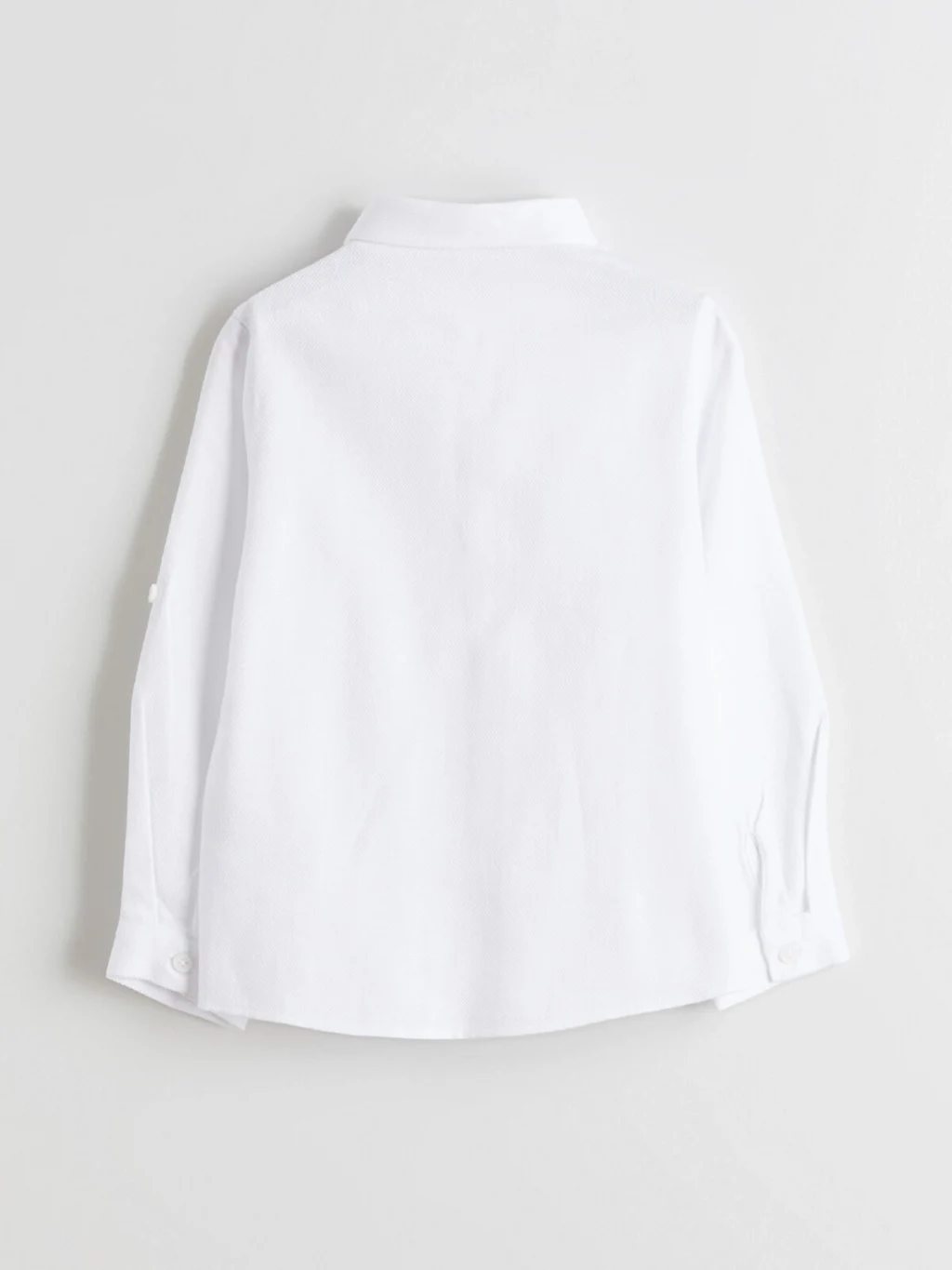 Gömlek yakalı ve uzun kollu erkek çocuk gömlek, %100 pamuklu kumaştan üretilmiştir. Önden düğme kapamalıdır ve kolları katlanabilir özelliktedir.