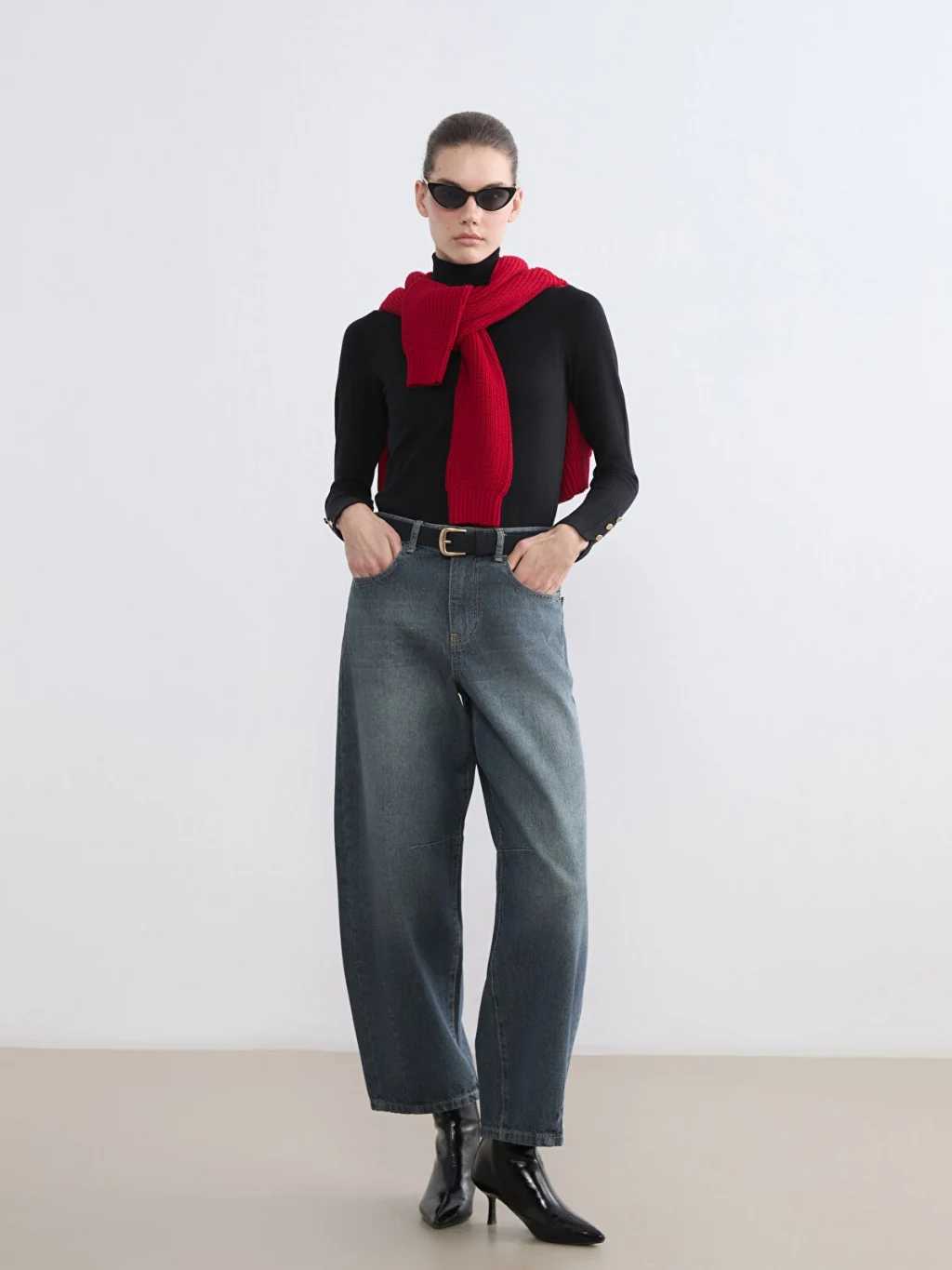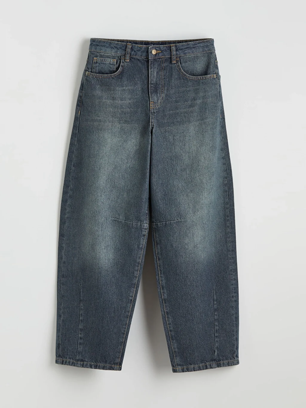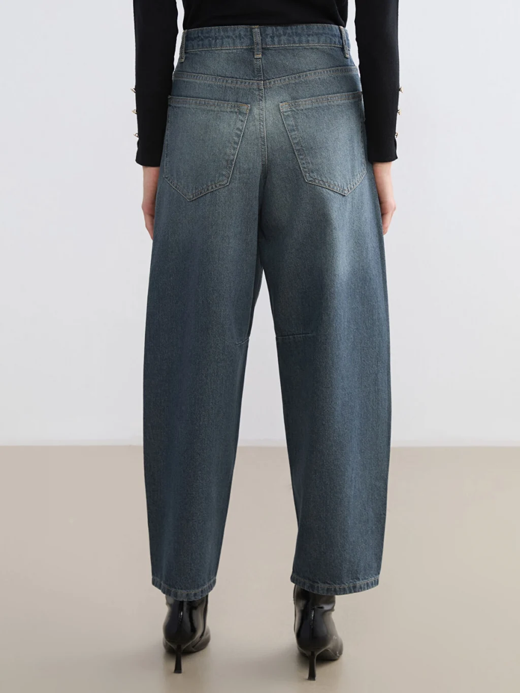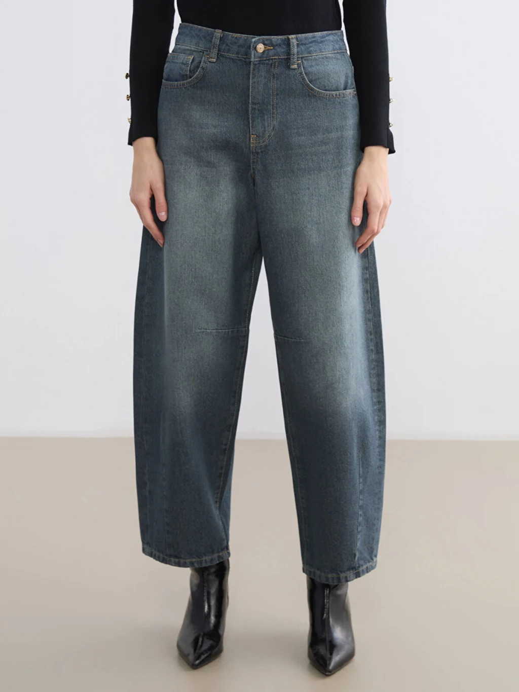 Barrel fit kadın jean pantolon, pamuklu kumaştan üretilmiştir, beş cepli tasarıma sahip olup fermuar ve düğme kapamalıdır.