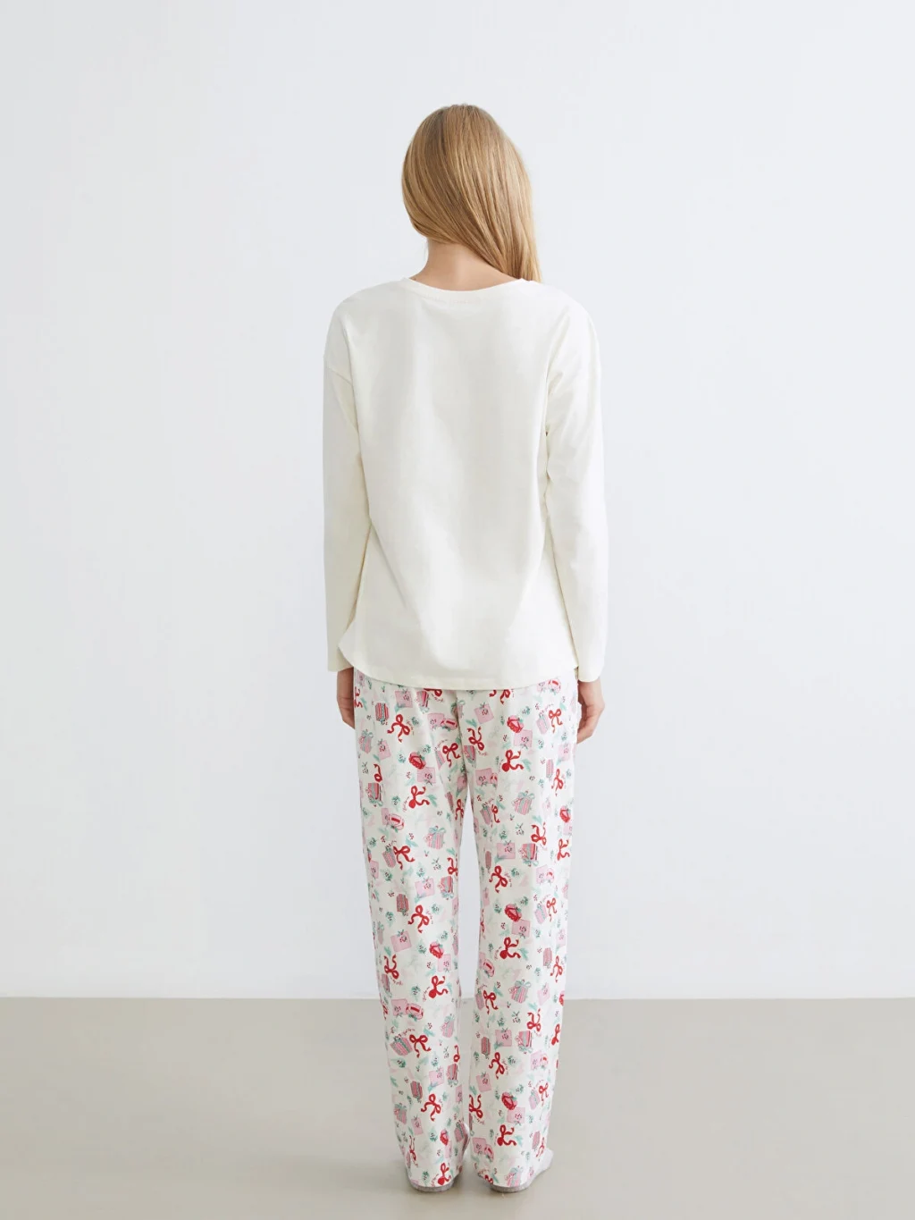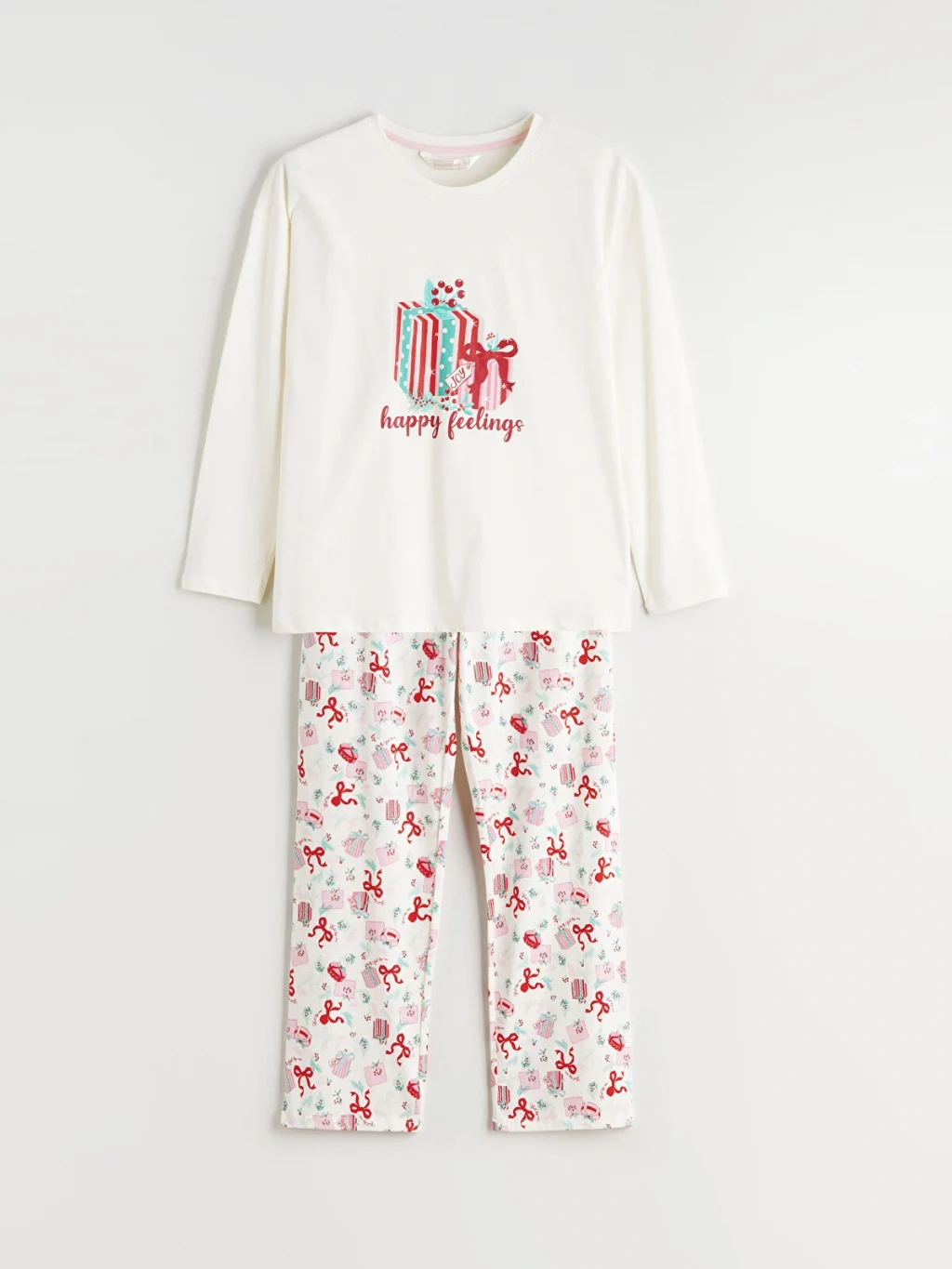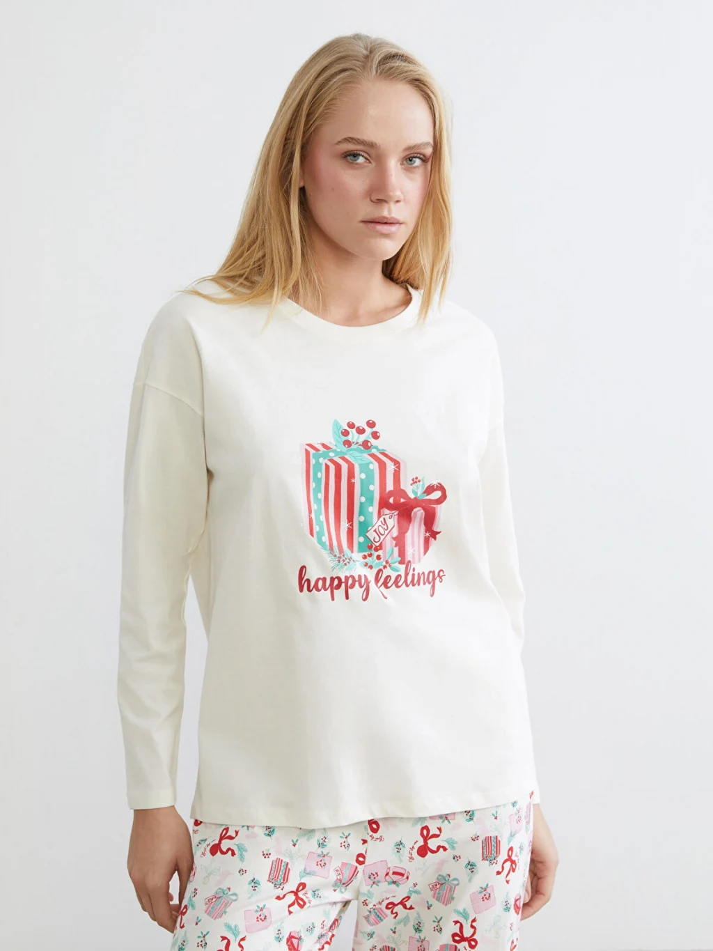 %100 pamuk penye kumaştan üretilen kadın pijama takımı, bisiklet yaka, uzun kollu baskılı üst ve desenli uzun alt parçadan oluşur.