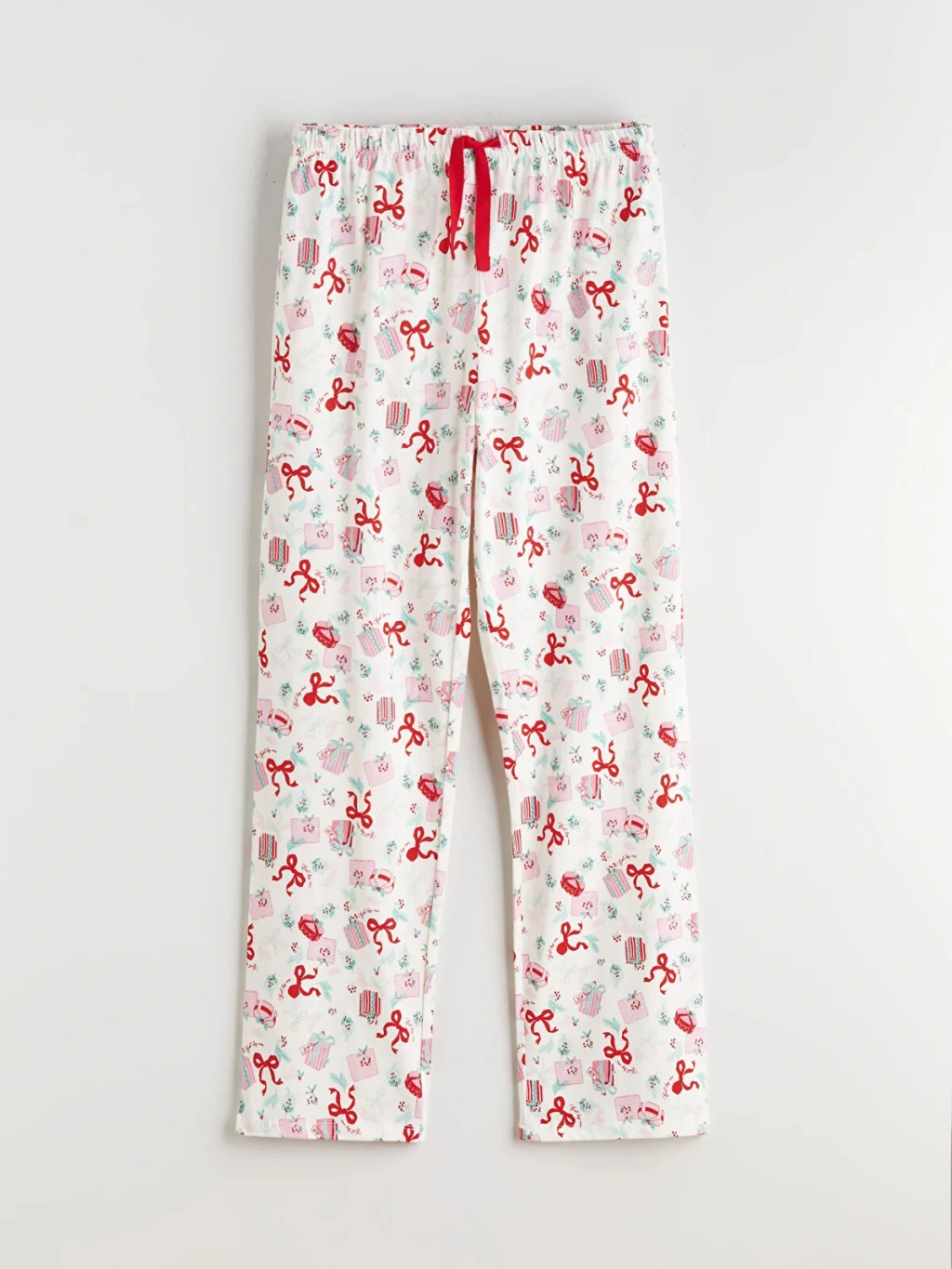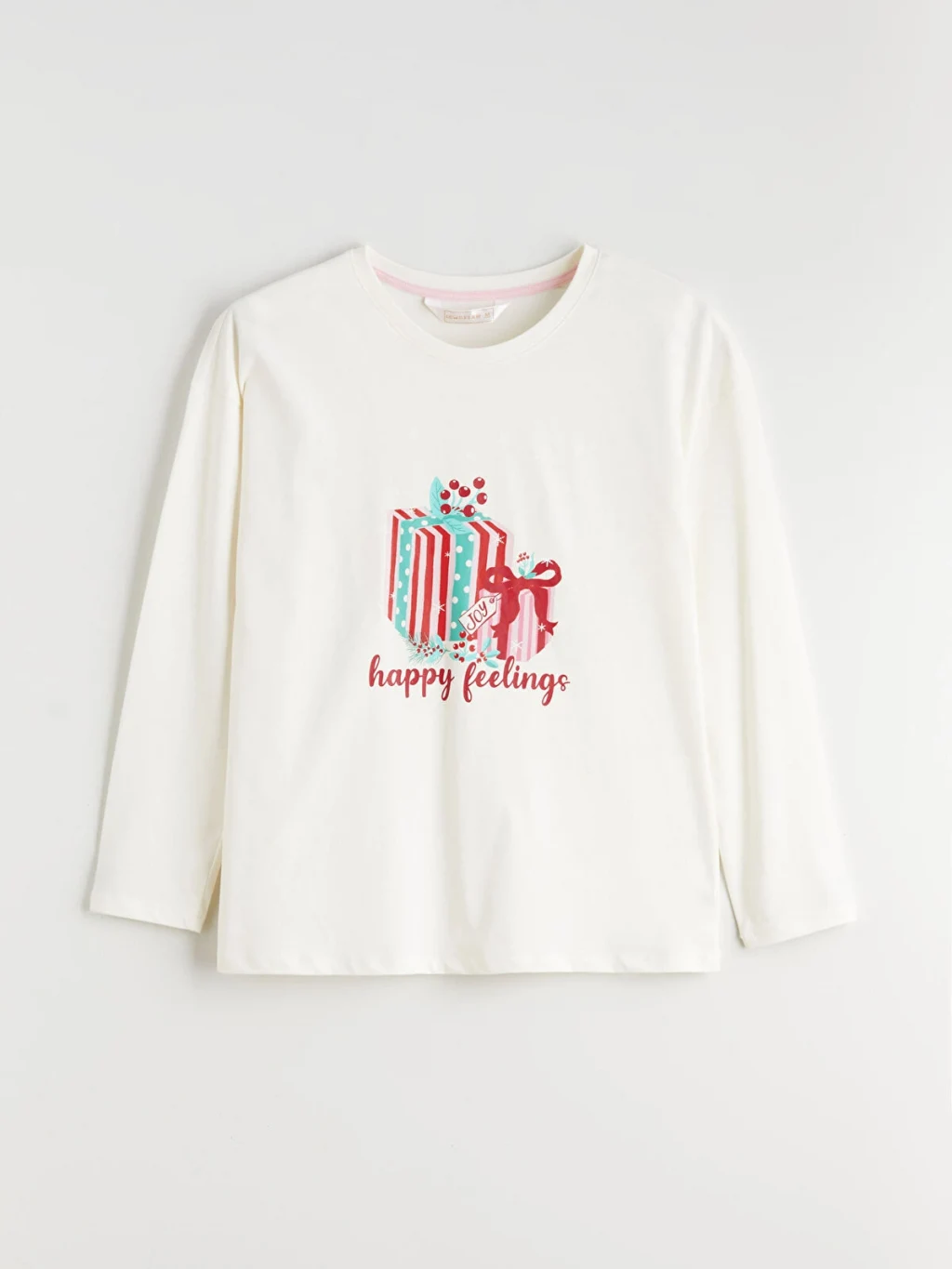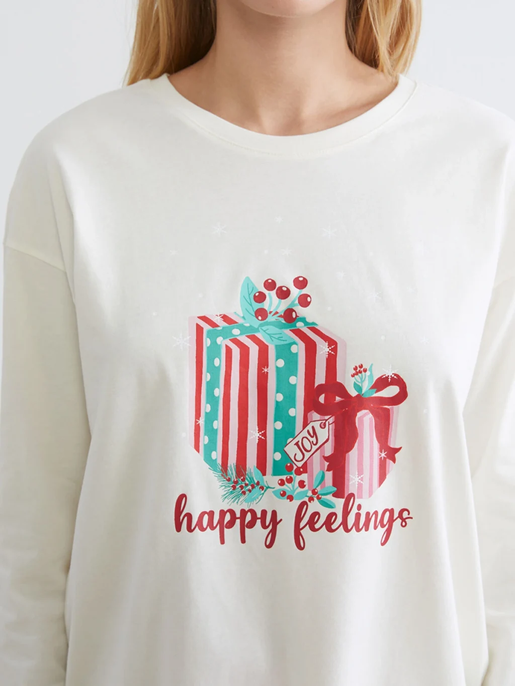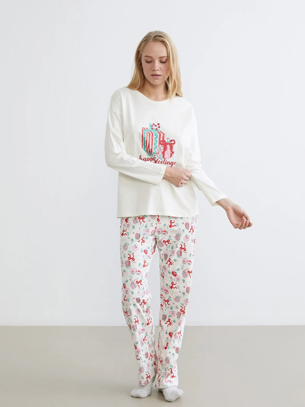 %100 pamuk penye kumaştan üretilen kadın pijama takımı, bisiklet yaka, uzun kollu baskılı üst ve desenli uzun alt parçadan oluşur.