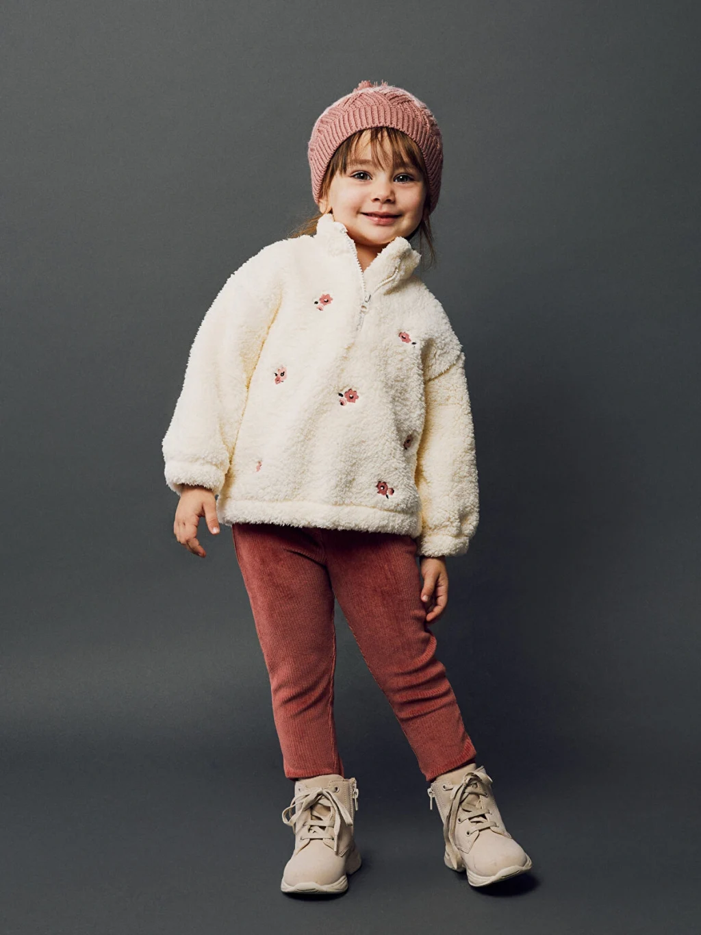 Kalın kadife kumaştan üretilmiş kız çocuk eşofman altı. Beli lastikli ve ön cepli tasarıma sahiptir.
