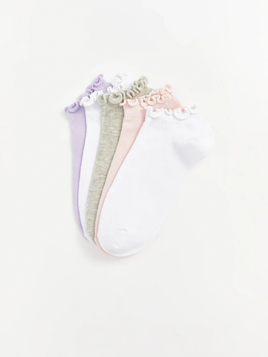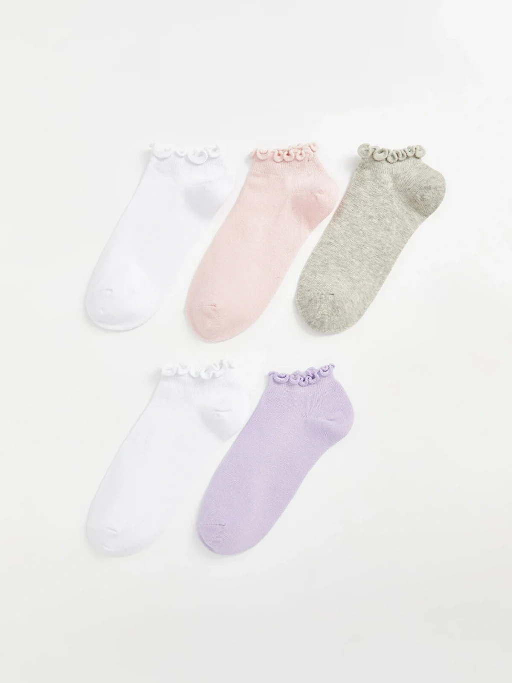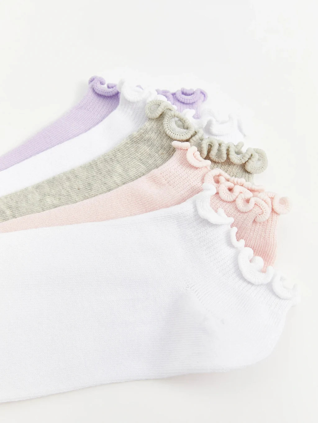 Beş çiftten oluşan kız çocuk patik çorap seti, bilek kısmında bulunan fırfır detayı ile tasarlanmıştır.