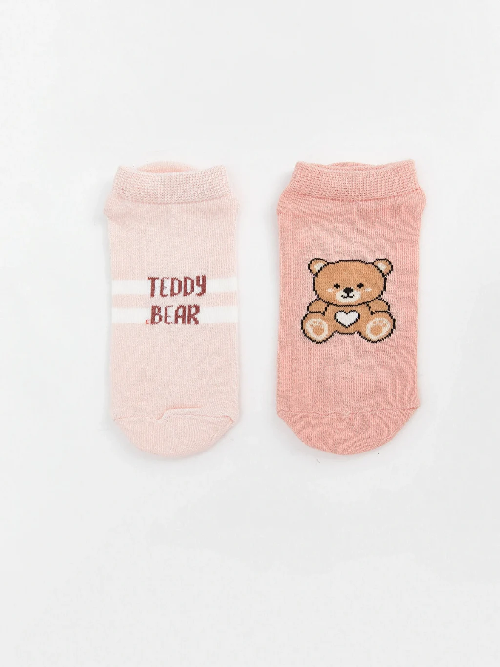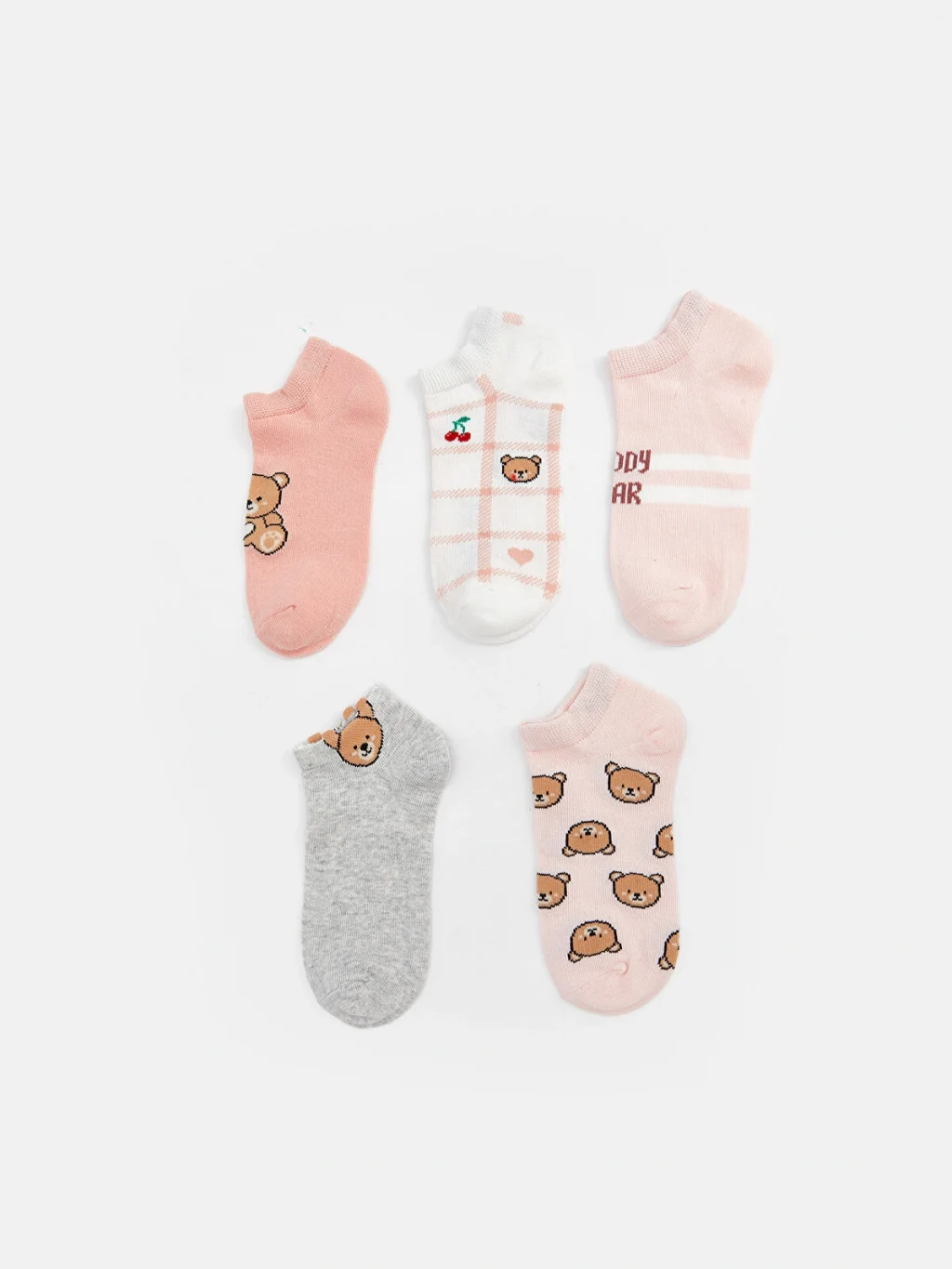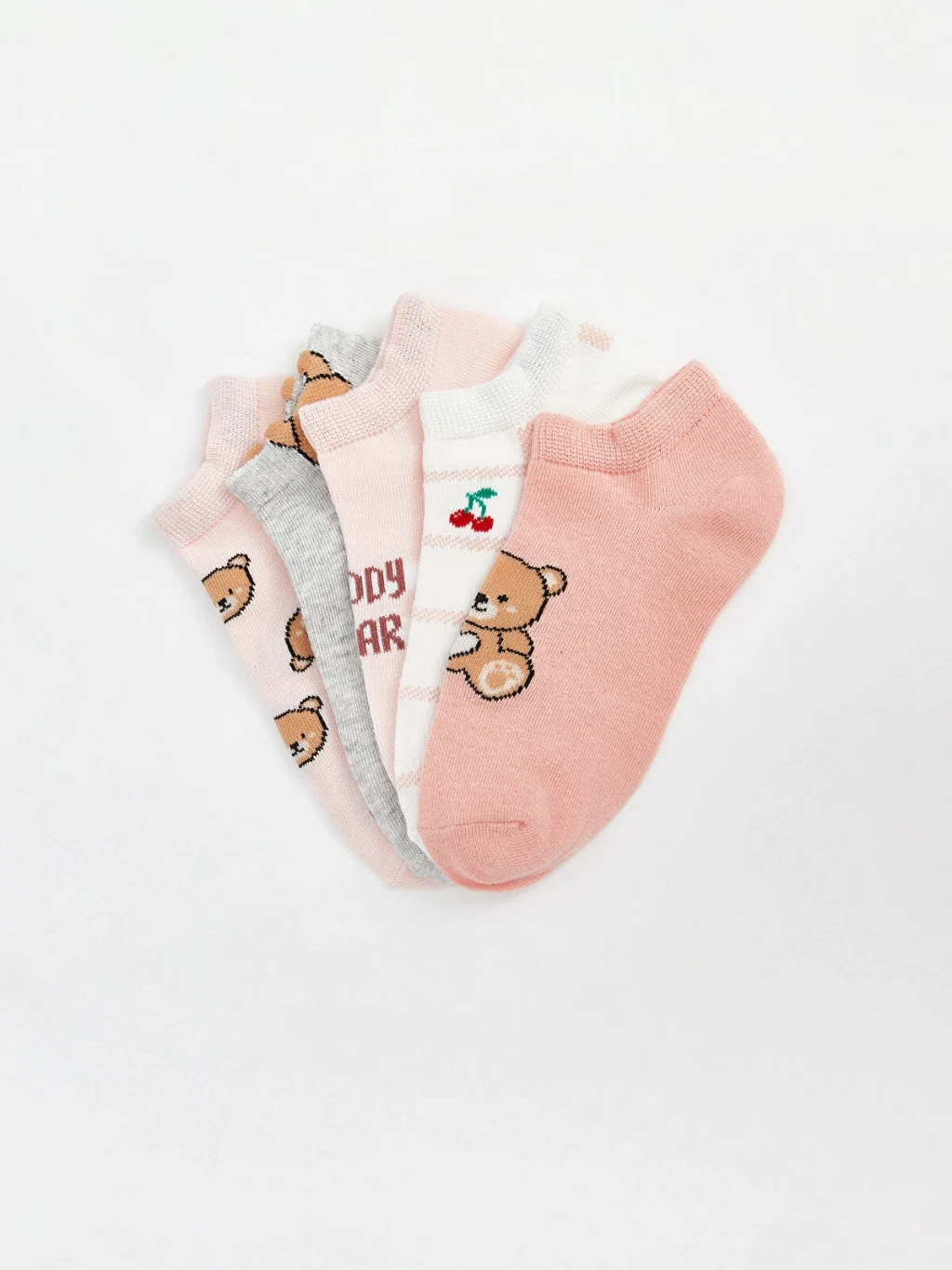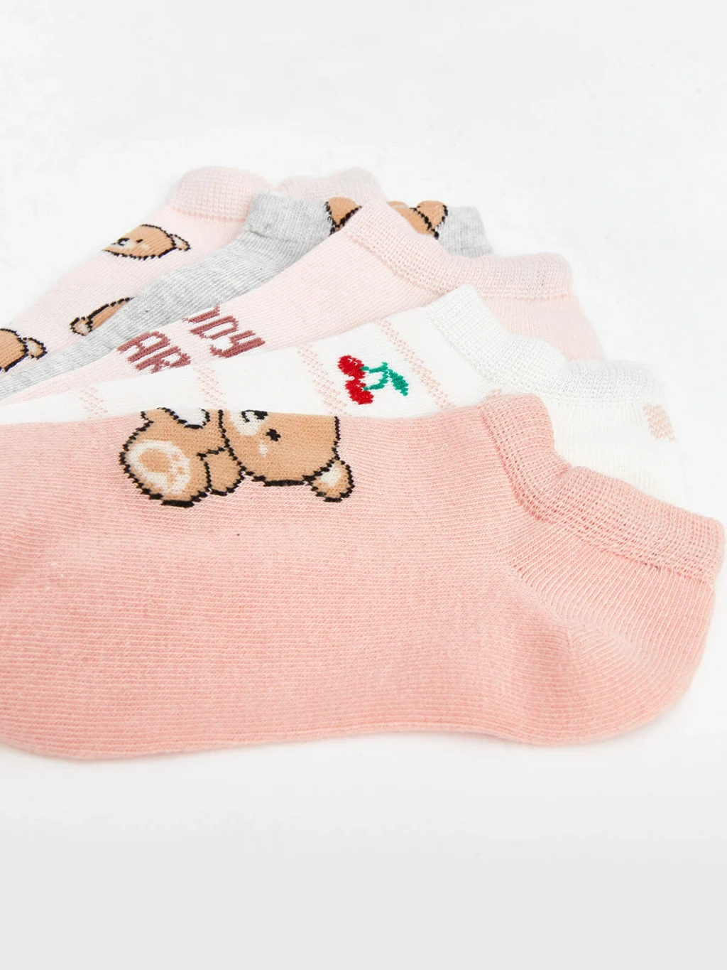 Beş çiftten oluşan kız çocuk patik çorap seti, ayıcık, kiraz ve ekose gibi farklı desenlere sahiptir.
