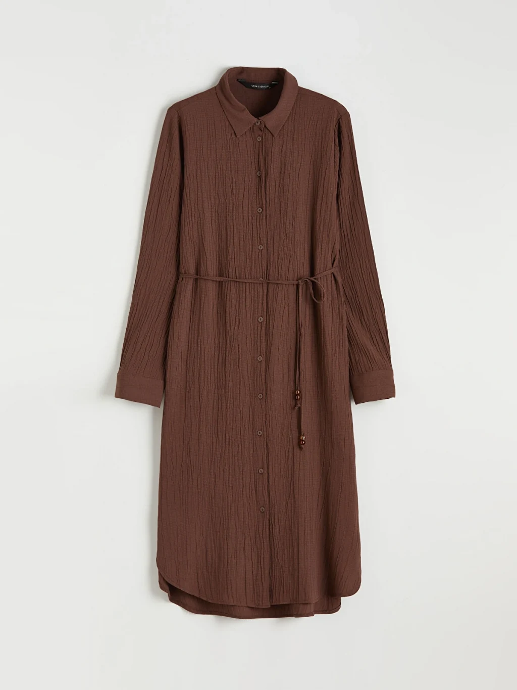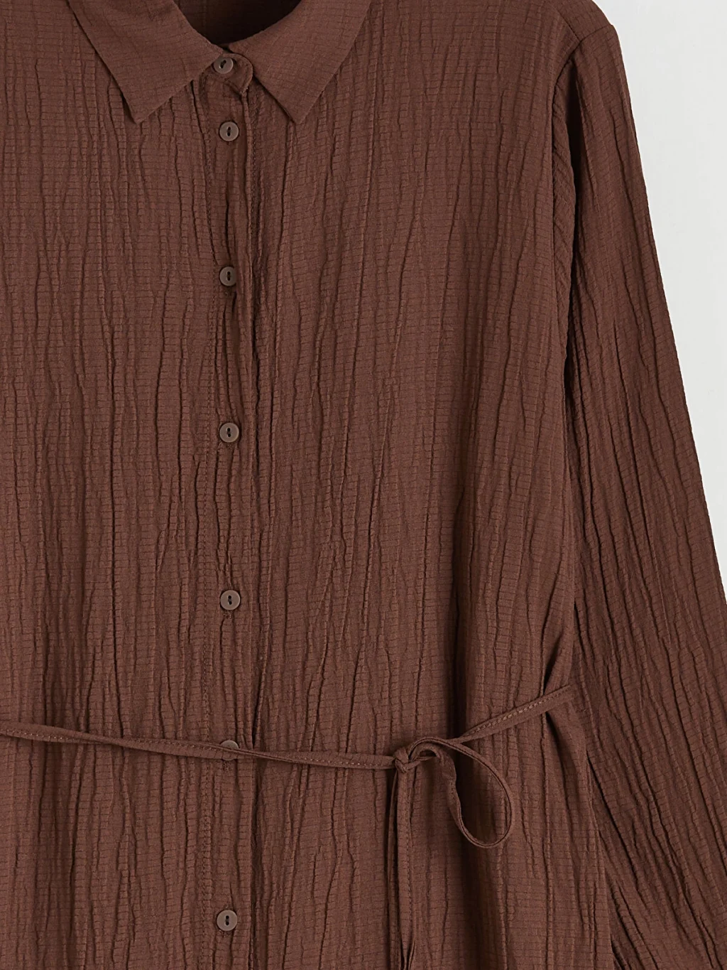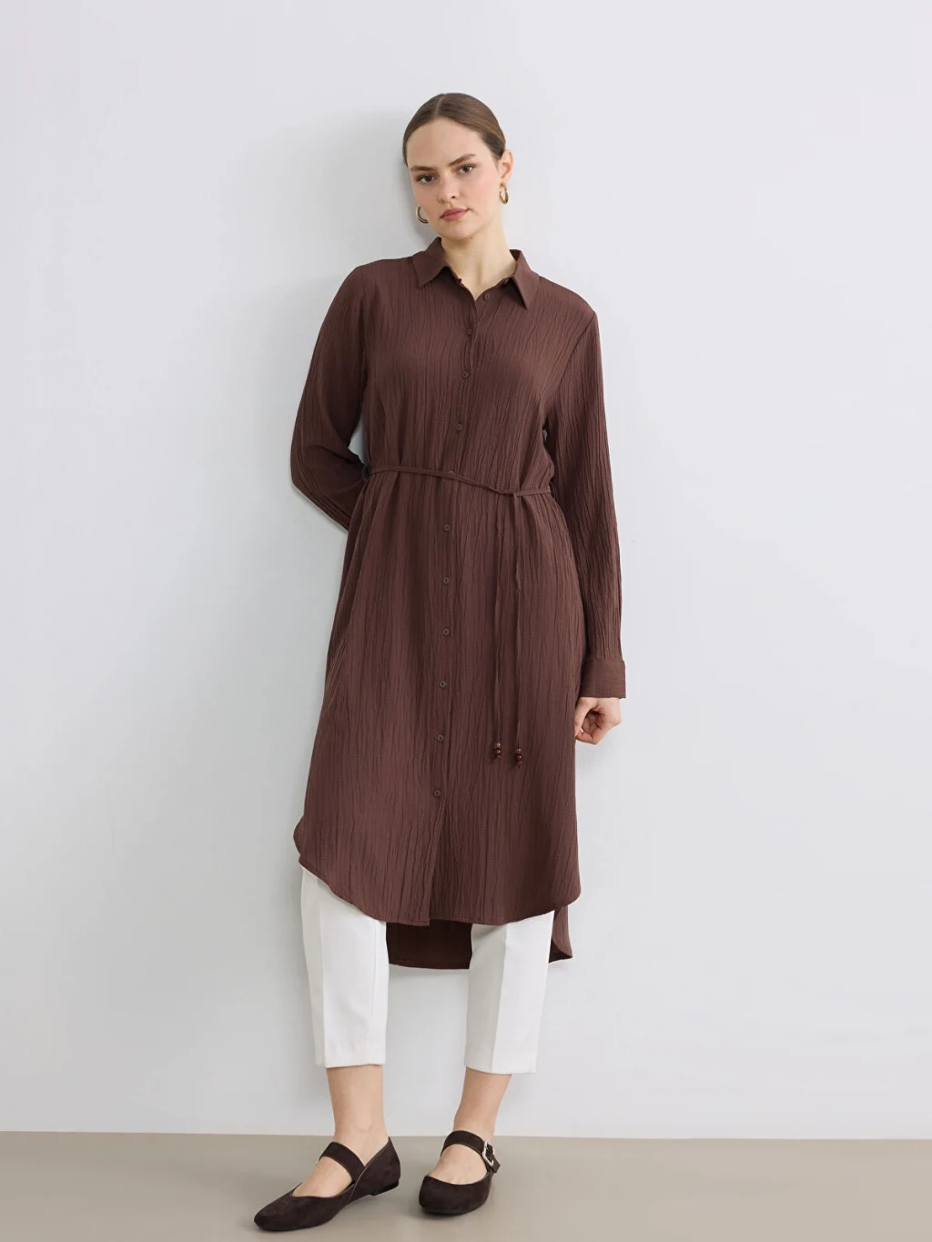 Kadın gömlek tunik, yakalı ve uzun kolludur. Önden düğme kapamalı ve beli kuşaklıdır.