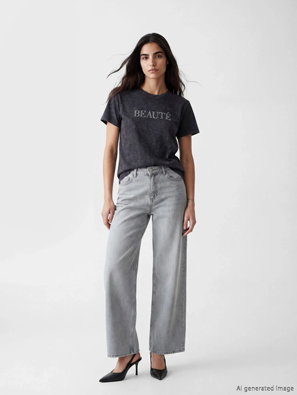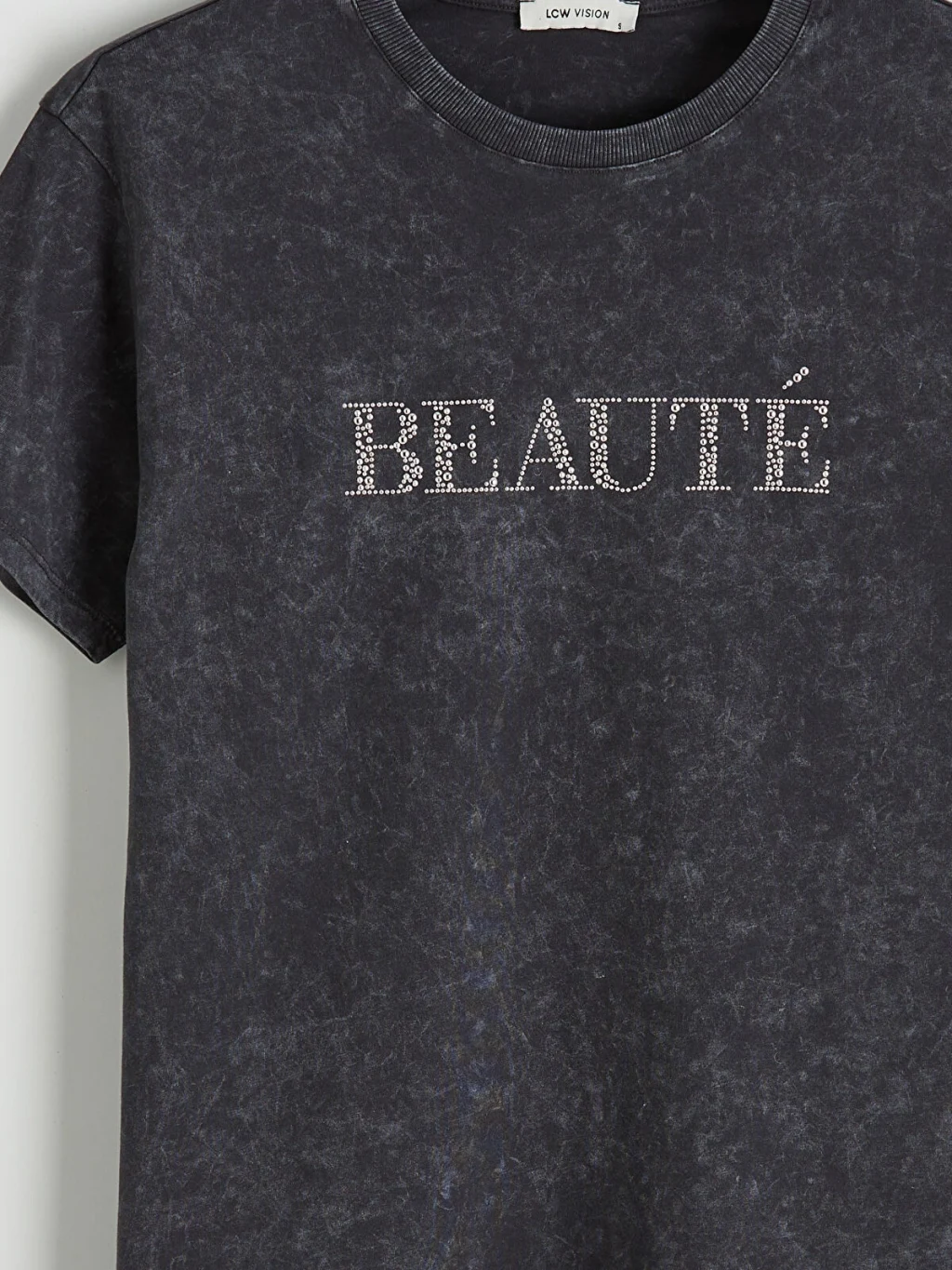 Bisiklet yaka ve kısa kollu kadın tişört, %100 pamuk kumaştan üretilmiştir ve önü taş işlemeli yazı baskılıdır.