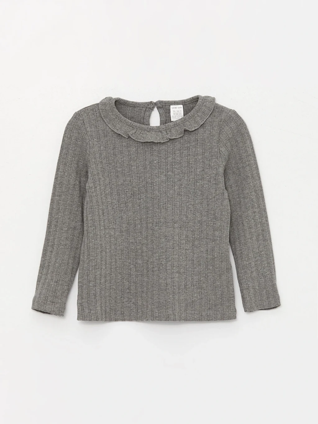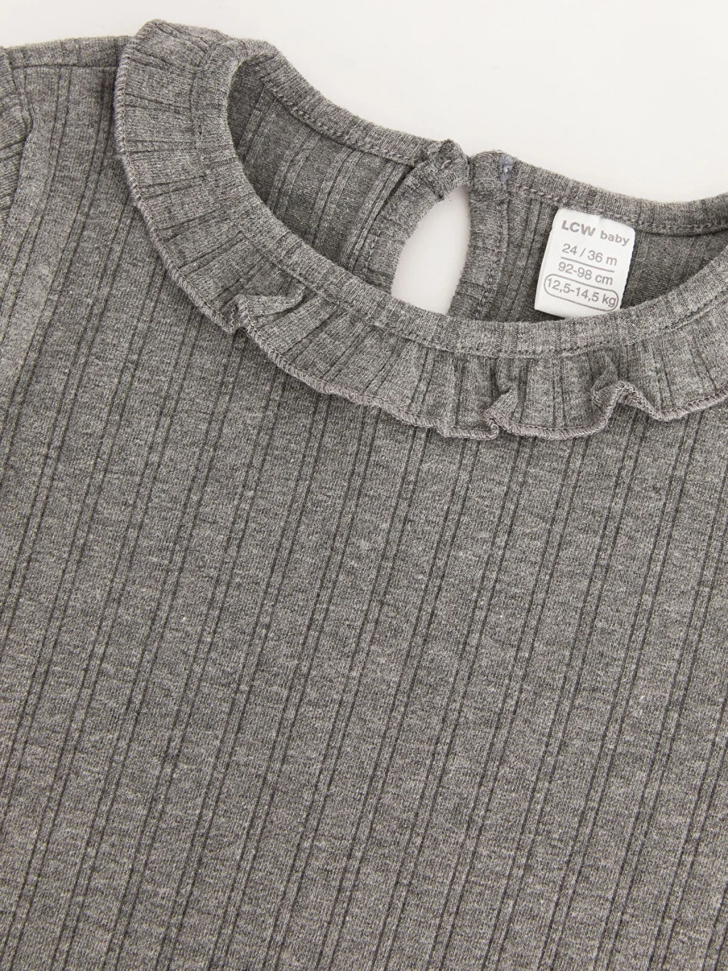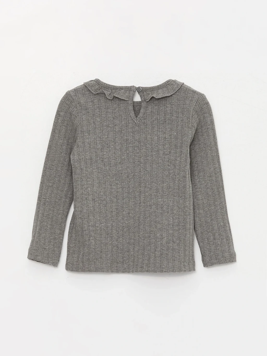 Dar kalıp, fırfırlı bebe yakalı kız çocuk tişört, uzun kolludur. Fitilli penye kumaştan üretilmiştir ve enseden düğme kapamalıdır.