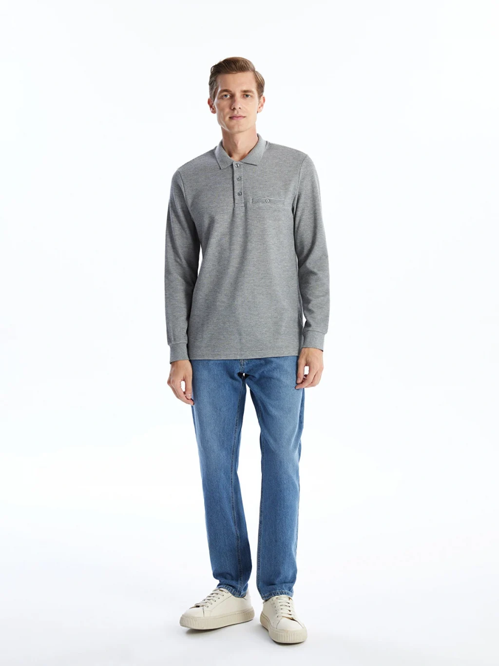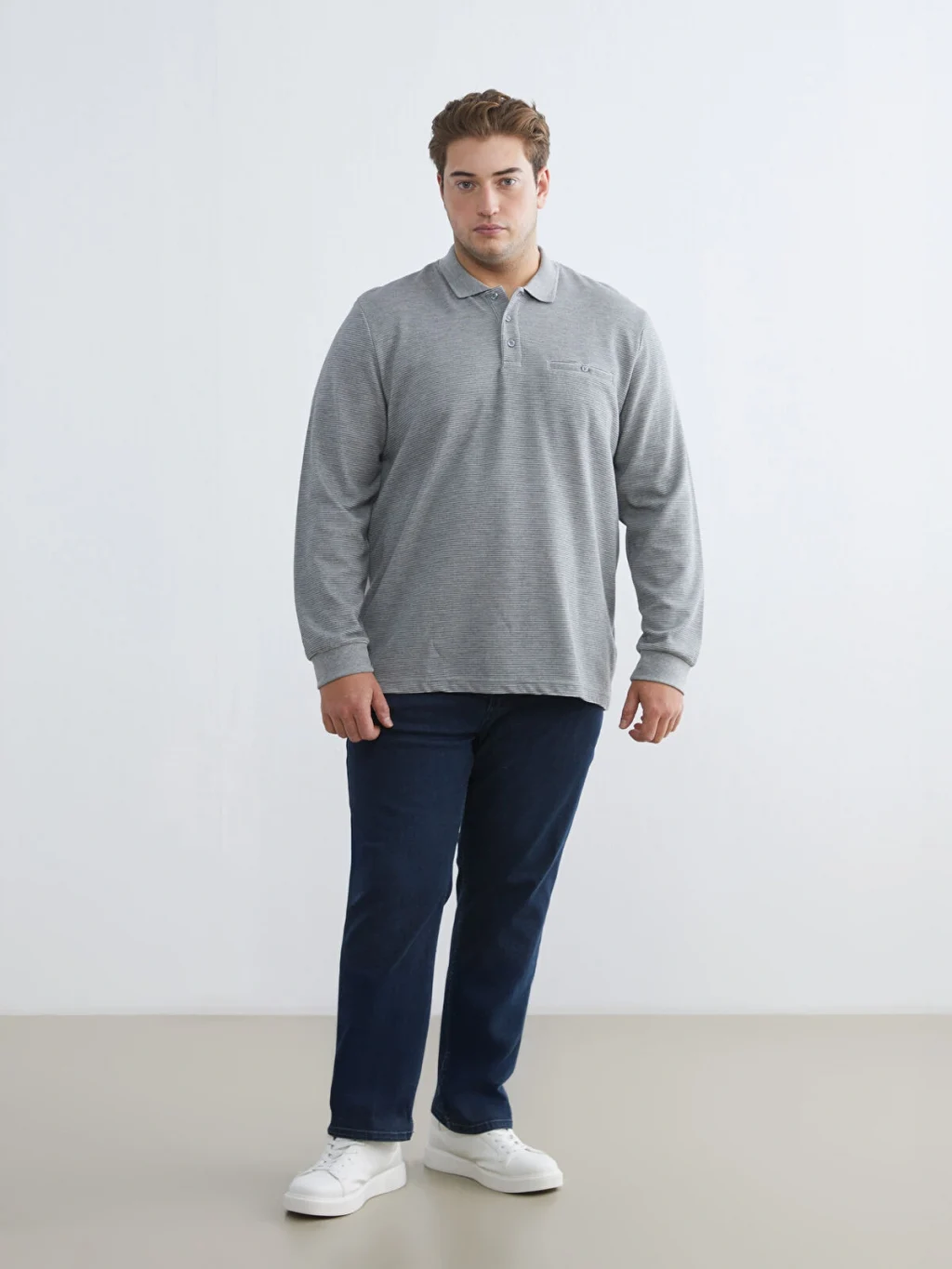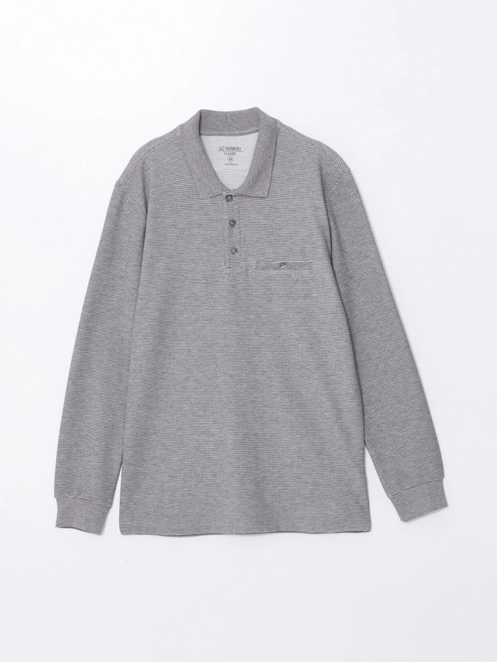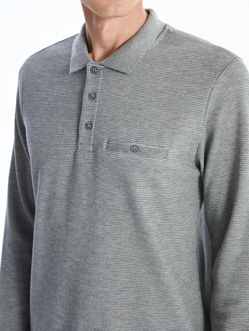 Polo yakalı, uzun kollu erkek sweatshirt, strüktürlü ve çizgili kumaştan üretilmiştir. Düğme kapamalıdır ve göğsünde tek cep detayı bulunur.