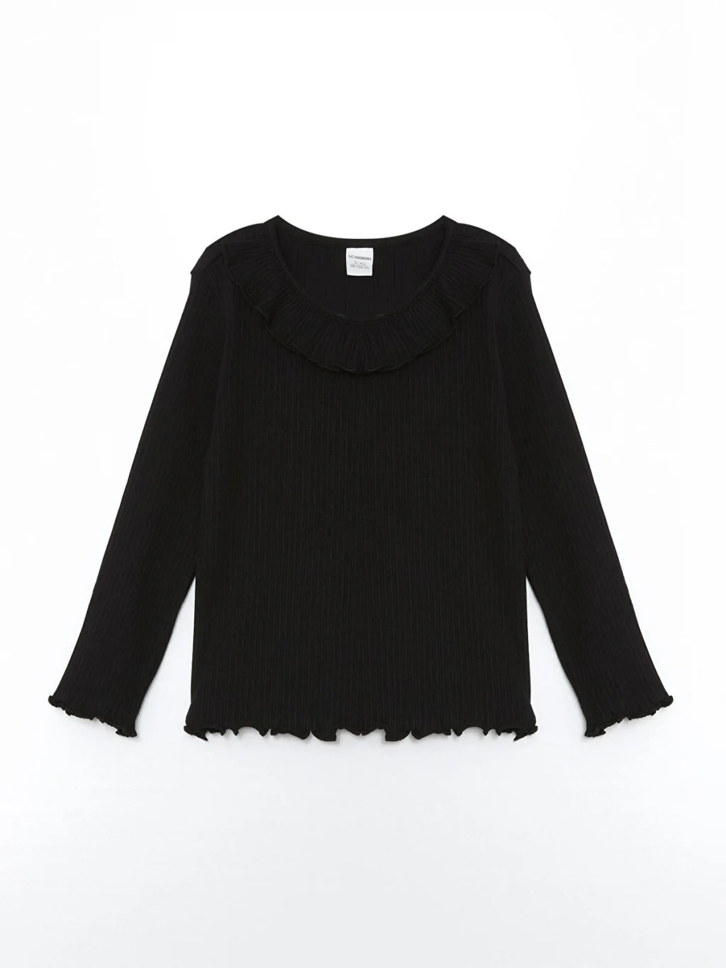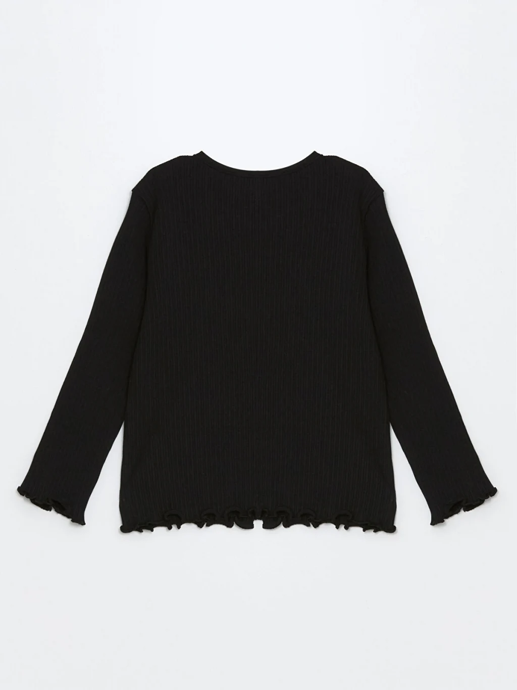 Dar kalıplı kız çocuk tişört, penye kumaştan üretilmiştir. Bisiklet yakası fırfır detaylı, uzun kollu olup kol ve etek uçları fırfırlıdır.