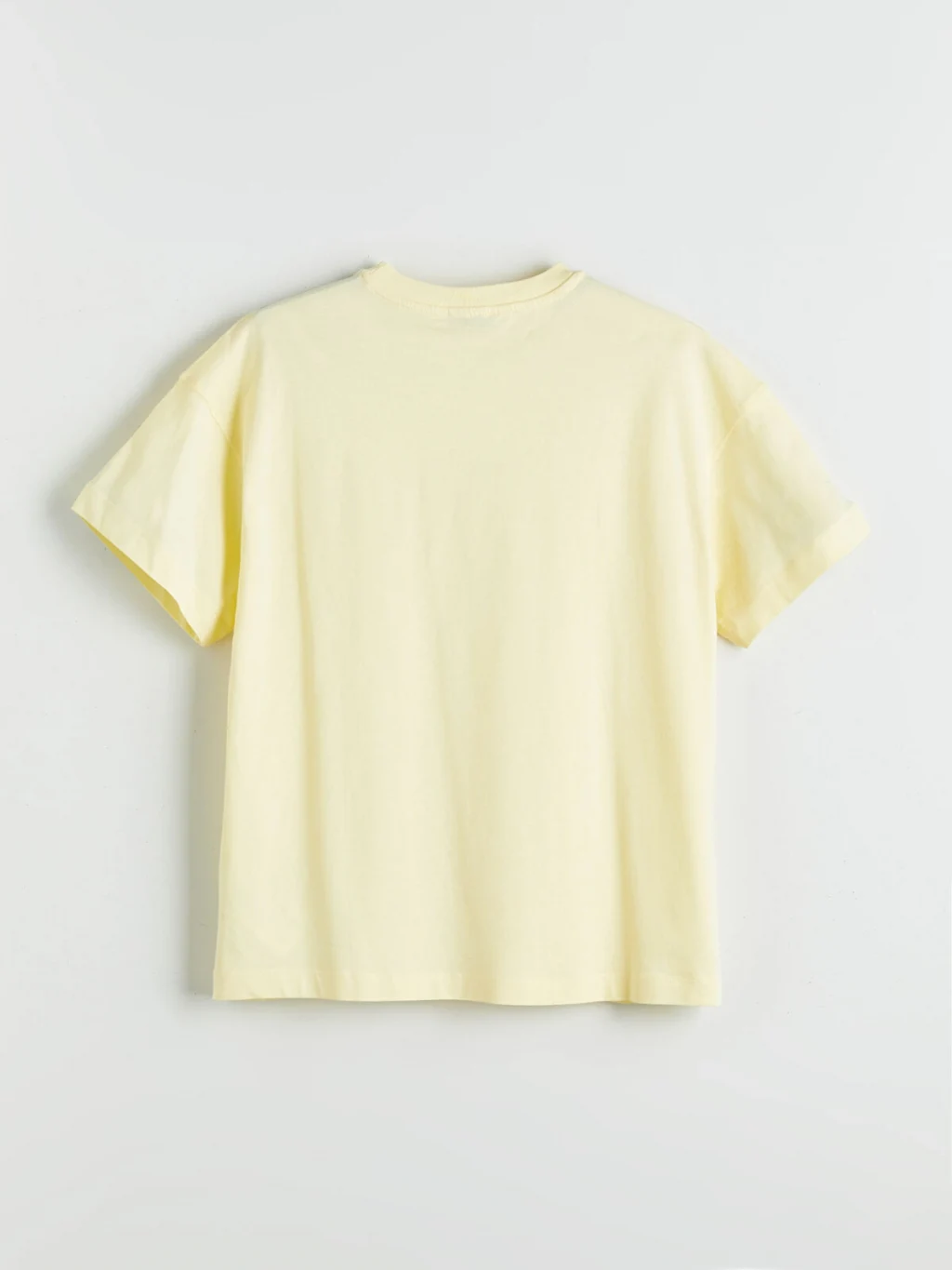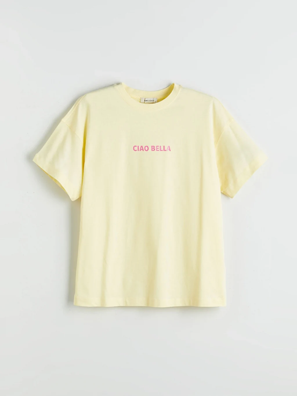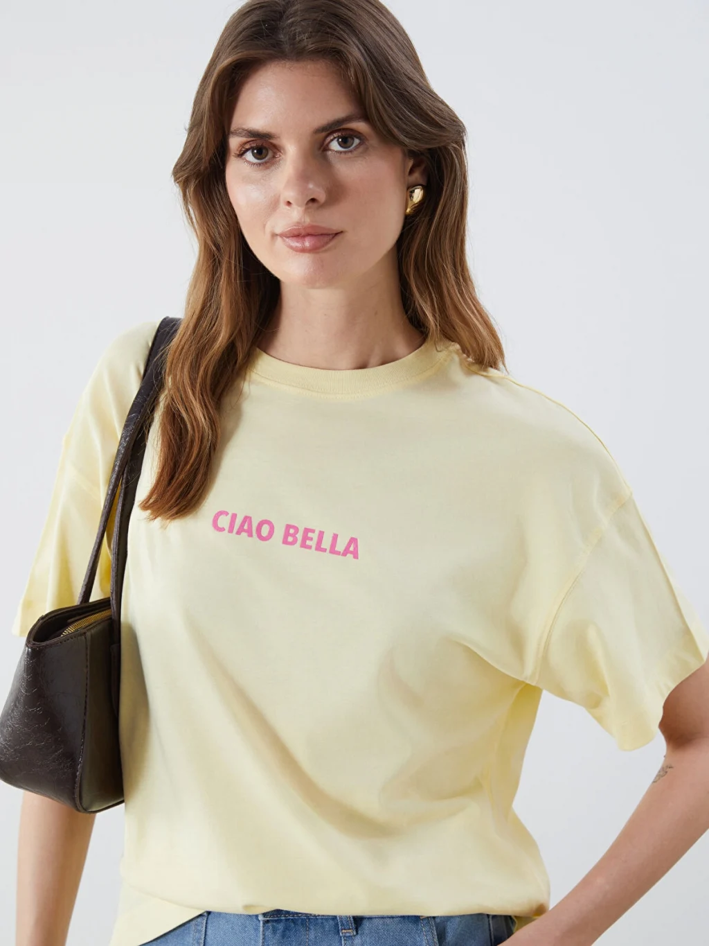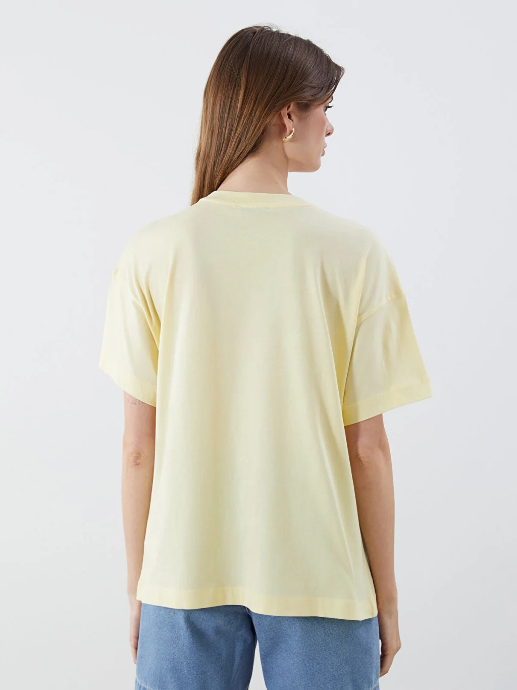 Bisiklet yaka, kısa kollu, oversize kalıplı kadın tişört, %100 pamuklu penye kumaştan üretilmiştir ve önü yazı baskılıdır.