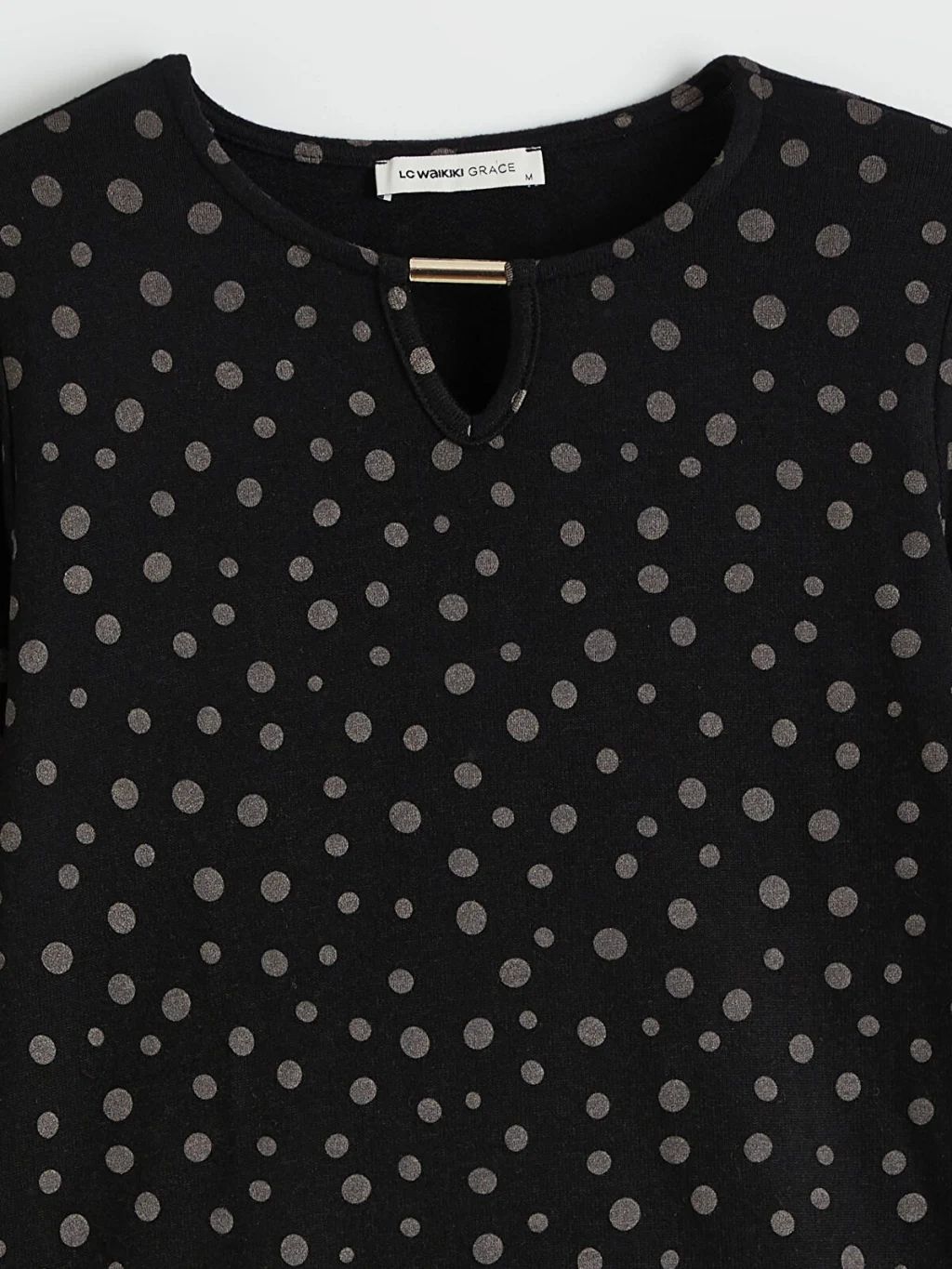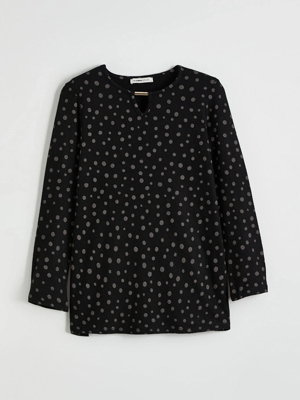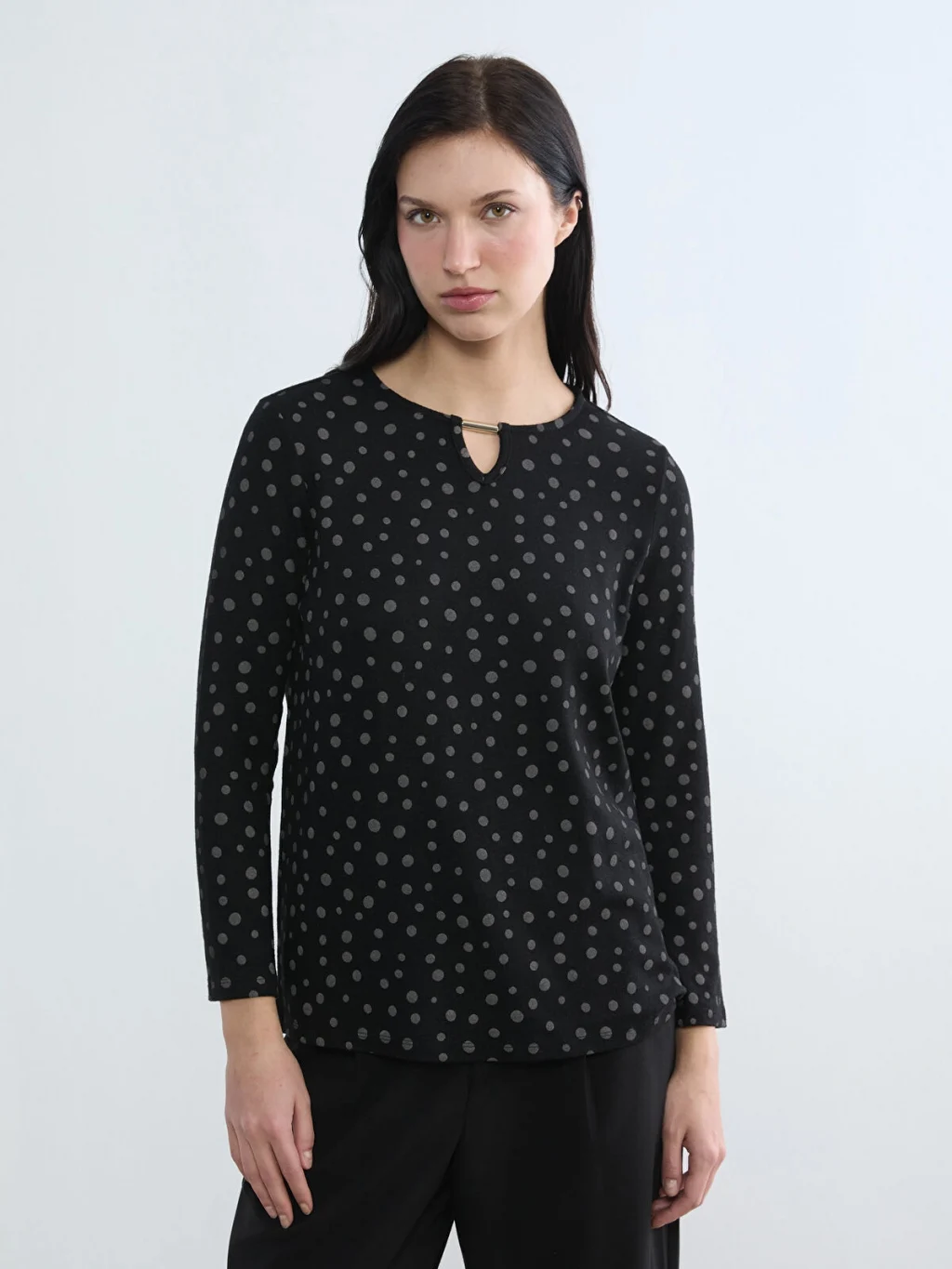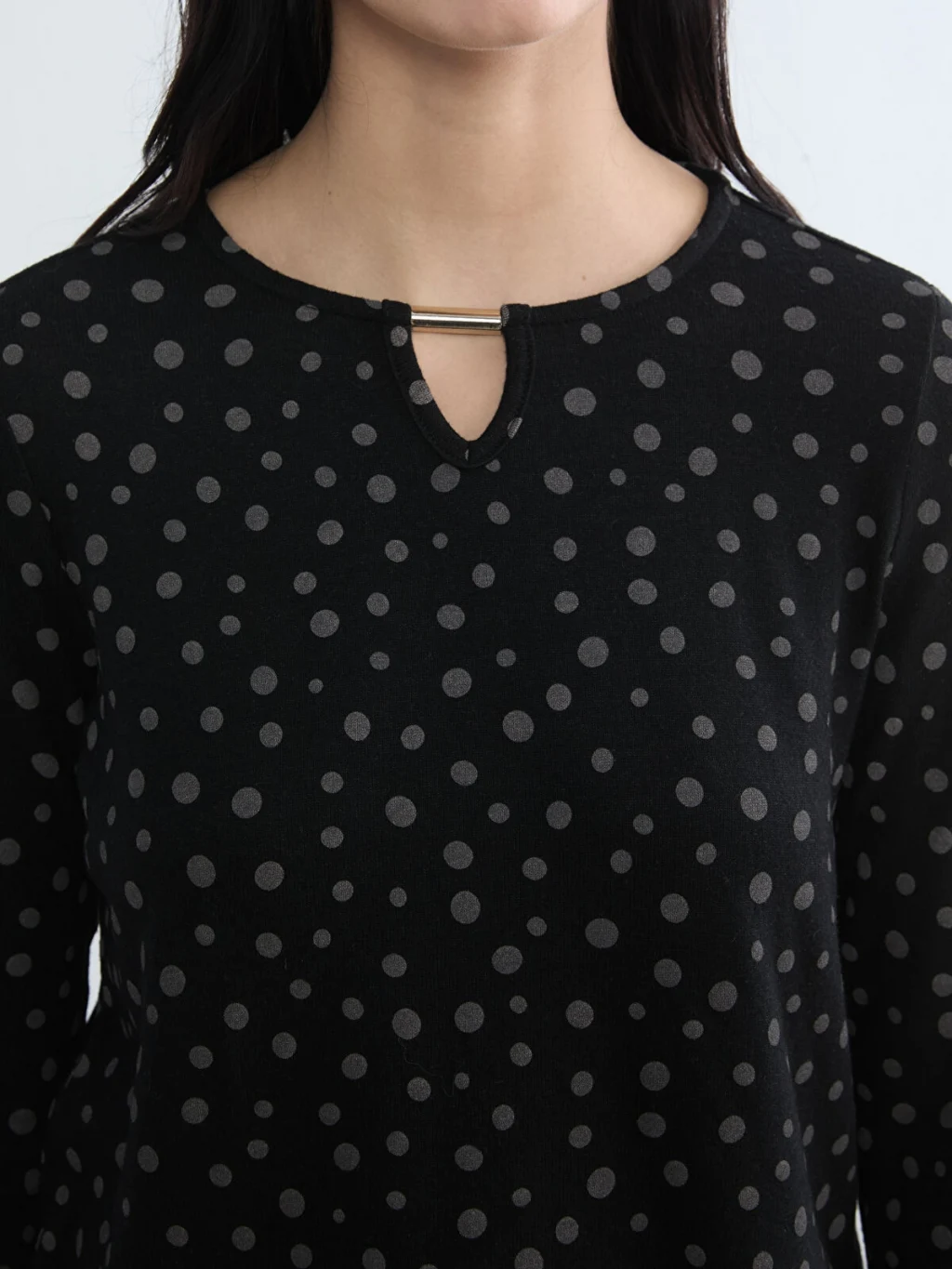 Bisiklet yaka kadın bluz, süprem kumaştan üretilmiştir. Yakası metal aplike detaylıdır.