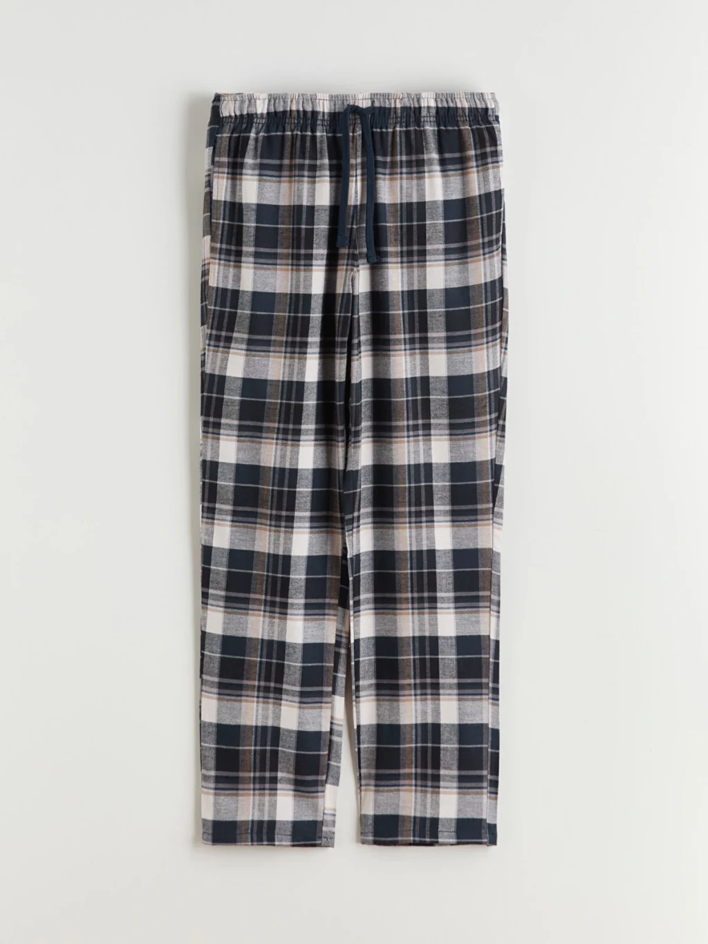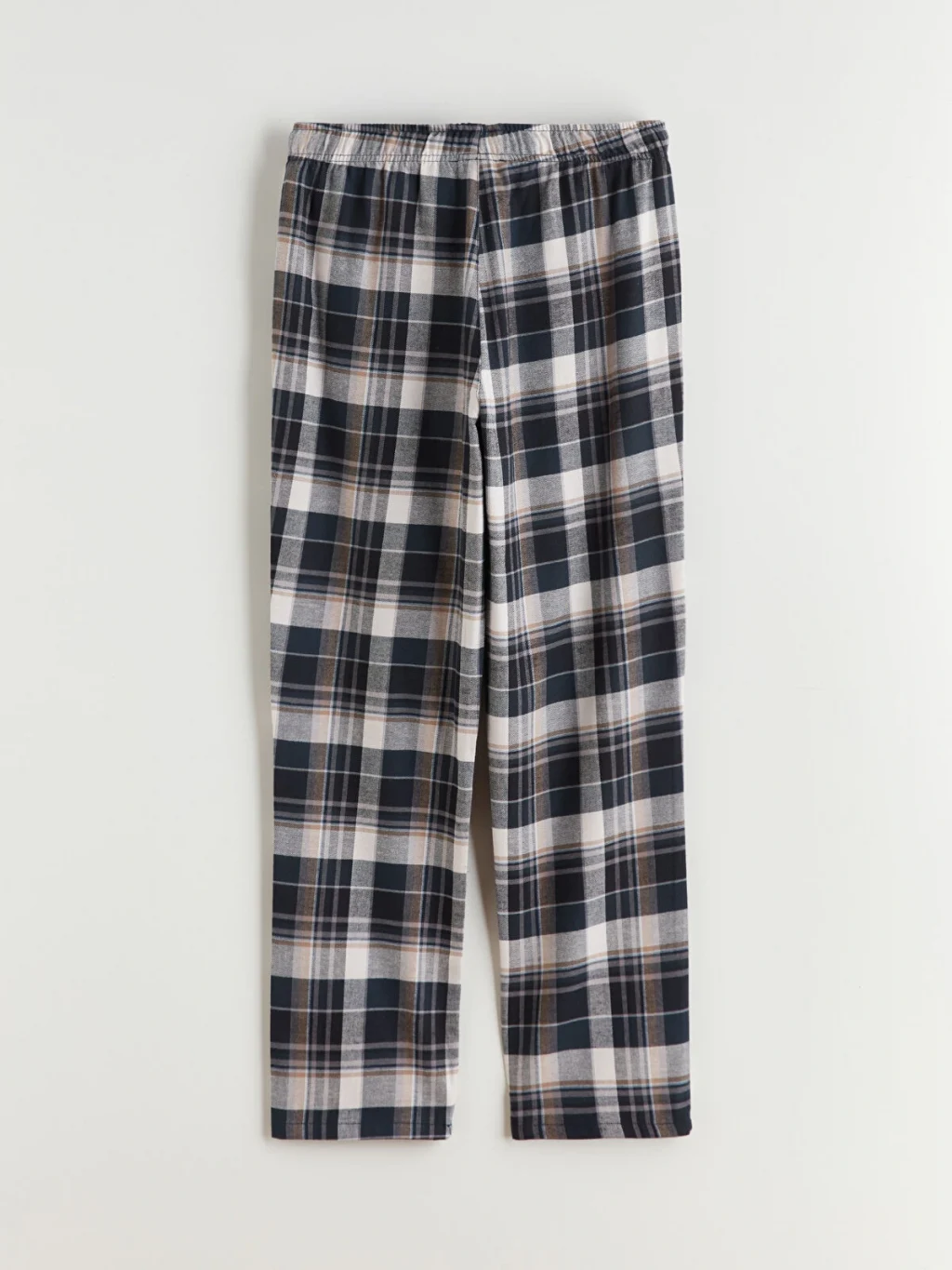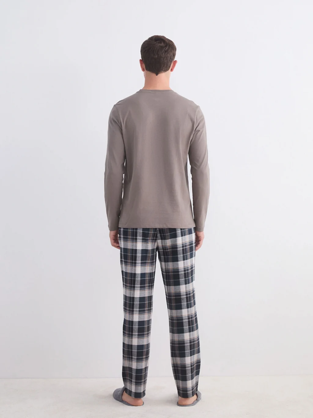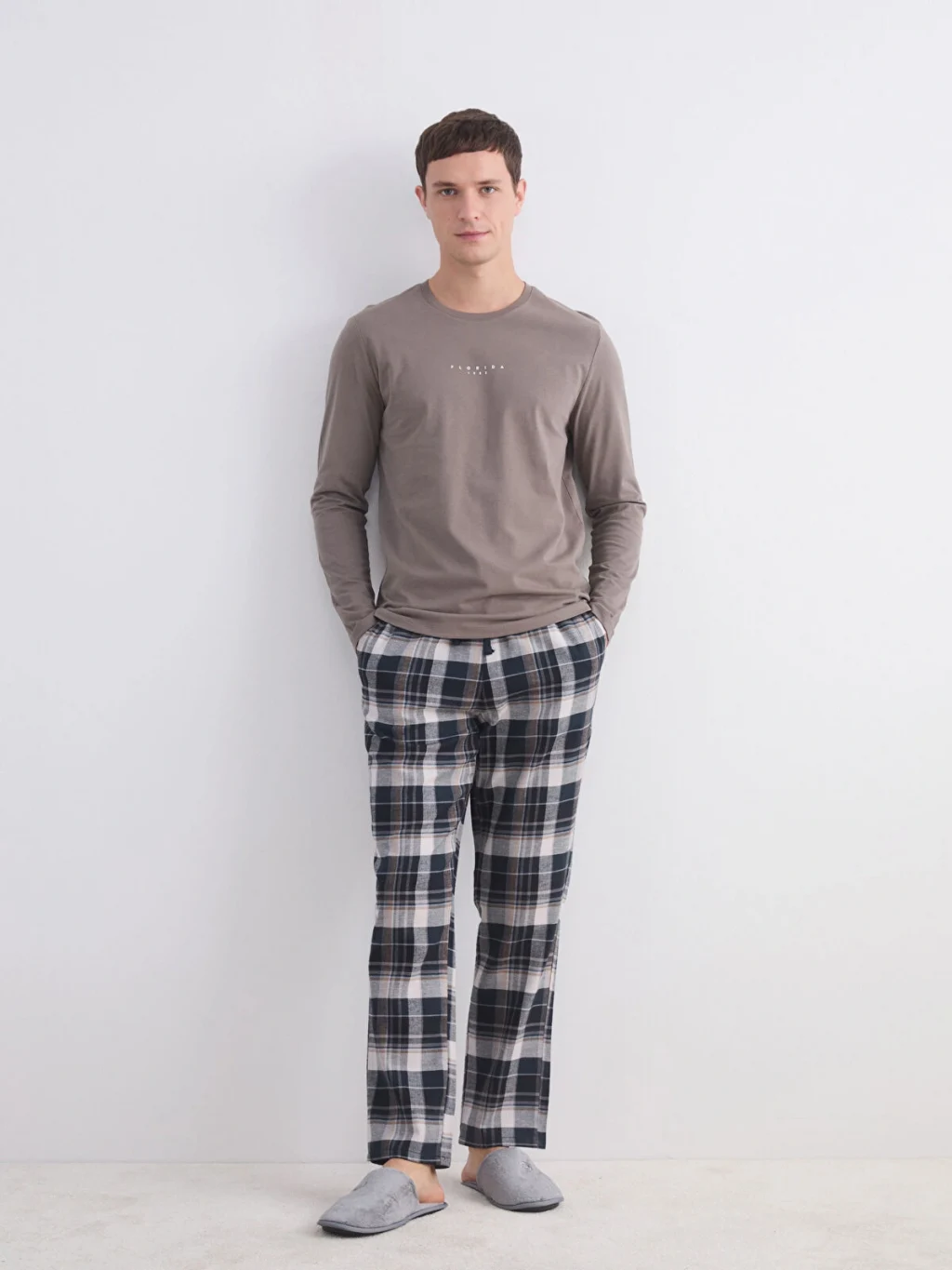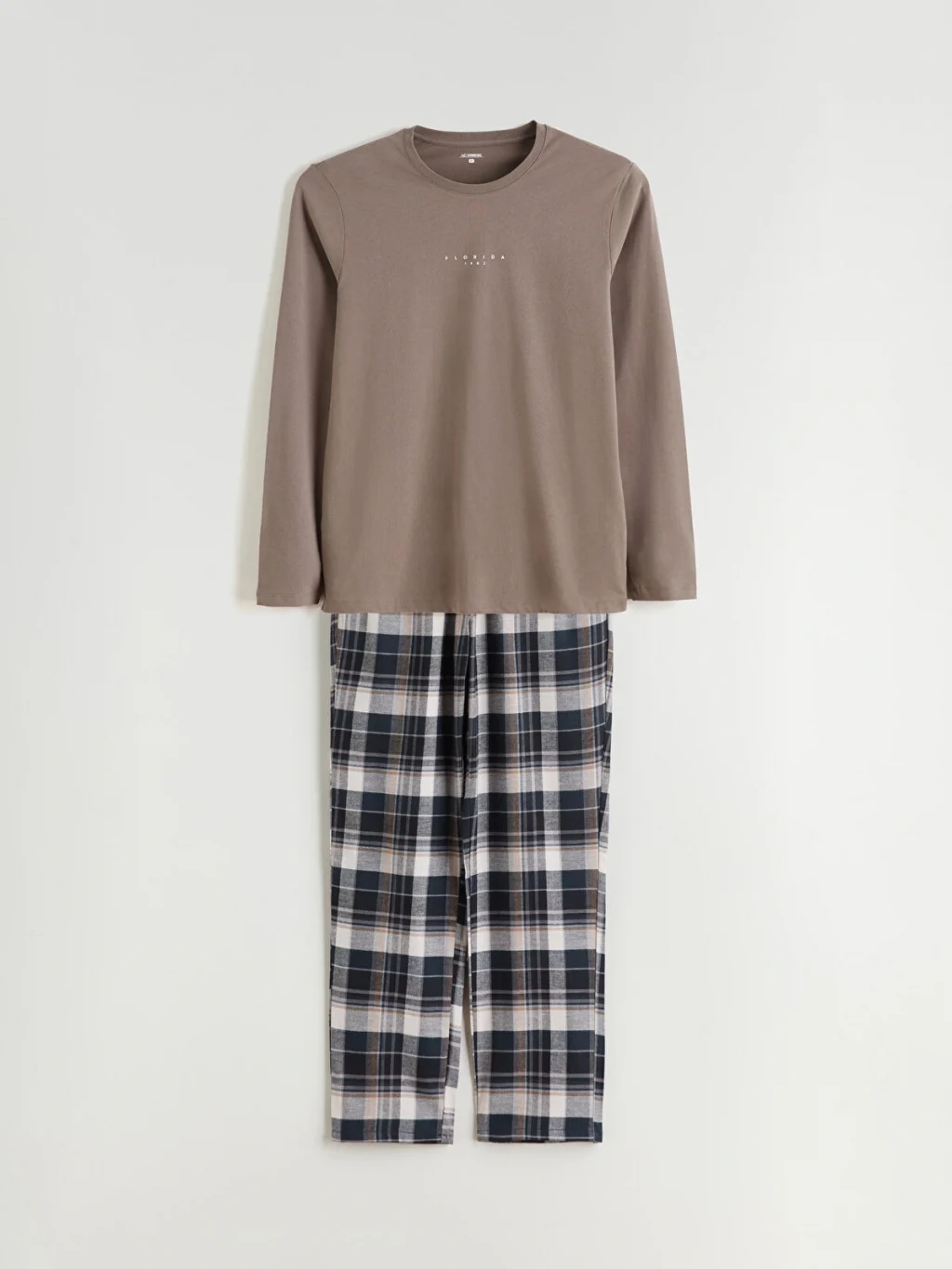 Erkek pijama takımı, bisiklet yaka ve uzun kollu bir üst ile ekose desenli flanel kumaştan üretilmiş uzun bir alttan oluşur.