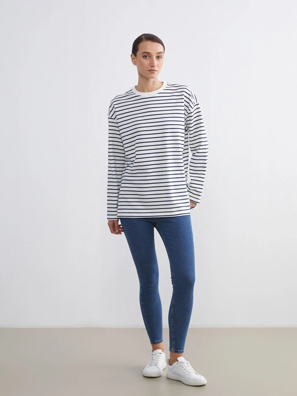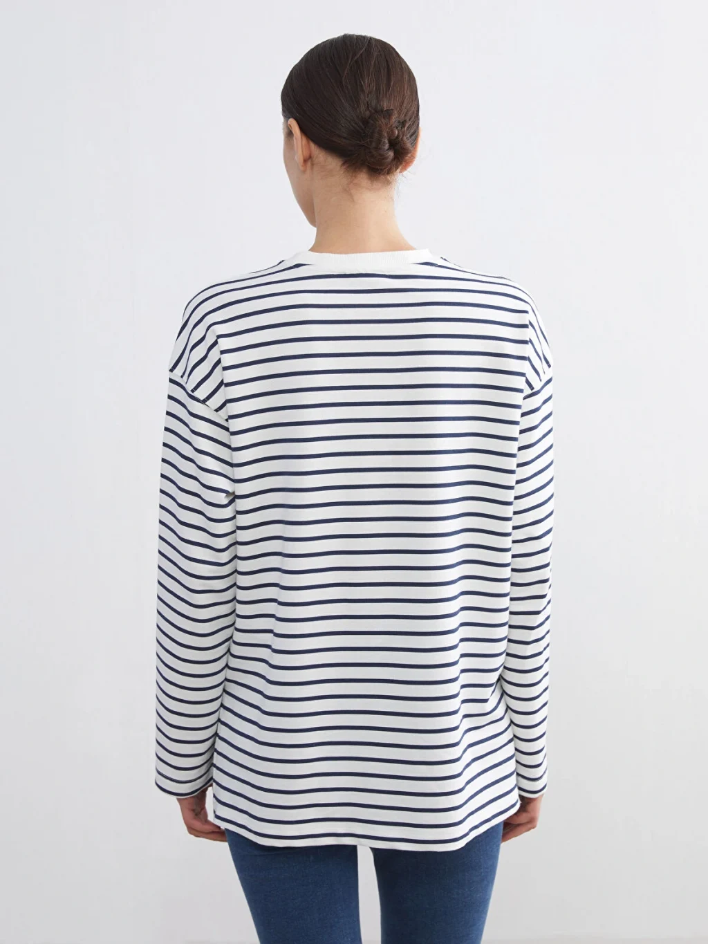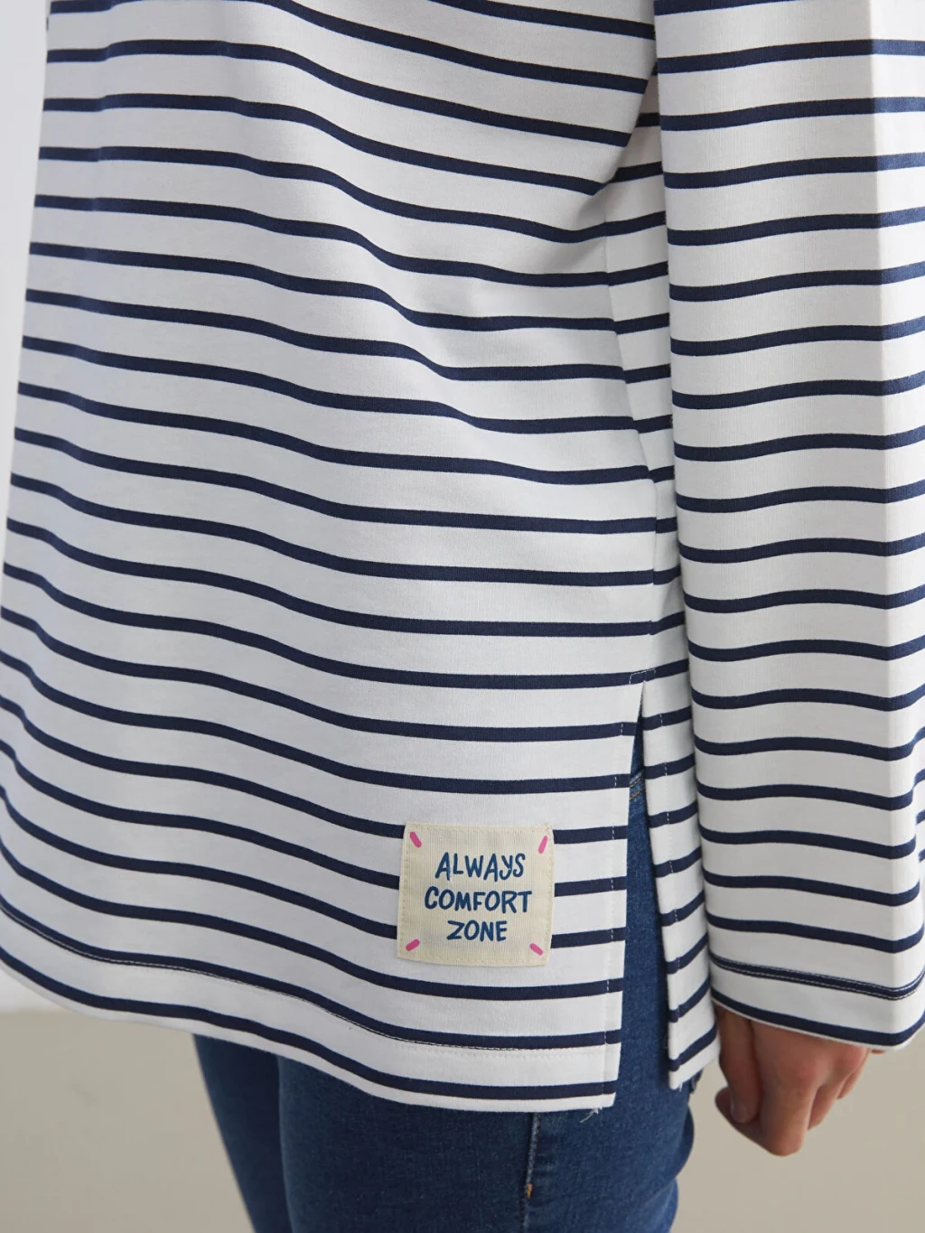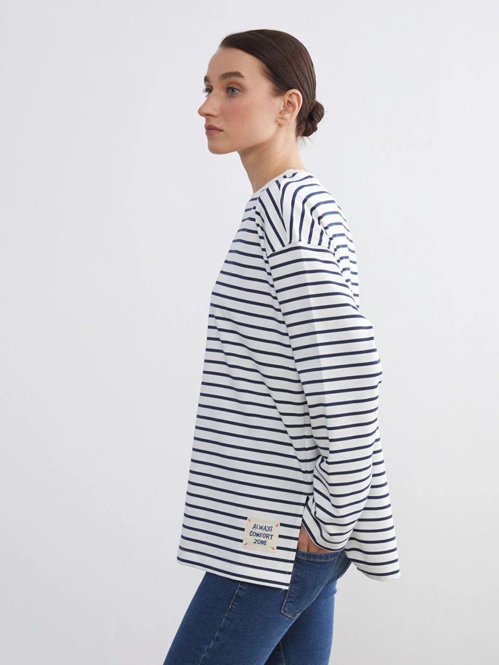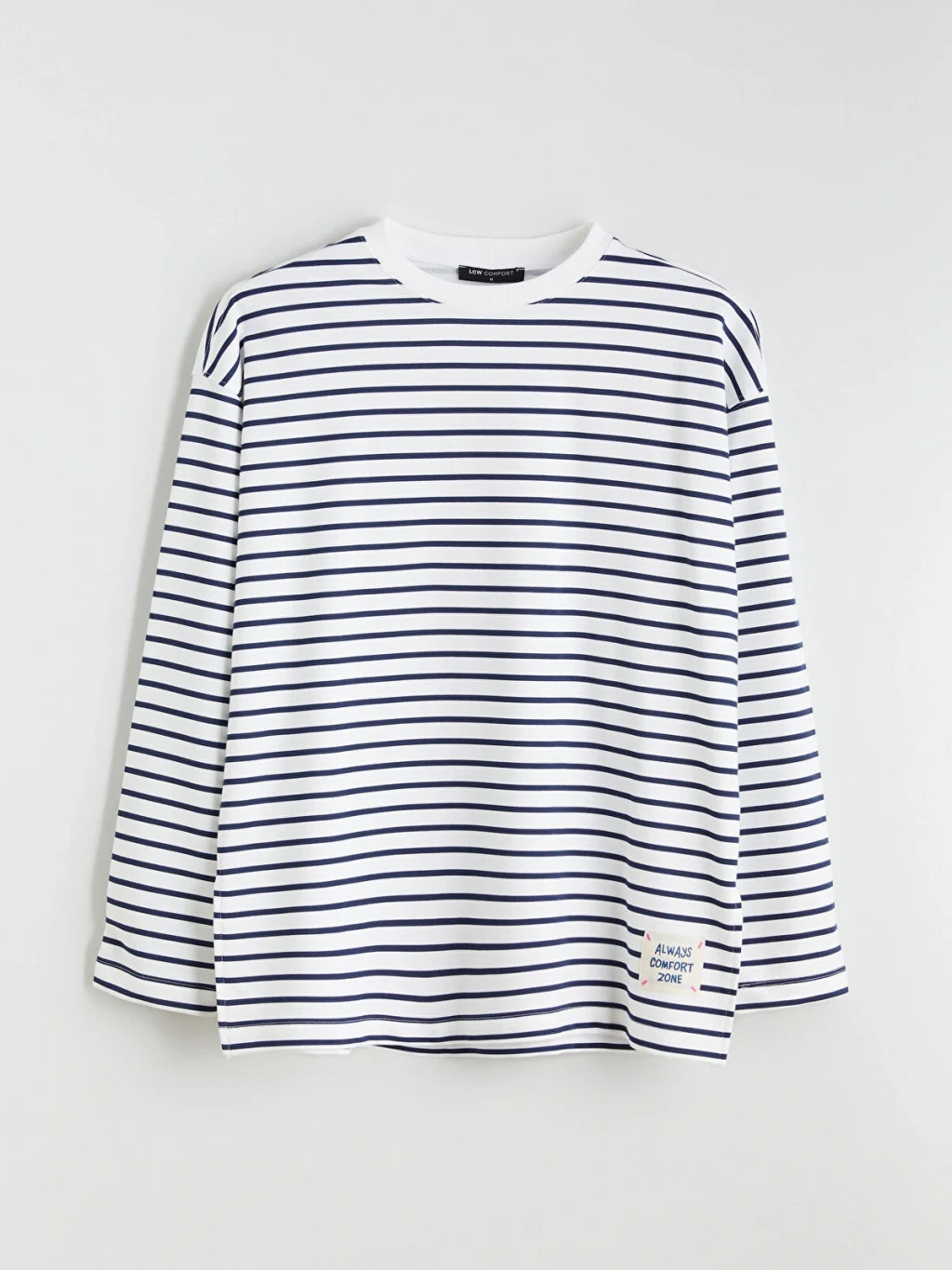 Hamile giyime uygundur. Hamilelikte ve sonrasında rahatça kullanabilirsiniz. Çizgili desenli, bisiklet yaka ve uzun kollu kadın sweatshirt, yüksek pamuk içerikli kumaştan üretilmiştir.