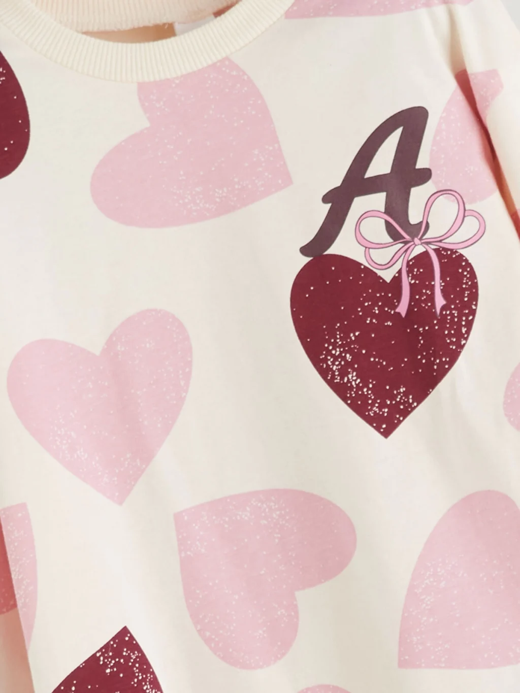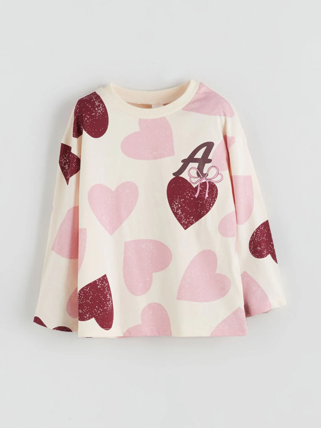 Kalp baskılı kız çocuk tişört, %100 pamuklu penye kumaştan üretilmiştir. Uzun kollu ve bisiklet yaka tasarıma sahiptir.