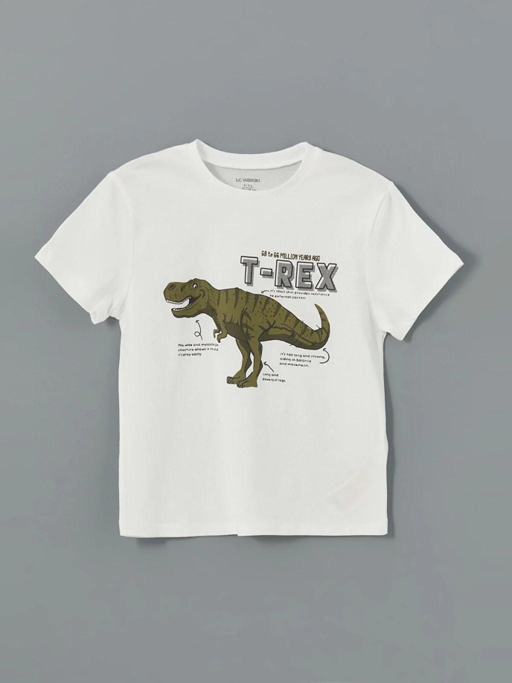 Bisiklet yaka ve kısa kollu erkek çocuk tişört, %100 pamuklu penye kumaştan üretilmiştir. Önü dinozor baskılıdır.