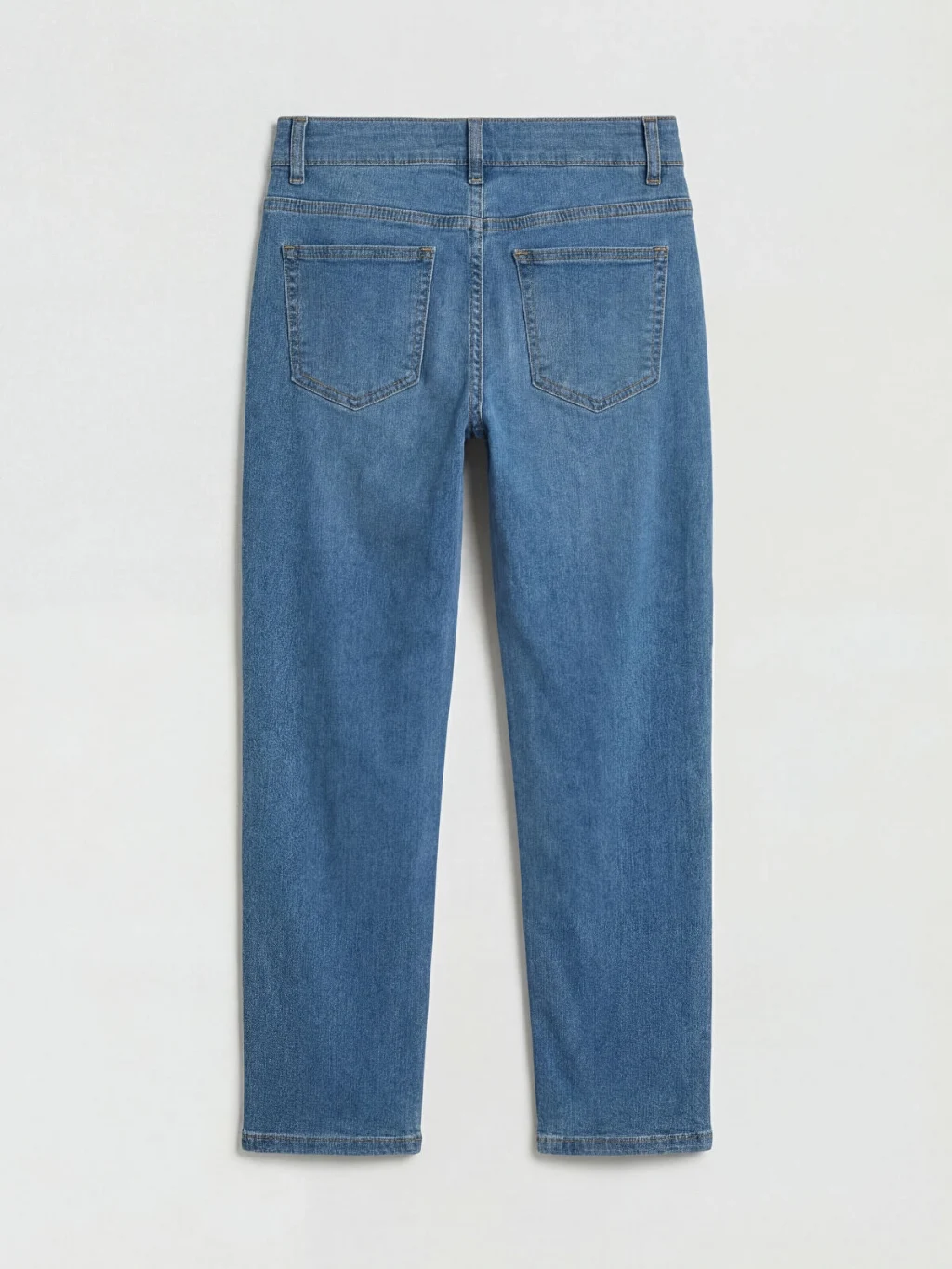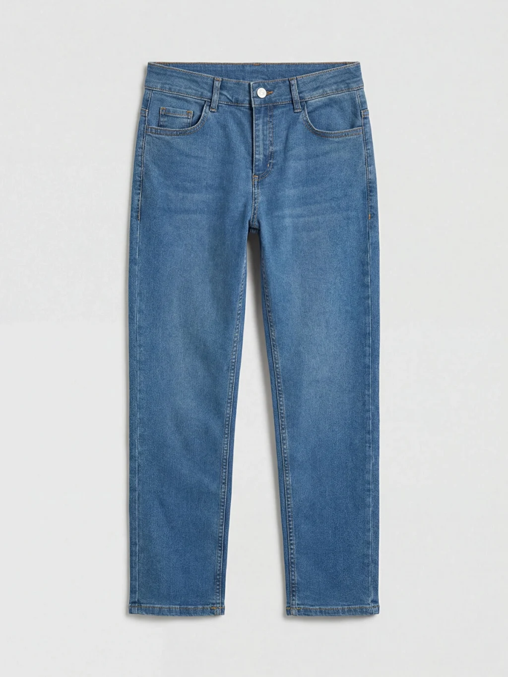 Dar kesimli erkek çocuk jean pantolon, pamuklu denim kumaştan üretilmiştir. Beş cepli tasarıma sahiptir ve fermuar ile düğme kapamalıdır.