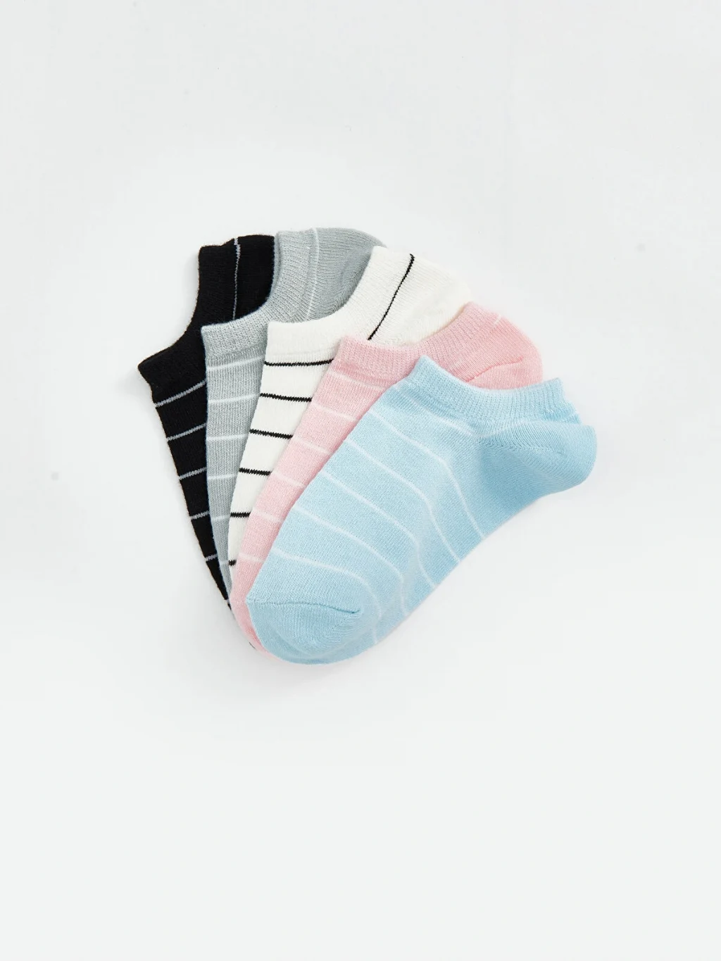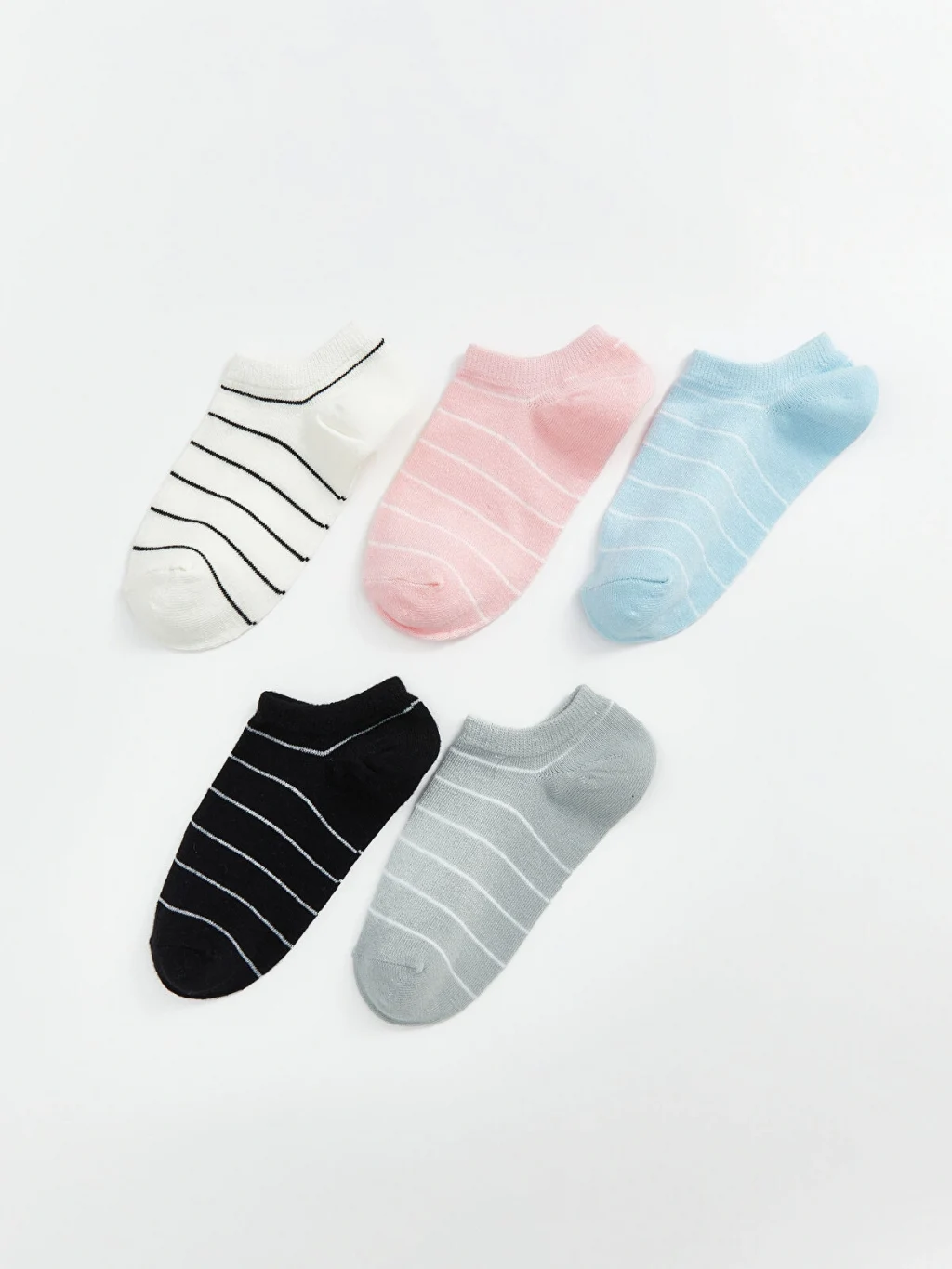 Çizgili desene sahip kadın sneaker çorapları. Bilek boyu kesimli olup, birden fazla çift içeren paket halindedir.