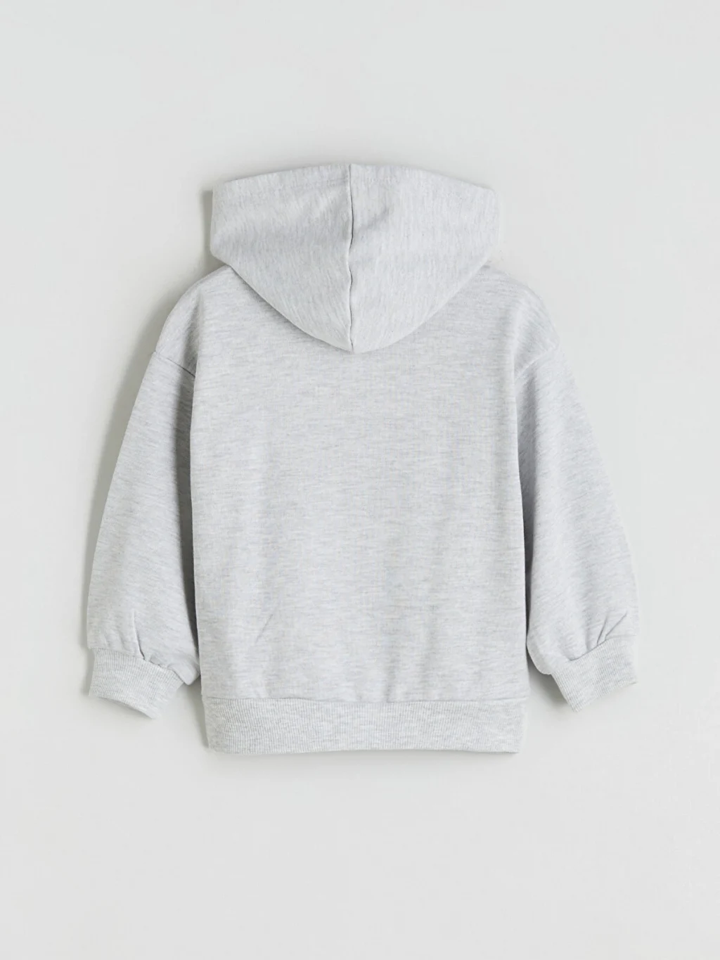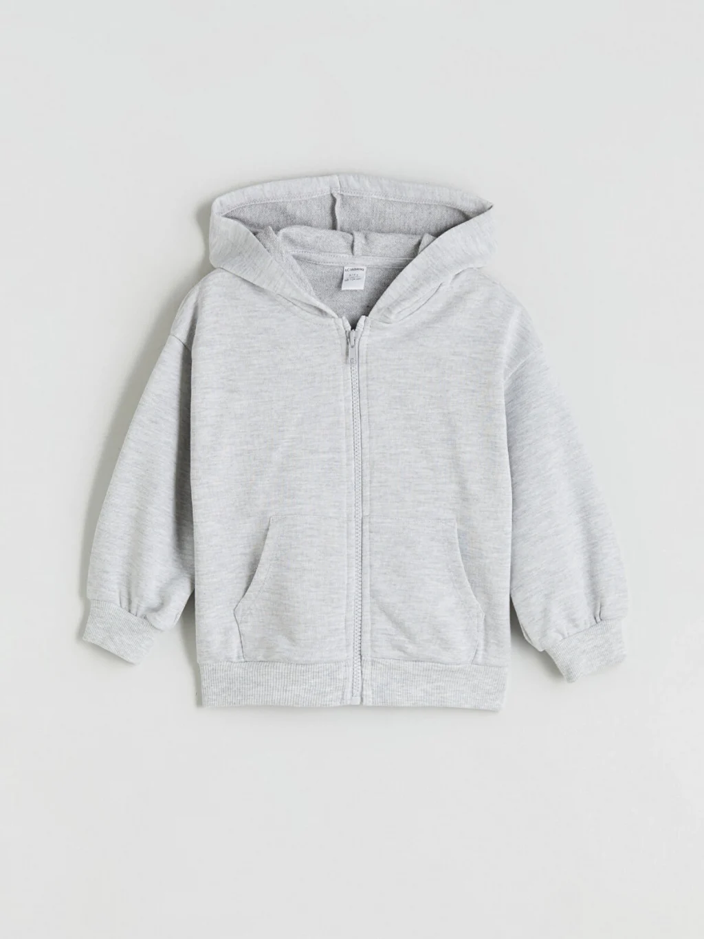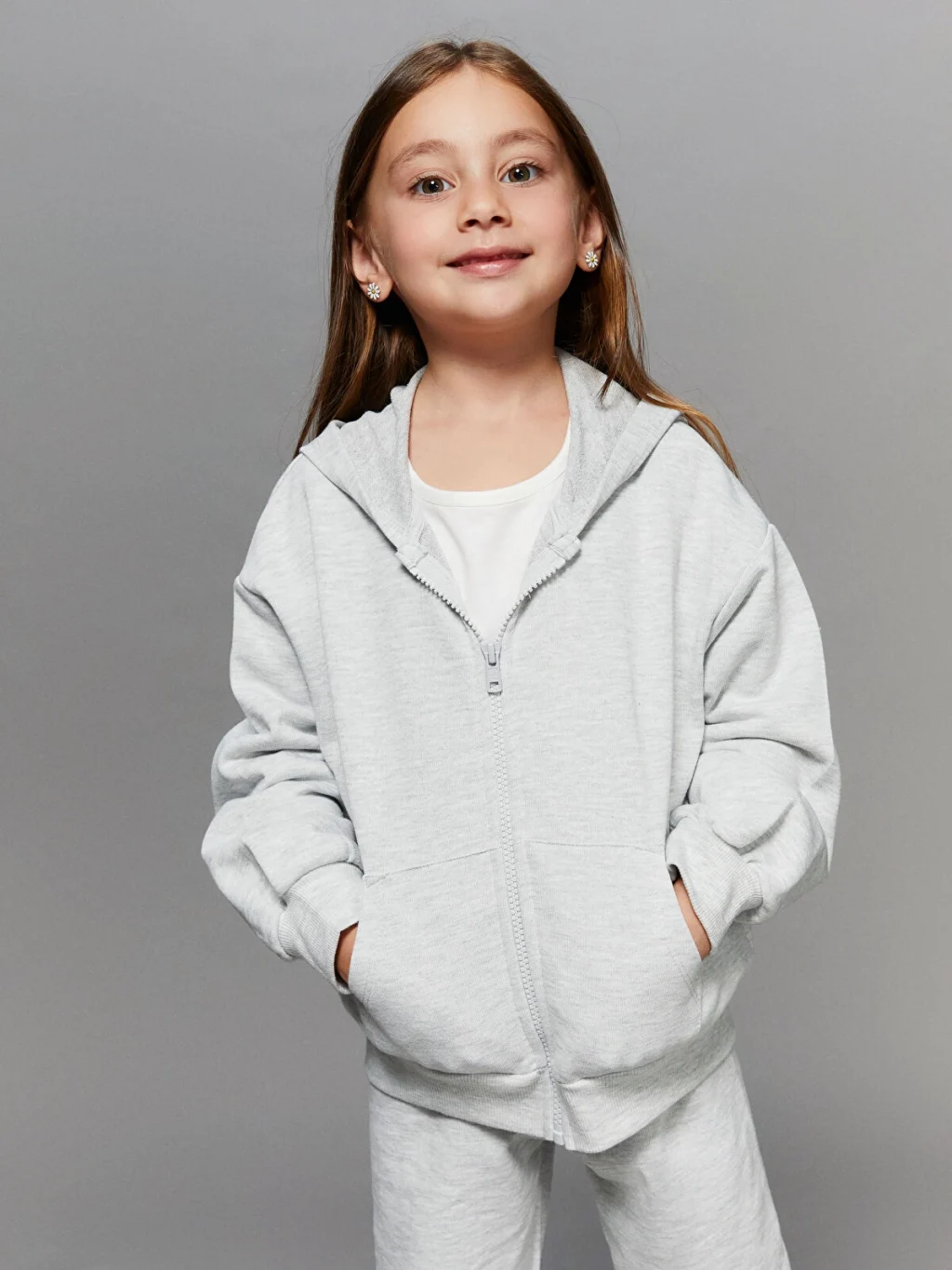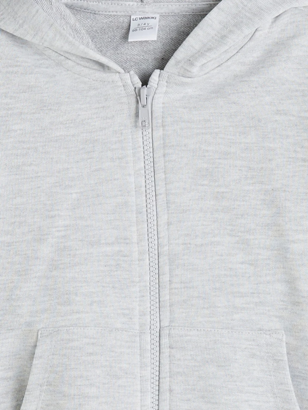 Unisex çocuk kapüşonlu, fermuar kapamalı sweatshirt, uzun kollu ve kanga ceplidir. Kalın, 3 iplik şardonlu kumaştan üretilmiştir.